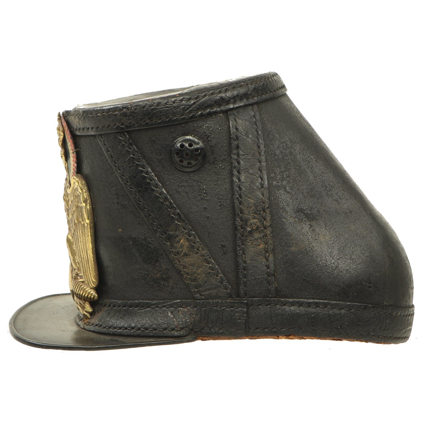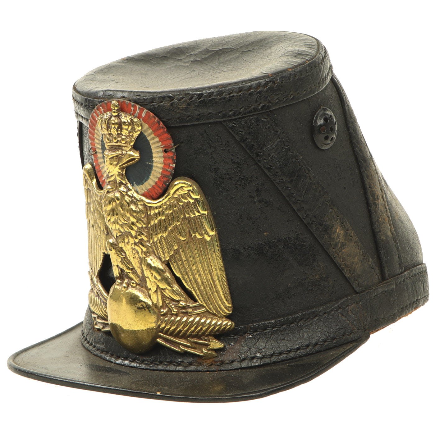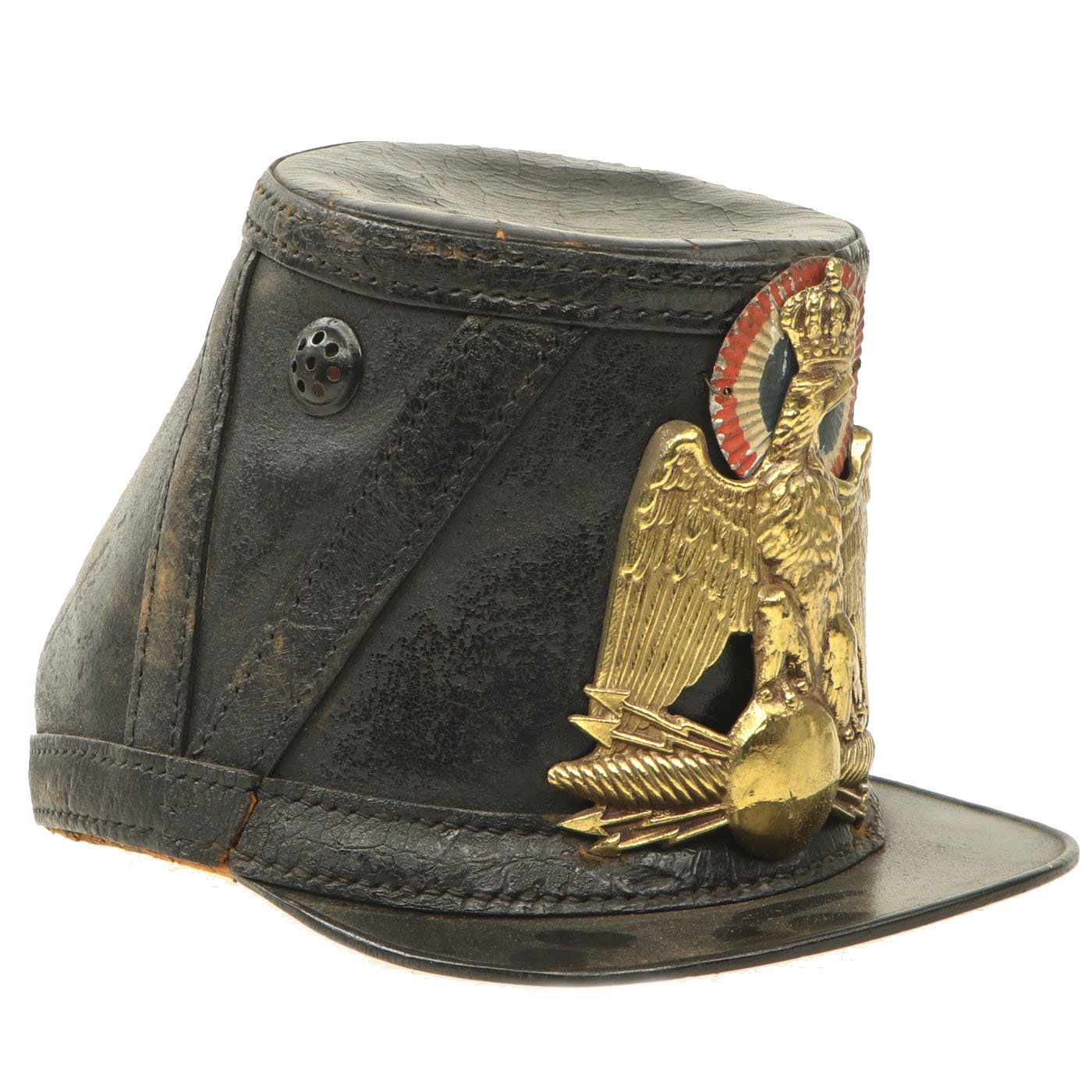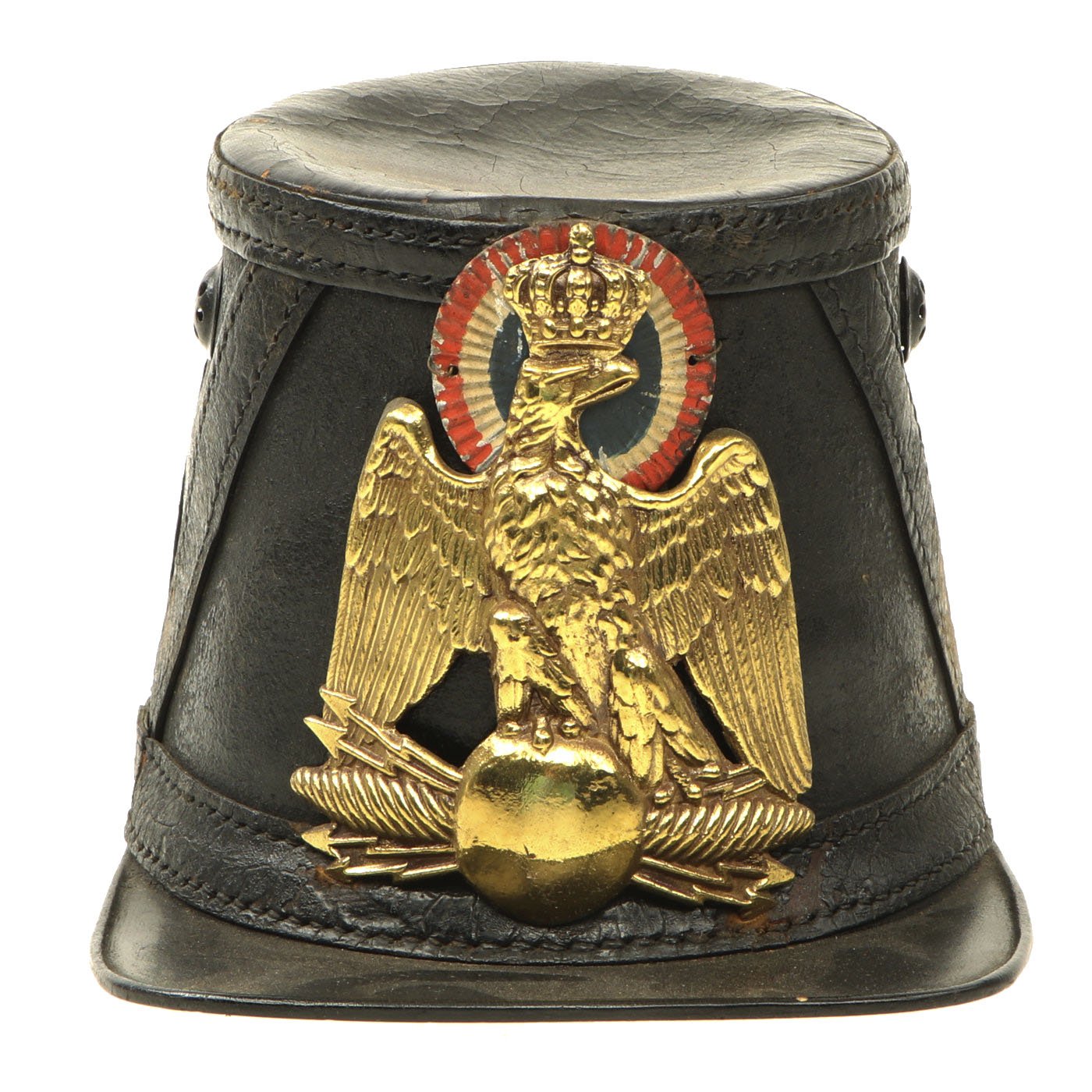 Original Item: Only One Available. This is a very nice example of a French Second Empire Model 1860 military shako, circa 1865. The body is constructed almost entirely of leather, and this is definitely for an enlisted soldier, and not an officer. The exterior is all black, with the correct 9 hole vents on either side. The front of the helmet has a French Crowned Imperial Eagle plate over the correct Tri-Color Cockade. The plume / pom-pom is unfortunately missing, which would be used to identify the unit that the soldier was a part of.