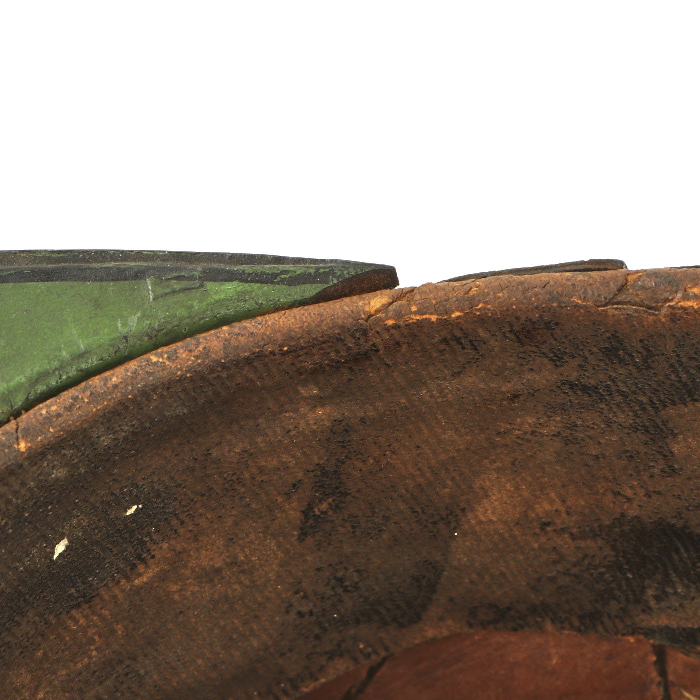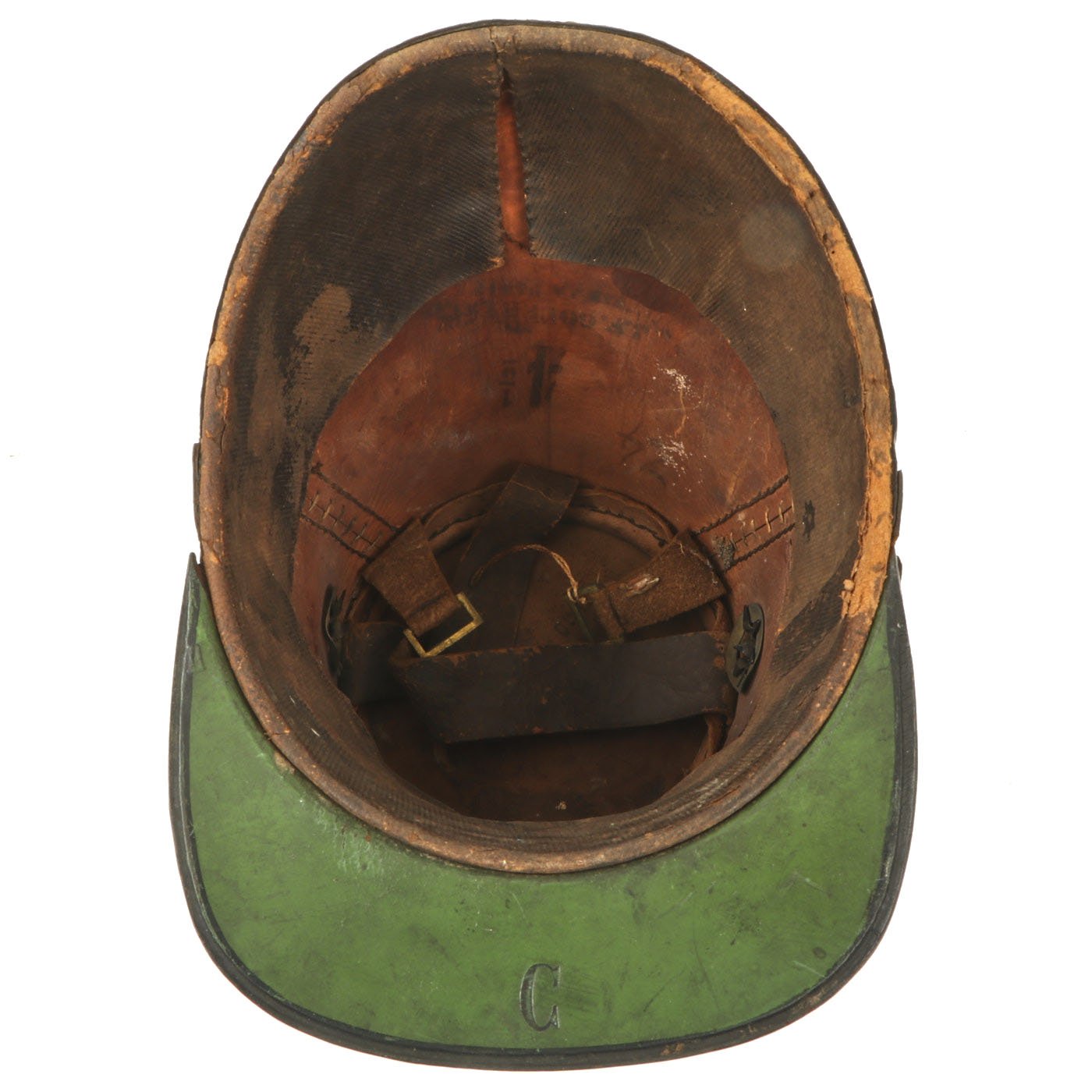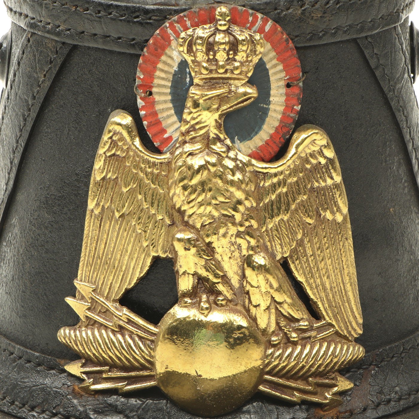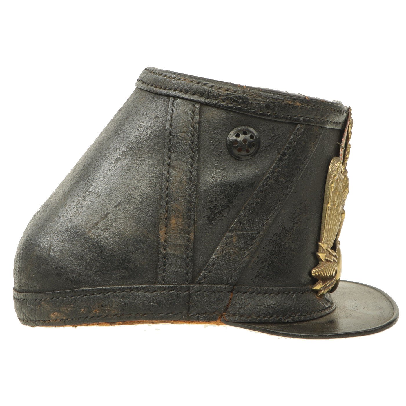 Original Item: Only One Available. This is a very nice example of a French Second Empire Model 1860 military shako, circa 1865. The body is constructed almost entirely of leather, and this is definitely for an enlisted soldier, and not an officer. The exterior is all black, with the correct 9 hole vents on either side. The front of the helmet has a French Crowned Imperial Eagle plate over the correct Tri-Color Cockade. The plume / pom-pom is unfortunately missing, which would be used to identify the unit that the soldier was a part of.