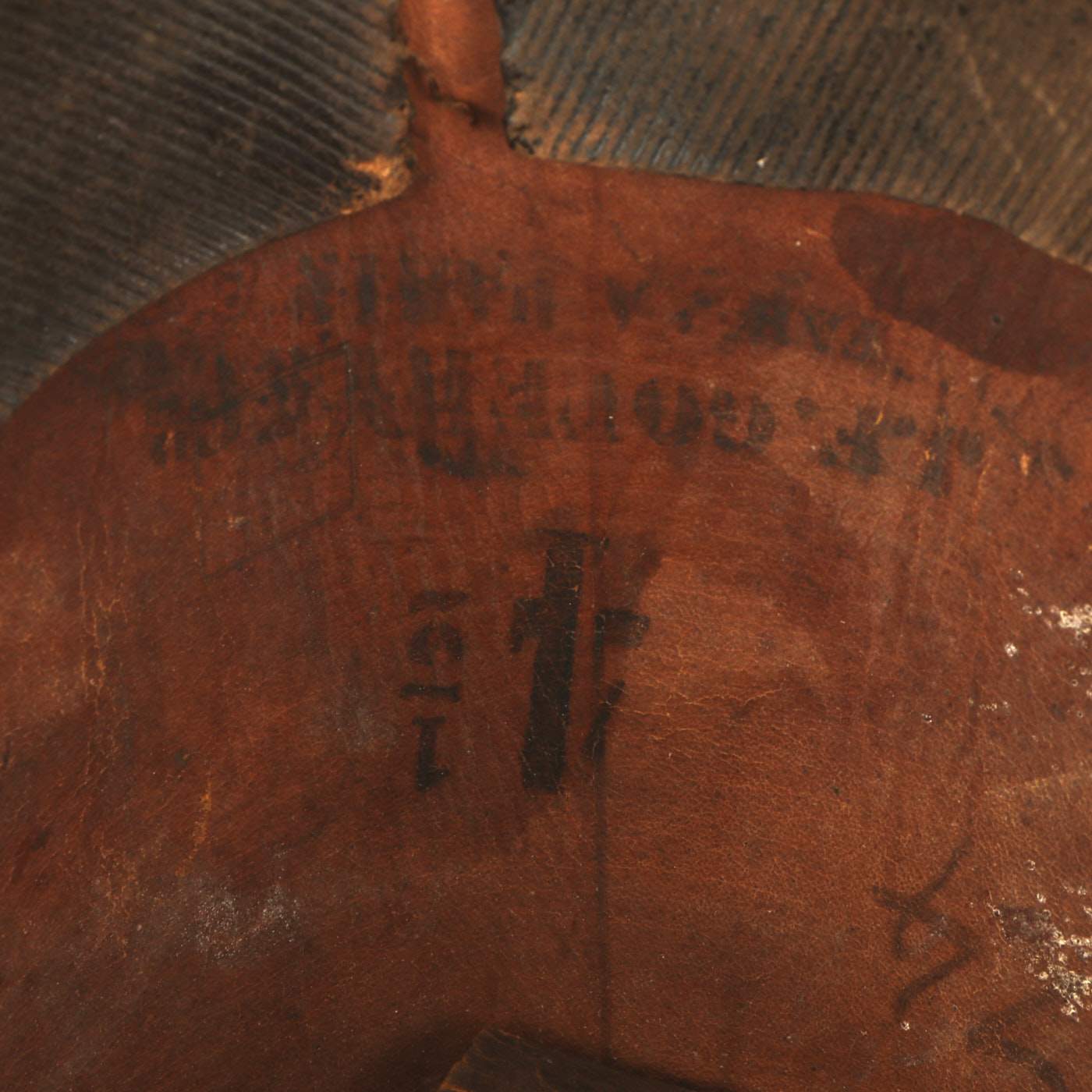 The interior of the shako is quite nice, with the original leather liner still present, and faded maker and arsenal markings ink stamped onto the leather body. The chin strap is missing, however the attachment straps on the top of the shako are still present.