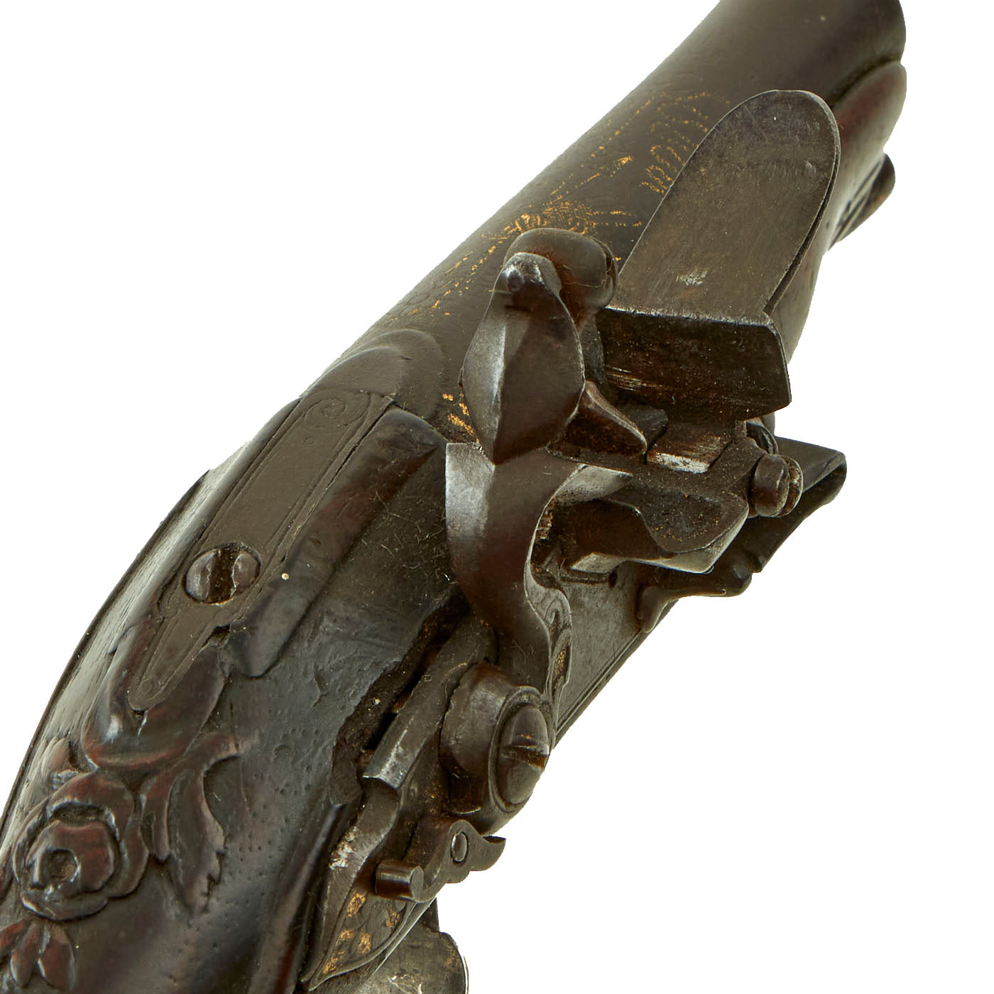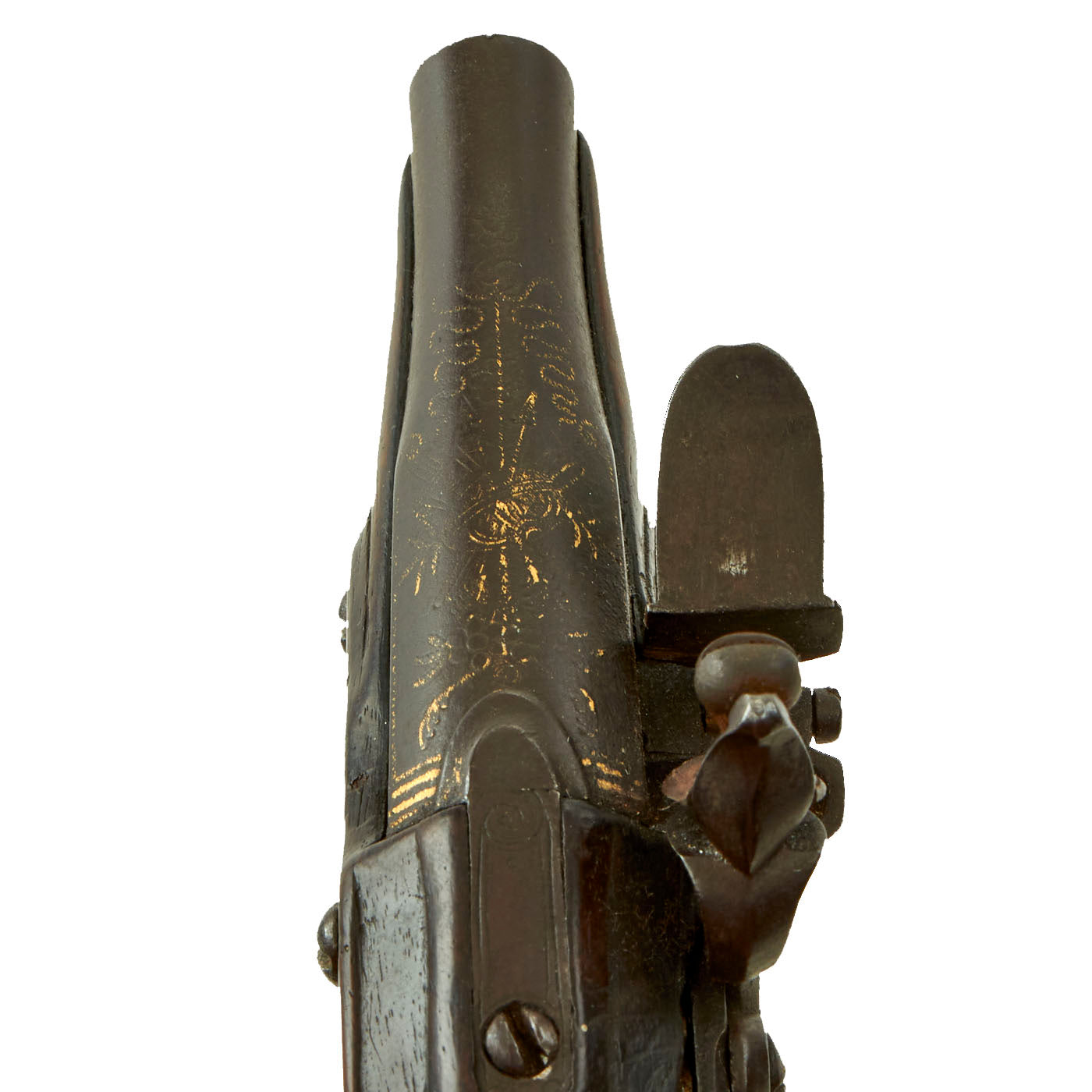 Typically French in design, the maker's name is no longer visible, possibly due to the wear to the gold inlay on the barrel. Gold inlay is also evident on the Cock and the rear of the lock plate. Lock is fitted with a small “Dog” Safety catch engaging the cock between half cock and full cock to allow safe carriage in a coat pocket whilst being fully loaded.