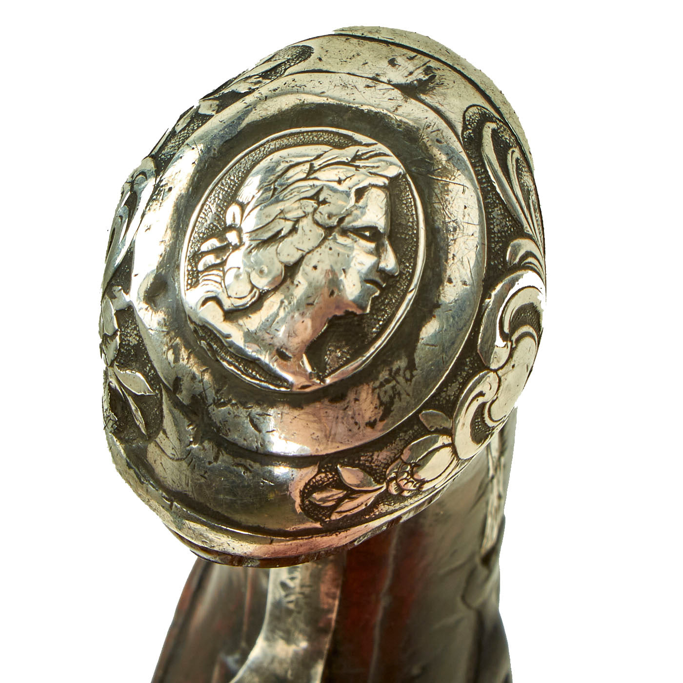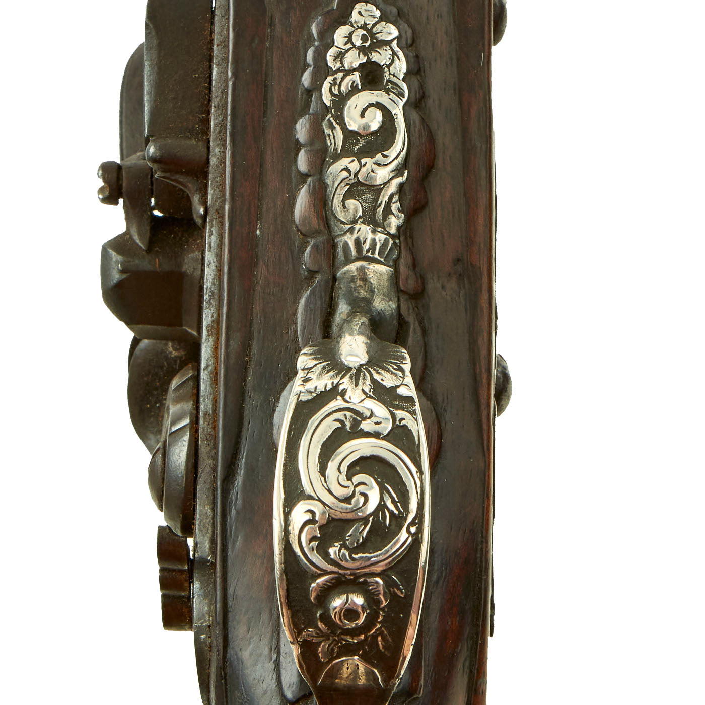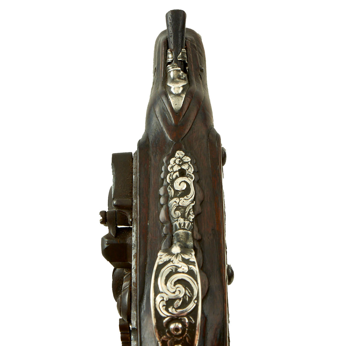 Original Item: One of a Kind. Very striking, this small sidelock flintlock pistol is beautifully mounted in solid silver carved mounts of Long Eared butt cup with a Cameo type mask finial. It bears deeply embossed mountings of a silver trigger guard, side plate, and ramrod pipes. It even still retains its silver tipped wooden ramrod. The fine walnut stock is also carved with flowers behind the barrel tang.