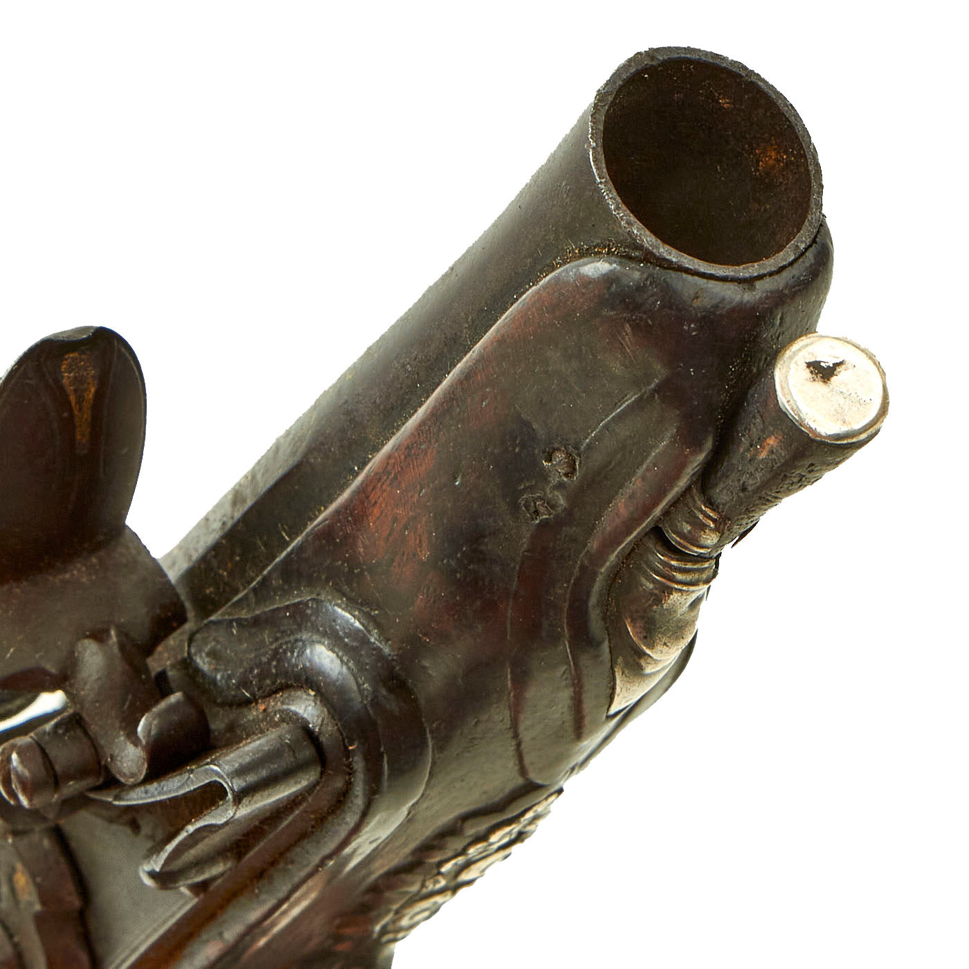 The pistol is equipped with a 3 1/2 inch barrel and has an overall length of just 6 3/4 inches, making it very easy to conceal in just about any pocket. The bore measures out to about .51 inches, probably for a 1/2 inch ball. We checked the lock, and it functions, however the safety dog is worn, so it does not prevent the pistol from firing at half or full cock. Overall condition is just lovely, with a great worn look on the silver appointments. The stock shows some wear, but no cracks or other major damage.