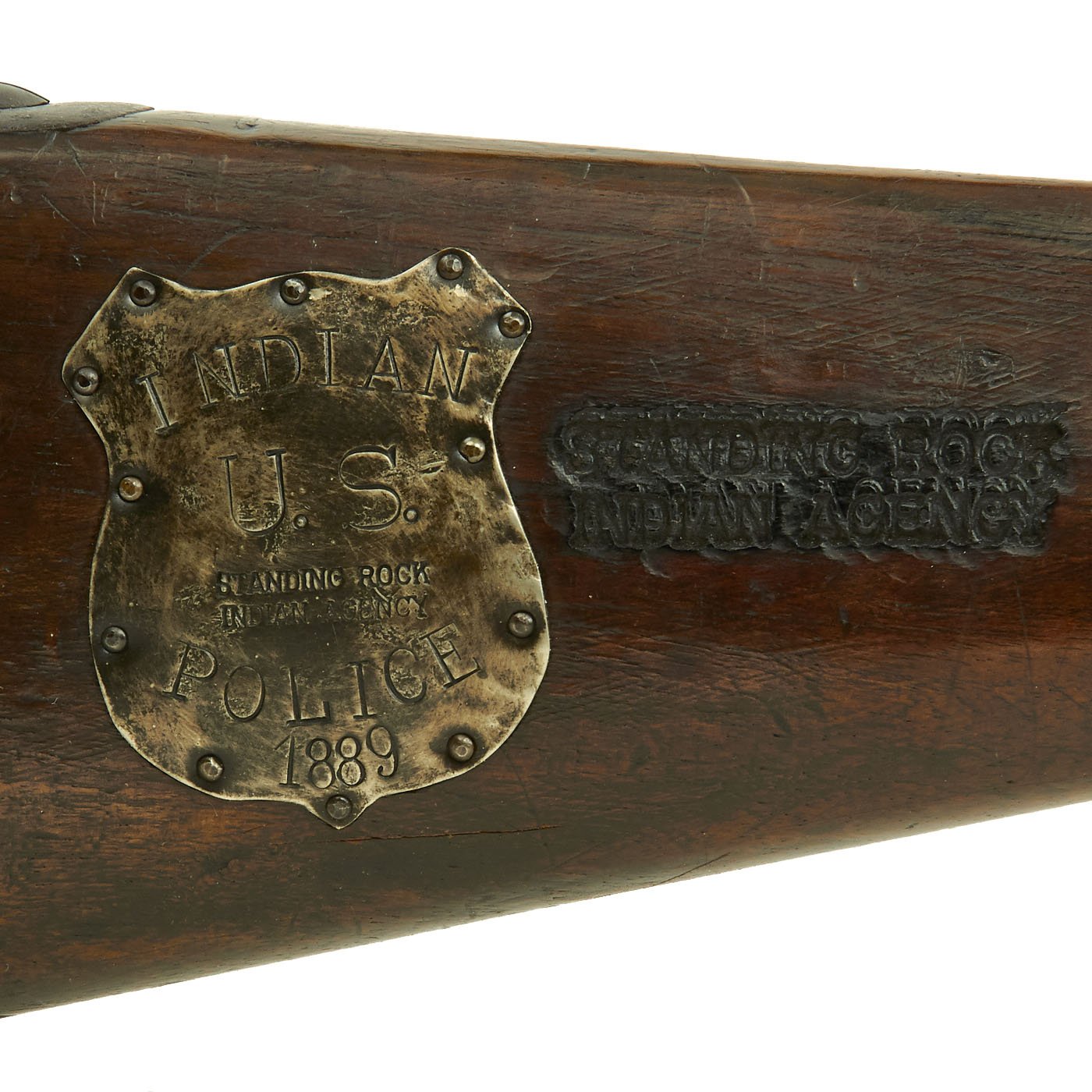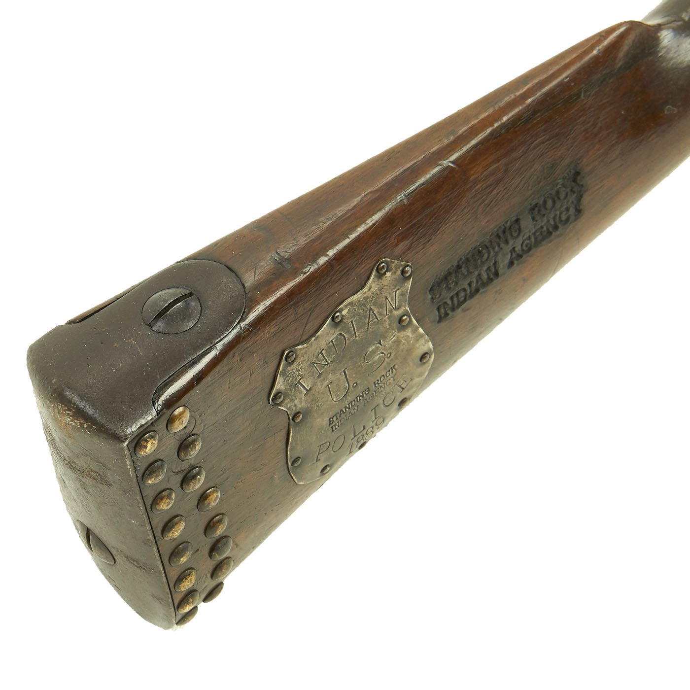 Next to this is another STANDING ROCK / INDIAN AGENCY marking. Additionally, the butt stock has the Butt plate area surrounded by 40 brass headed tacks, in a double line, as well as 8 brass headed tacks running down the fore end on each side, for 16 in total.