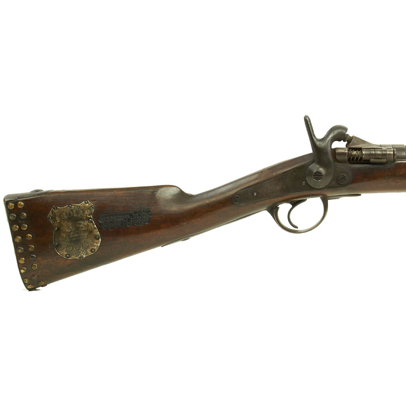 So this is a surplus military item basically reworked for the use of African Natives in the 1880's that somehow was sold to the U.S. Indian Agency at Standing Rock for use by the Indian Police based there. Furthermore it is adorned with the most desirable markings. The Collector from whom we received this item understood that there were about a half dozen of these Carbines housed in the Police Department at the Standing Rock Sioux Reservation.