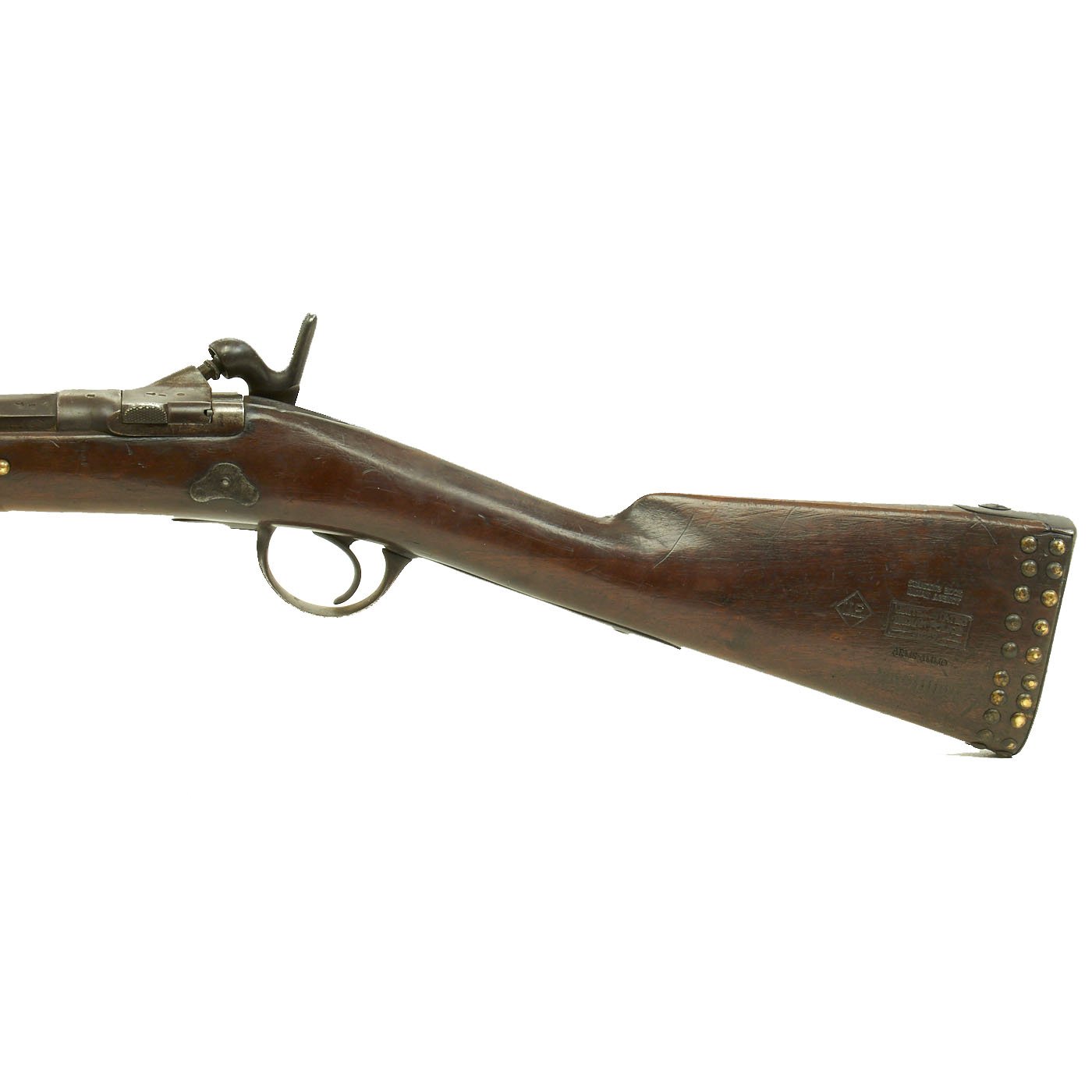 Fitted with a 21" smooth bore barrel, this carbine looks to follow the lines of most all Civil War Carbines. The Walnut butt stock is clearly stamped on the left side with "U.S." in a Diamond shaped box, next to some rather detailed stamped markings: