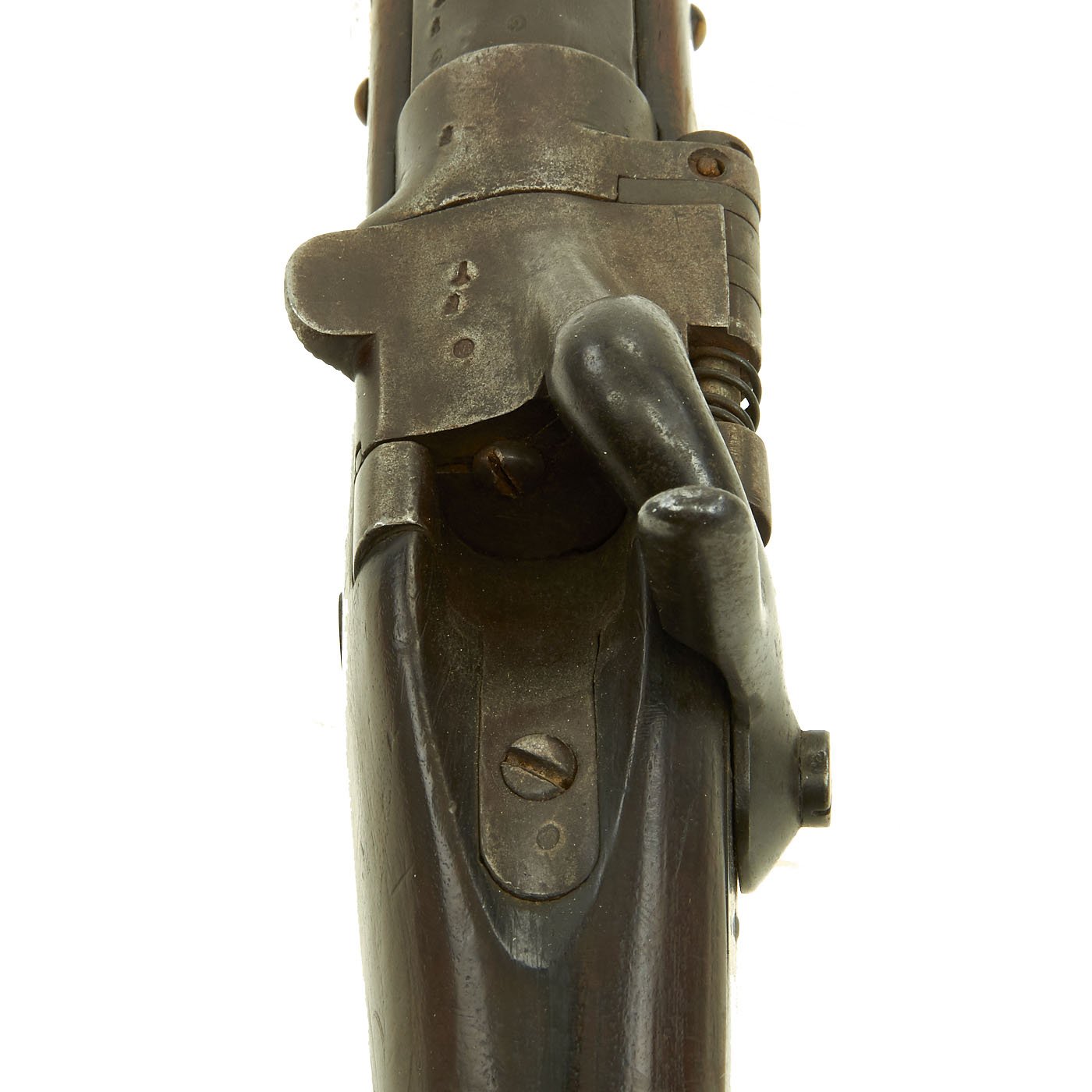 Condition is quite nice, especially considering the age and provenance. The breech opens correctly, and the ejection system is functional, though it sticks a bit. The locking spring for the breech is worn, so it can open easily. The bore is clear, and partly bright, with the expected wear and oxidation. The lock is also still functional, though only really has a full cock position.