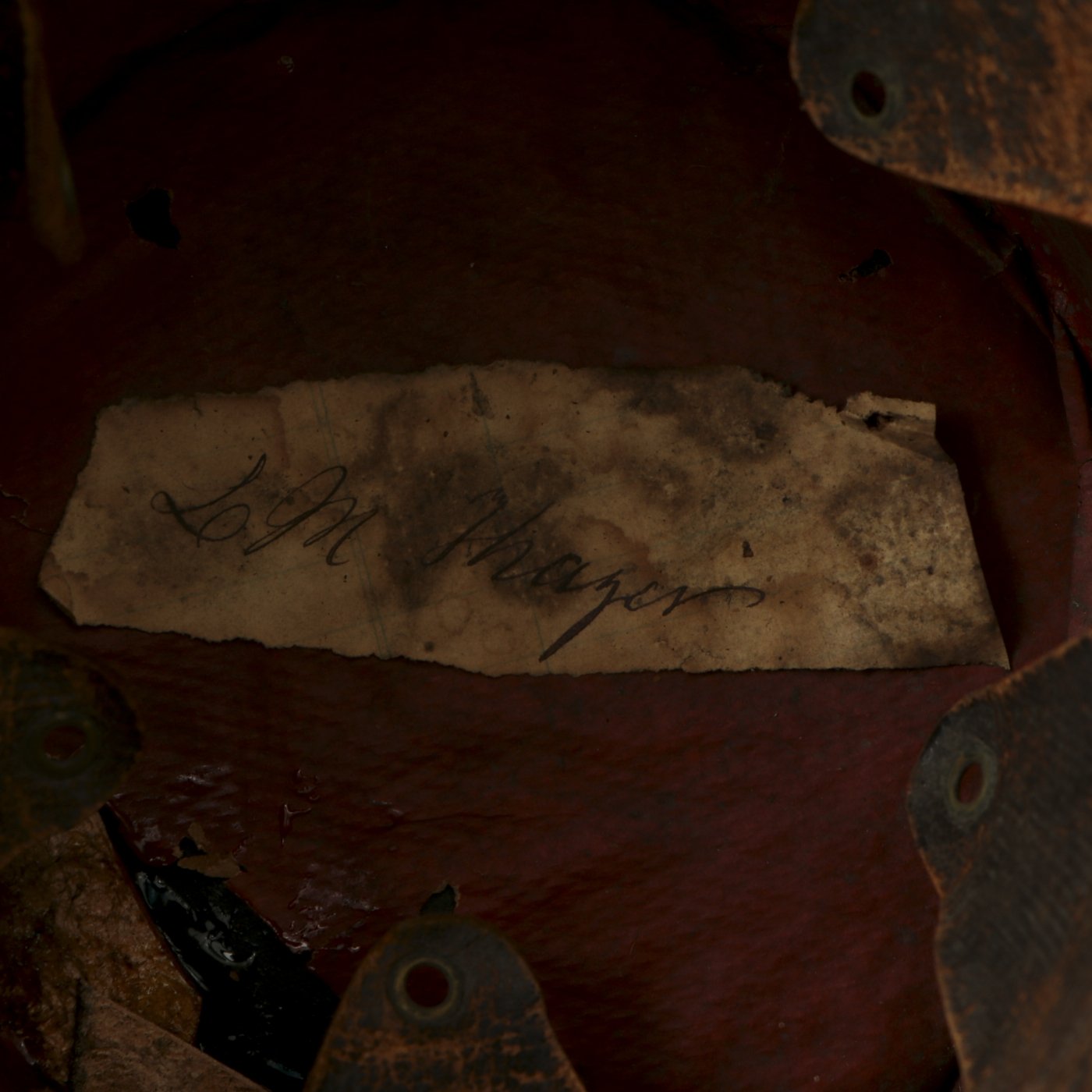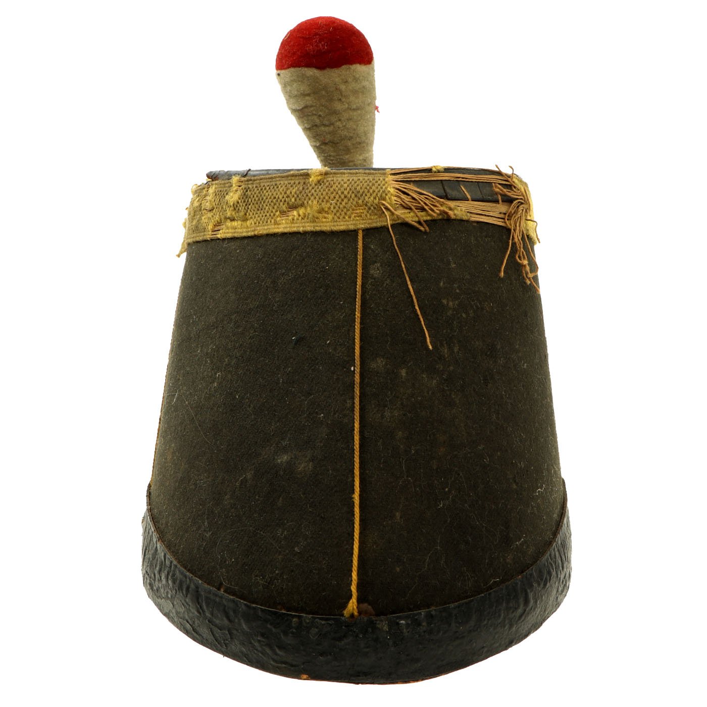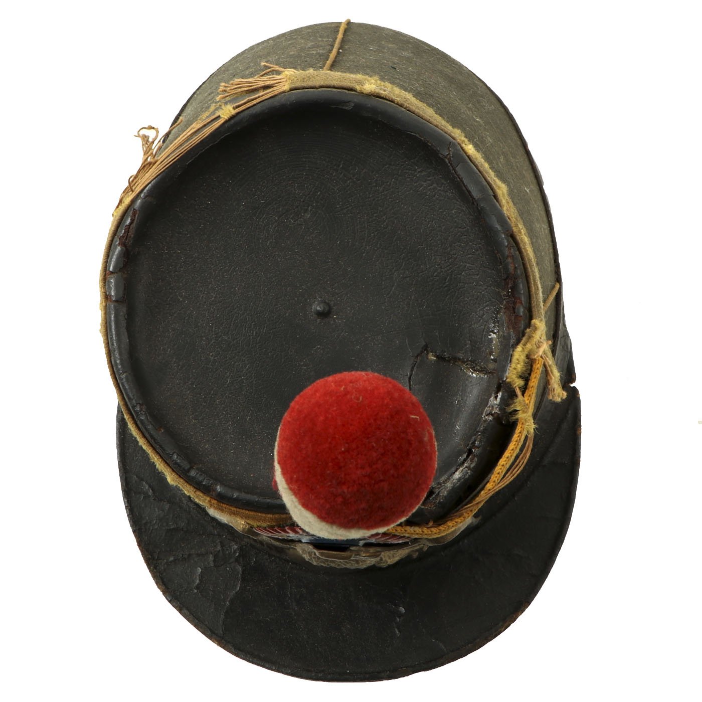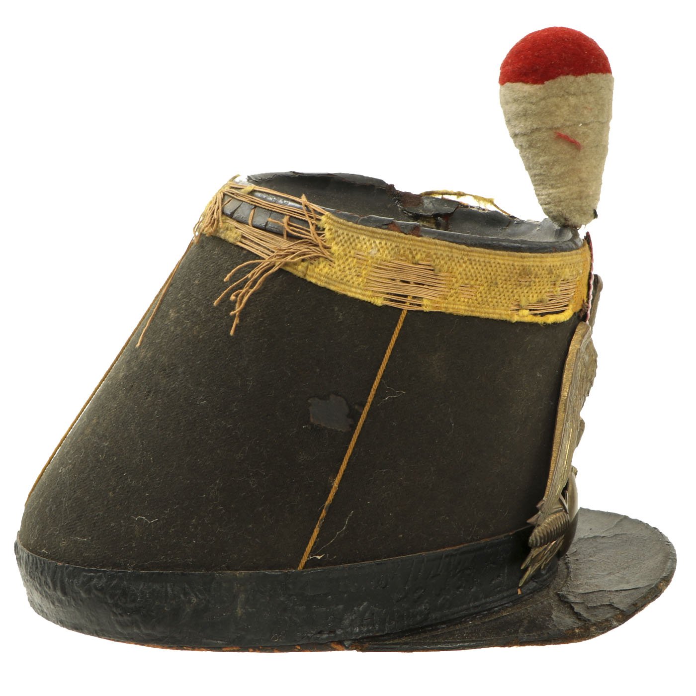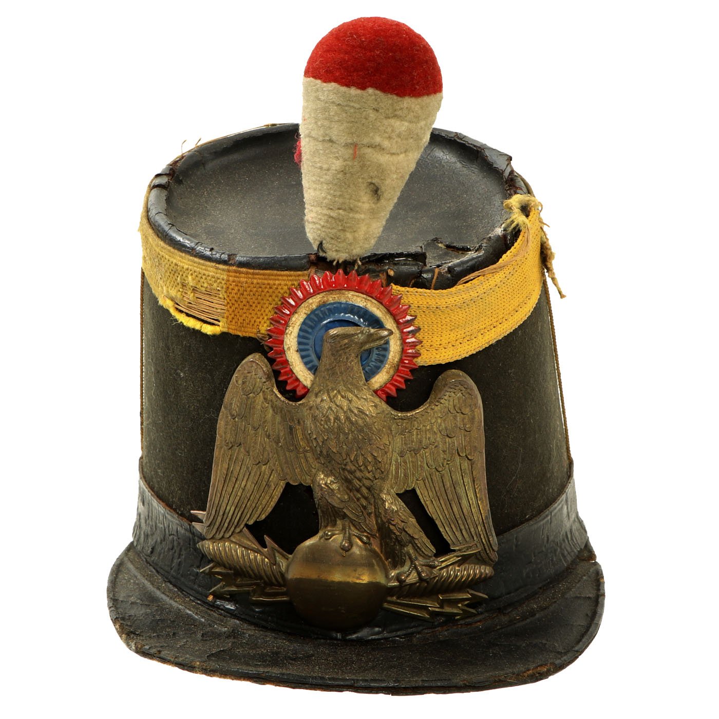 Original Item: Only One Available. A nice example of a French Third Republic military shako, circa 1870-1890. The cardboard body displays a thin covering of black wool, with a yellow worsted wool band at the top, and a black painted rigid top. There is a black thin leather strap around the base, black pressed oil cloth visor and original brass eagle plate with cockade to the front of the shako. Close examination shows this to be a replacement made from a German cockade, as would be around the side lugs of Imperial German helmets. The red/white plume sits nicely on the top. Chinstrap is absent. The interior of the shako is lined in red waxed paper with a wide Moroccan leather sweatband. There is a paper name label to the inside crown. Overall the shako is sound condition, but shows age and wear.