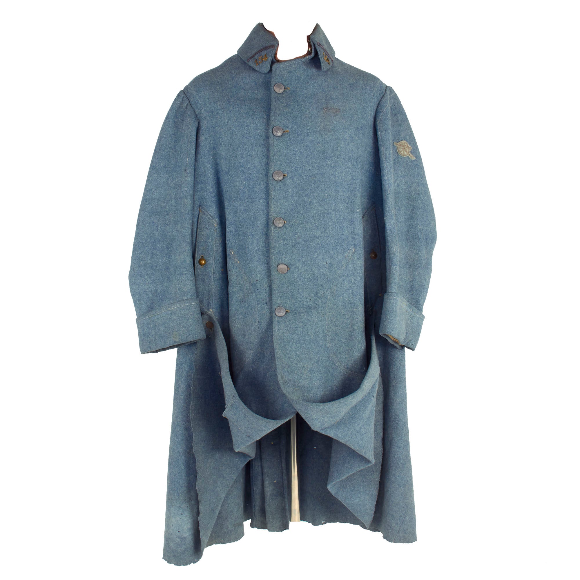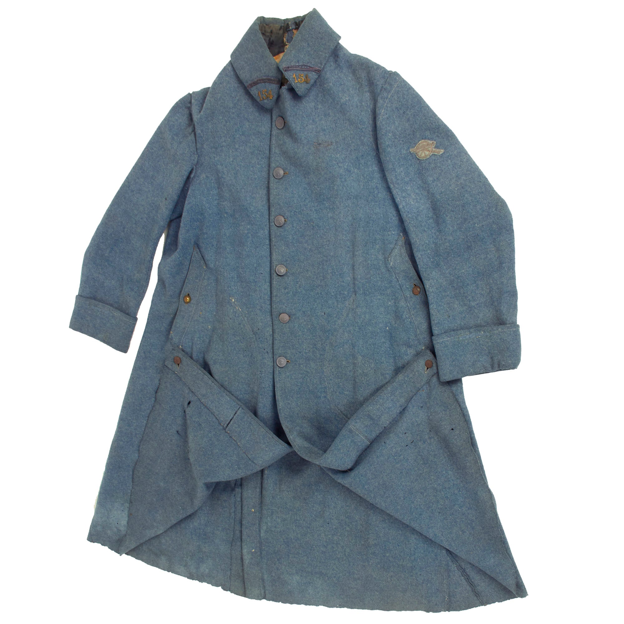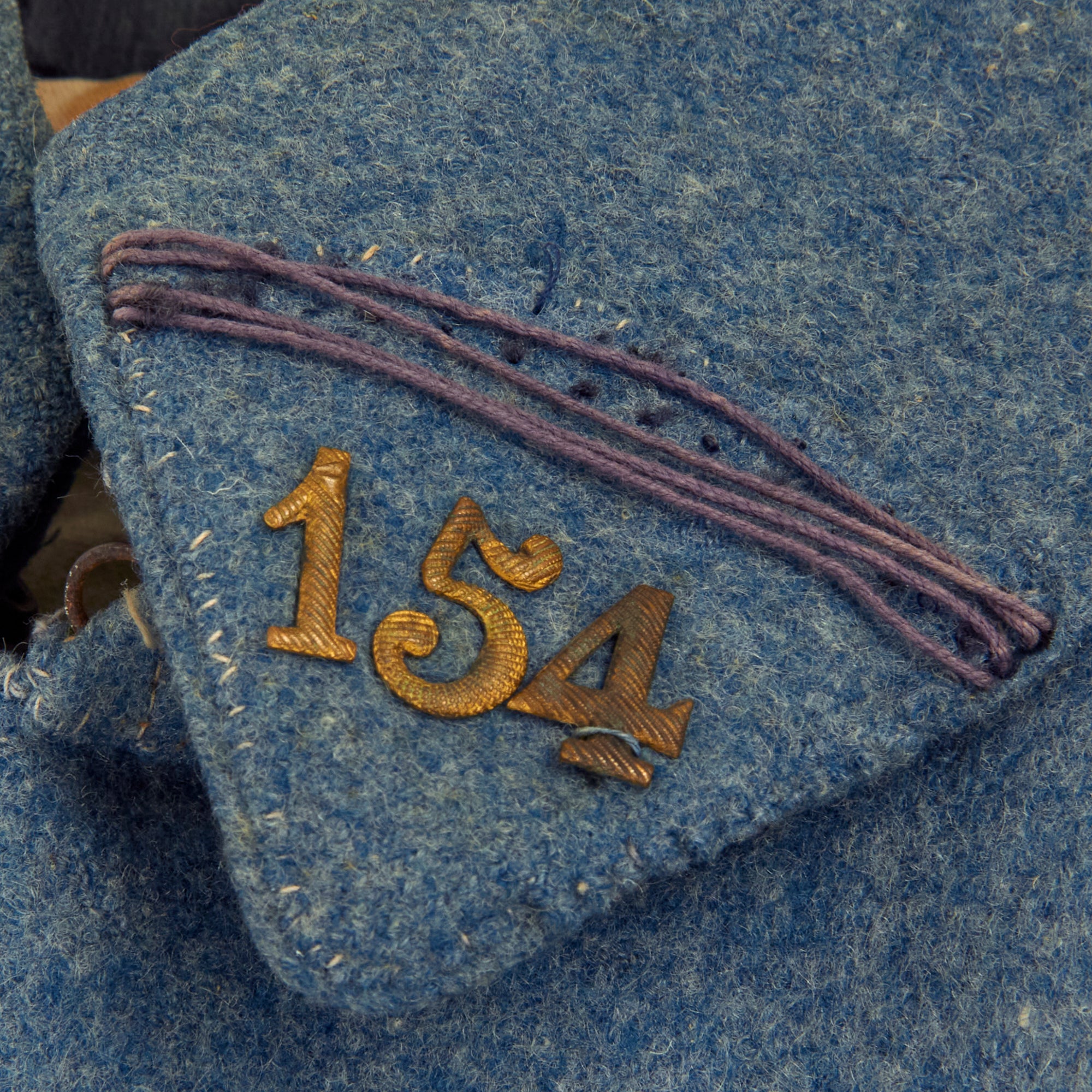 The greatcoat has buttons in the back to allow the wearer to unbutton it while mounted on horseback to better allow a more comfortable fit. The collar insignia we believe is for the 154th Field Artillery regiment but we have been unable to solidify our theory with what little information we have found. It was not uncommon for artillery regiments to have horses as they were used to move guns from emplacement to emplacement throughout the war and various locations.
