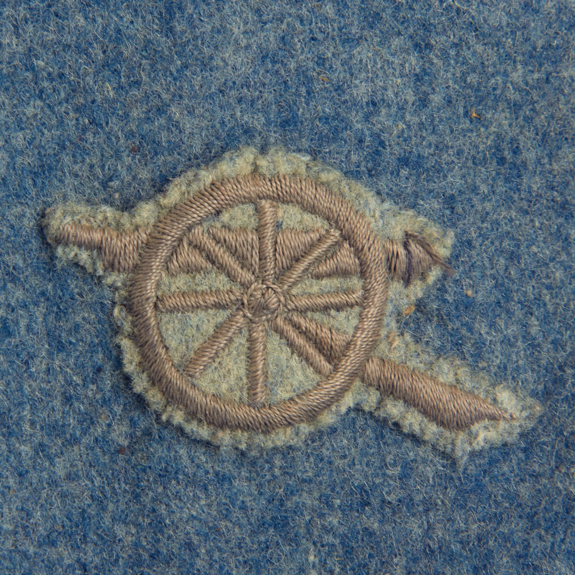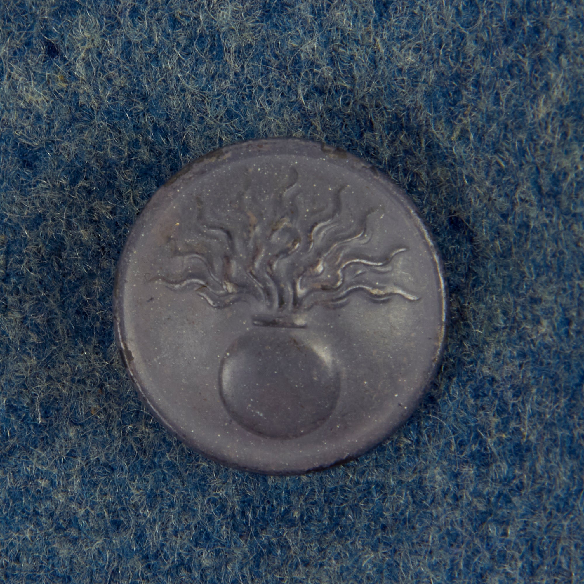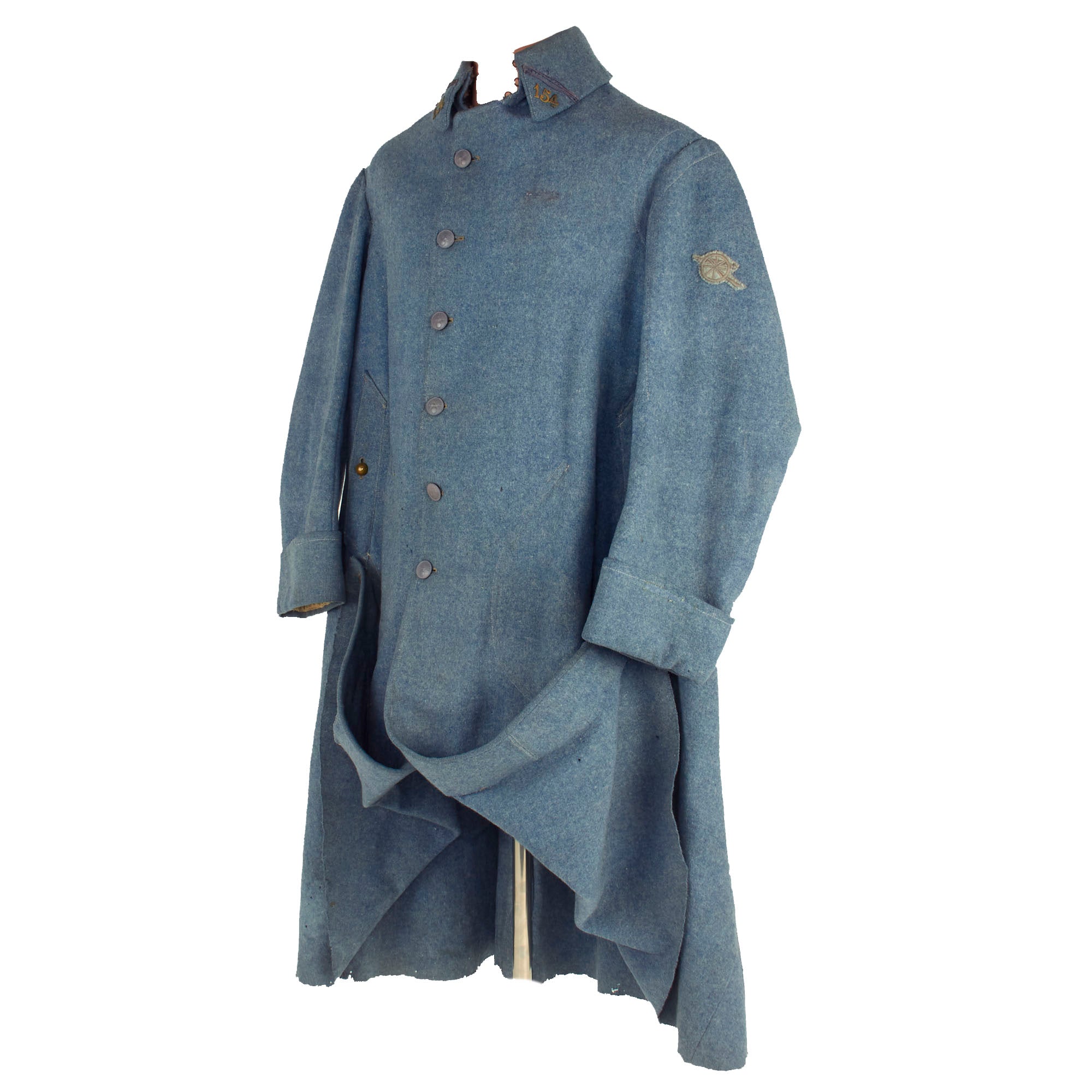The greatcoat has buttons in the back to allow the wearer to unbutton it while mounted on horseback to better allow a more comfortable fit. The collar insignia we believe is for the 154th Field Artillery regiment but we have been unable to solidify our theory with what little information we have found. It was not uncommon for artillery regiments to have horses as they were used to move guns from emplacement to emplacement throughout the war and various locations.