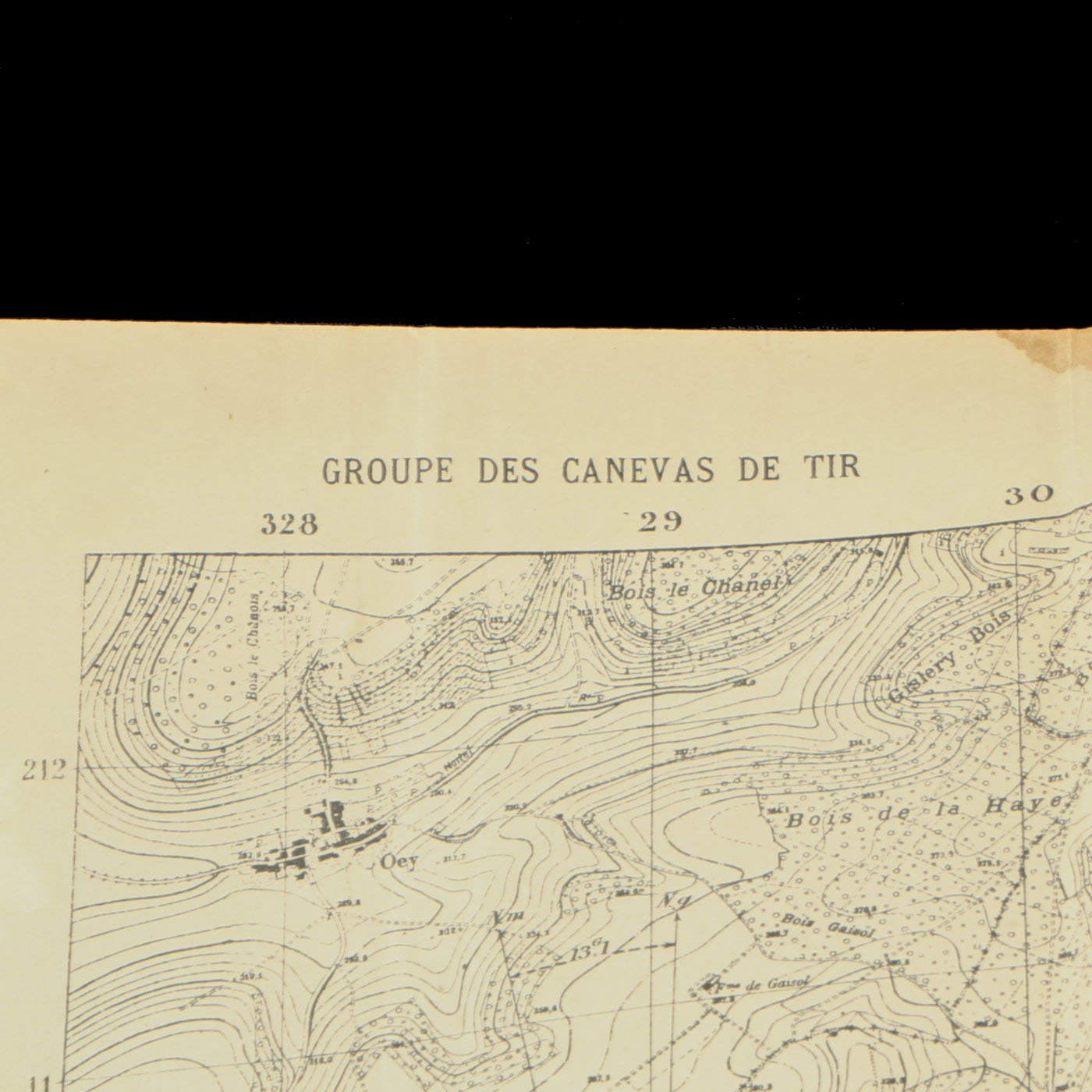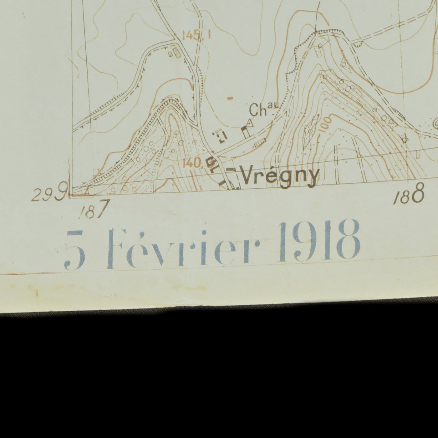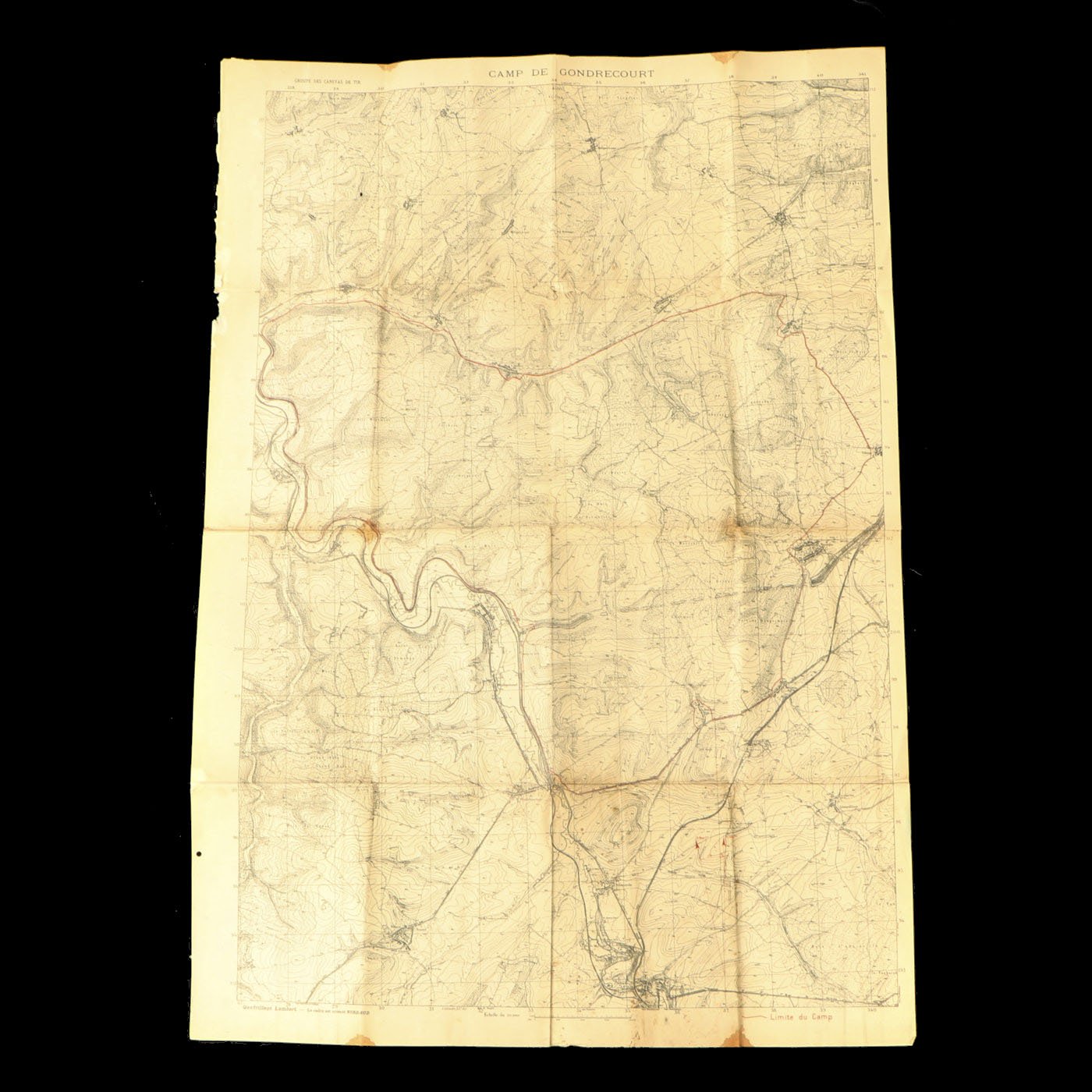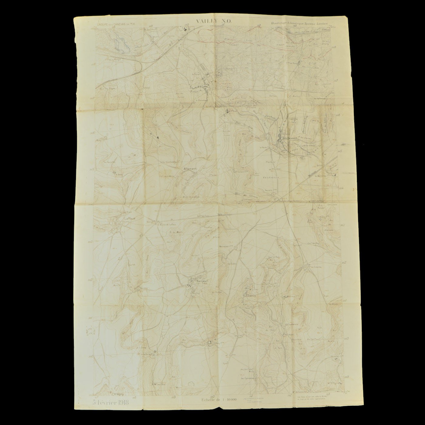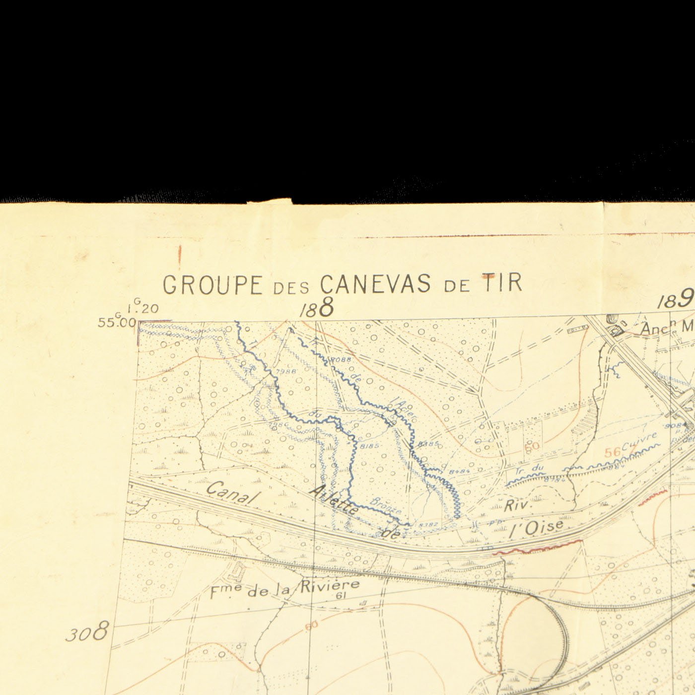 - Original Items: Only One Set Available. This is a set of three WORLD WAR I "Groupe des Canevas de Tir" large paper topographical maps. Approximately 32" x 40" inches or smaller; color-printed; original folds, scattered staining and occasional small tears or fold splits. Two are armed Fevrier 1918 (February 1918) and all show red lines which indicate trenches. Overprinted trench warfare maps consisting of the following areas in France: FRESNES, VAILLY N.O. and CAMP DE GONDRECOURT.