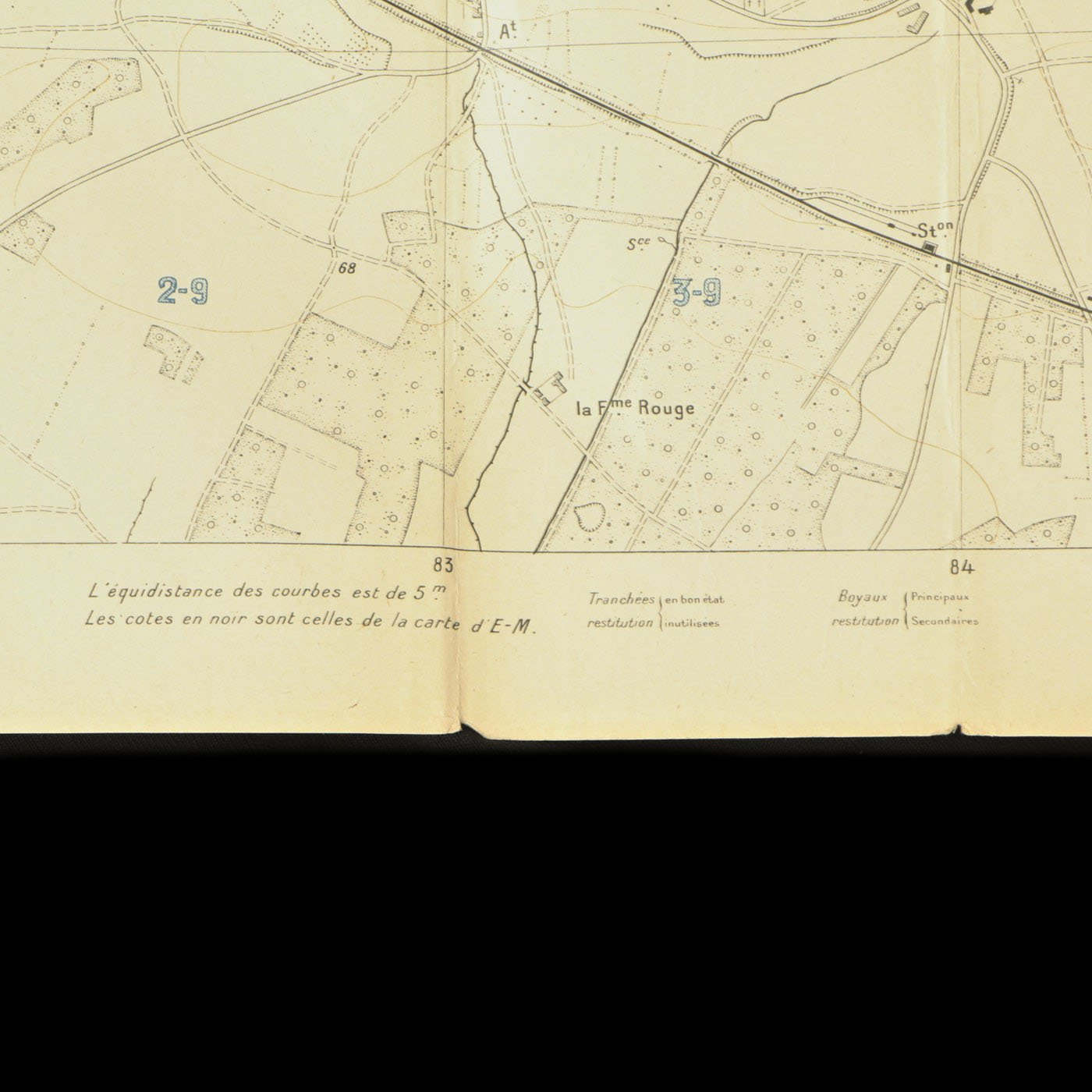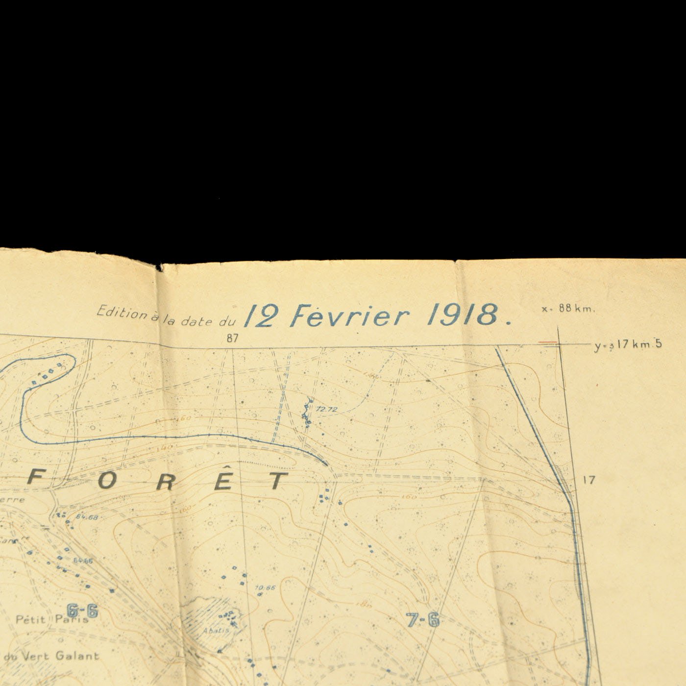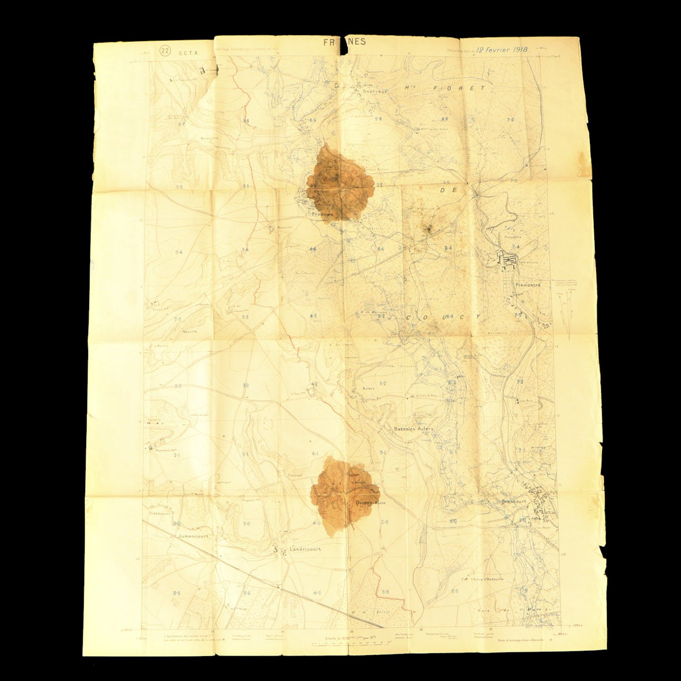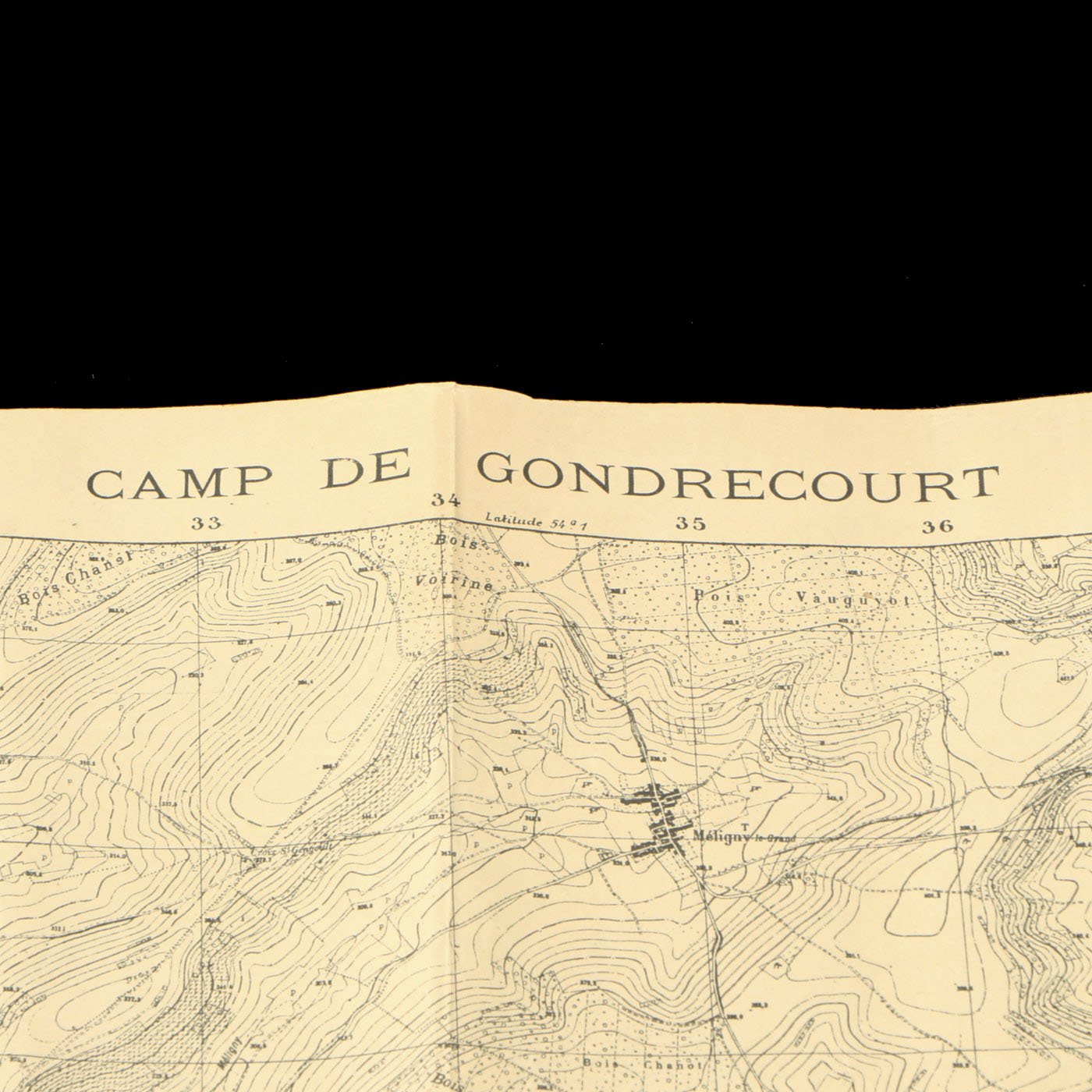 - Original Items: Only One Set Available. This is a set of three WORLD WAR I "Groupe des Canevas de Tir" large paper topographical maps. Approximately 32" x 40" inches or smaller; color-printed; original folds, scattered staining and occasional small tears or fold splits. Two are armed Fevrier 1918 (February 1918) and all show red lines which indicate trenches. Overprinted trench warfare maps consisting of the following areas in France: FRESNES, VAILLY N.O. and CAMP DE GONDRECOURT.