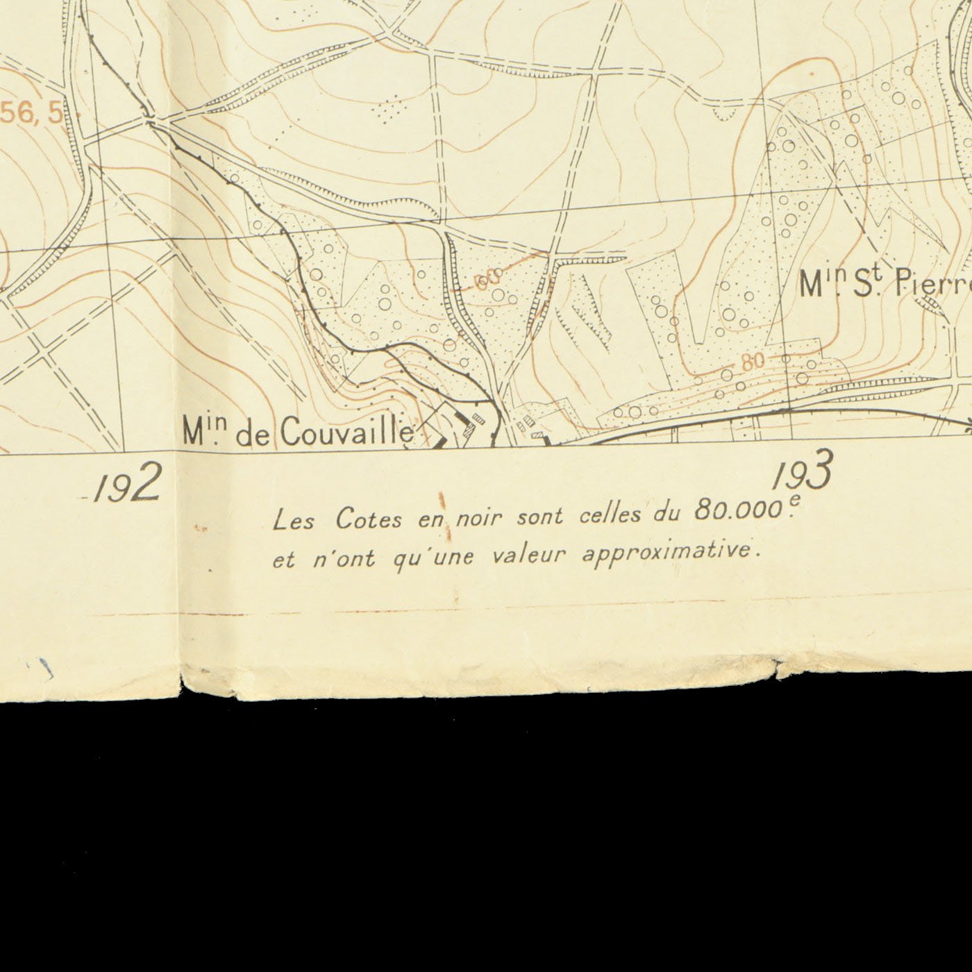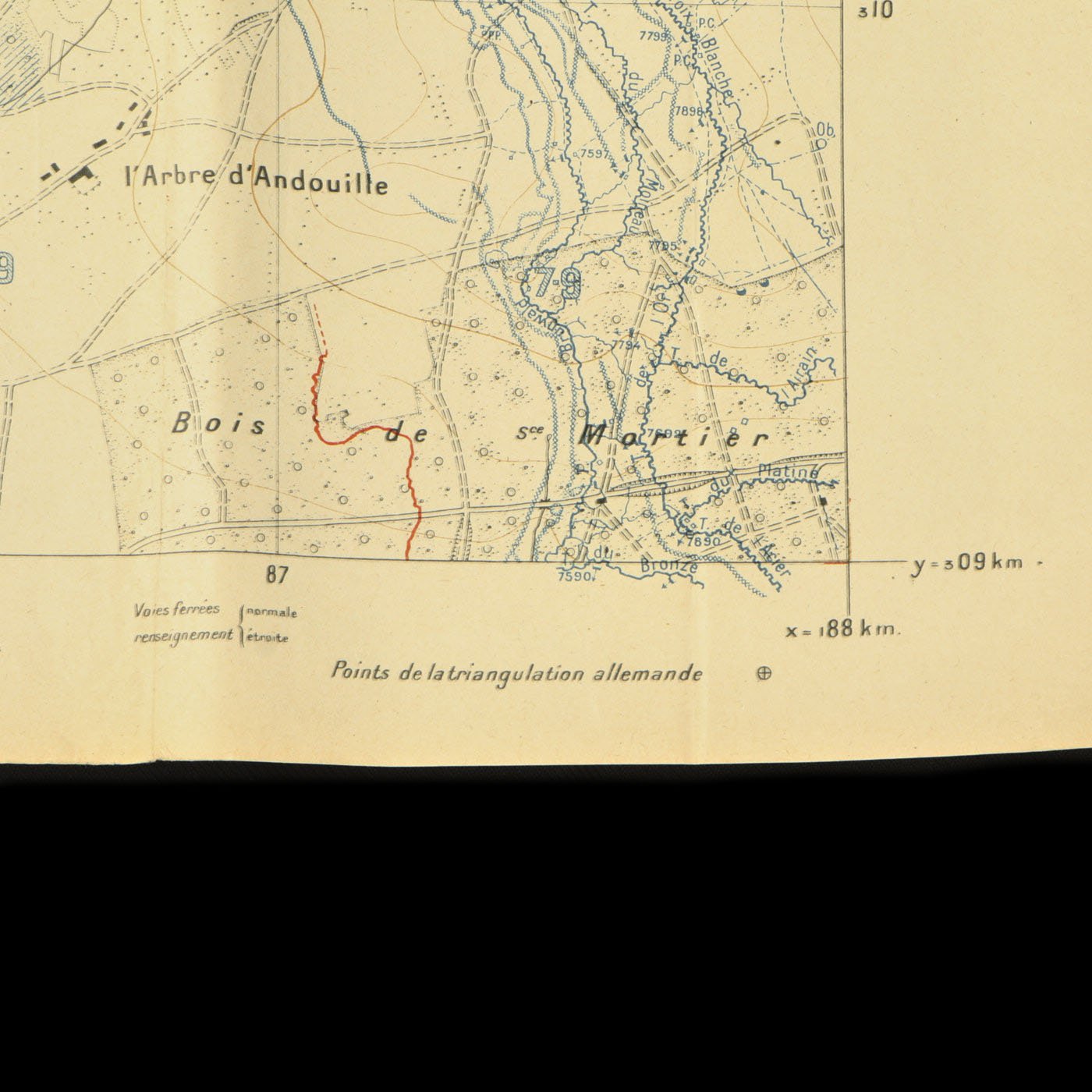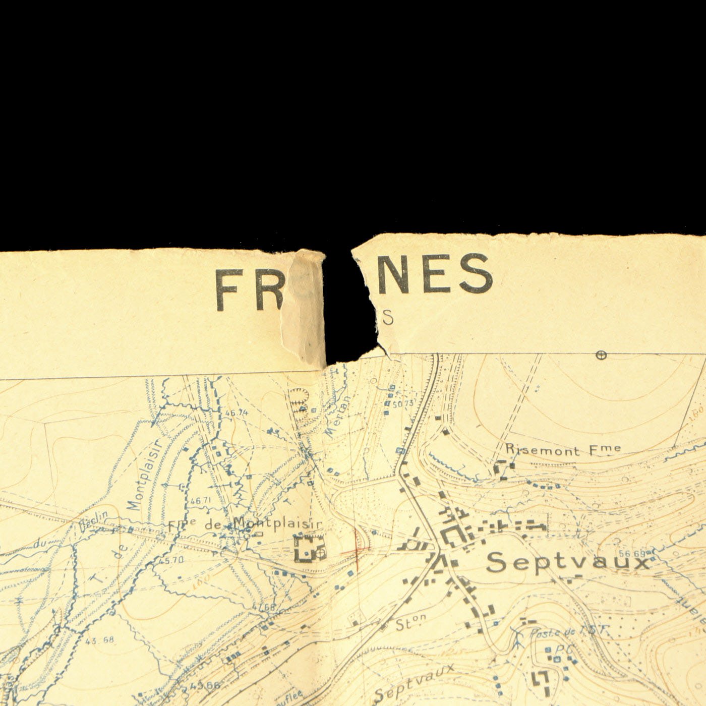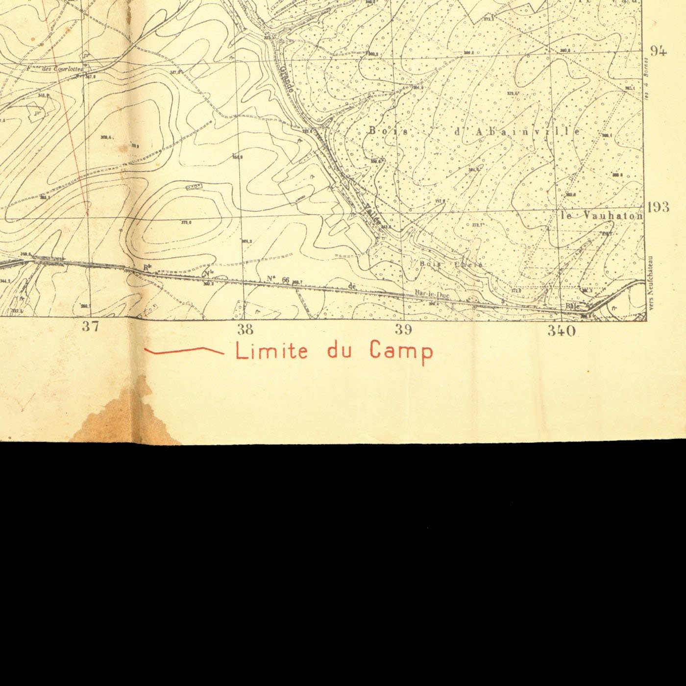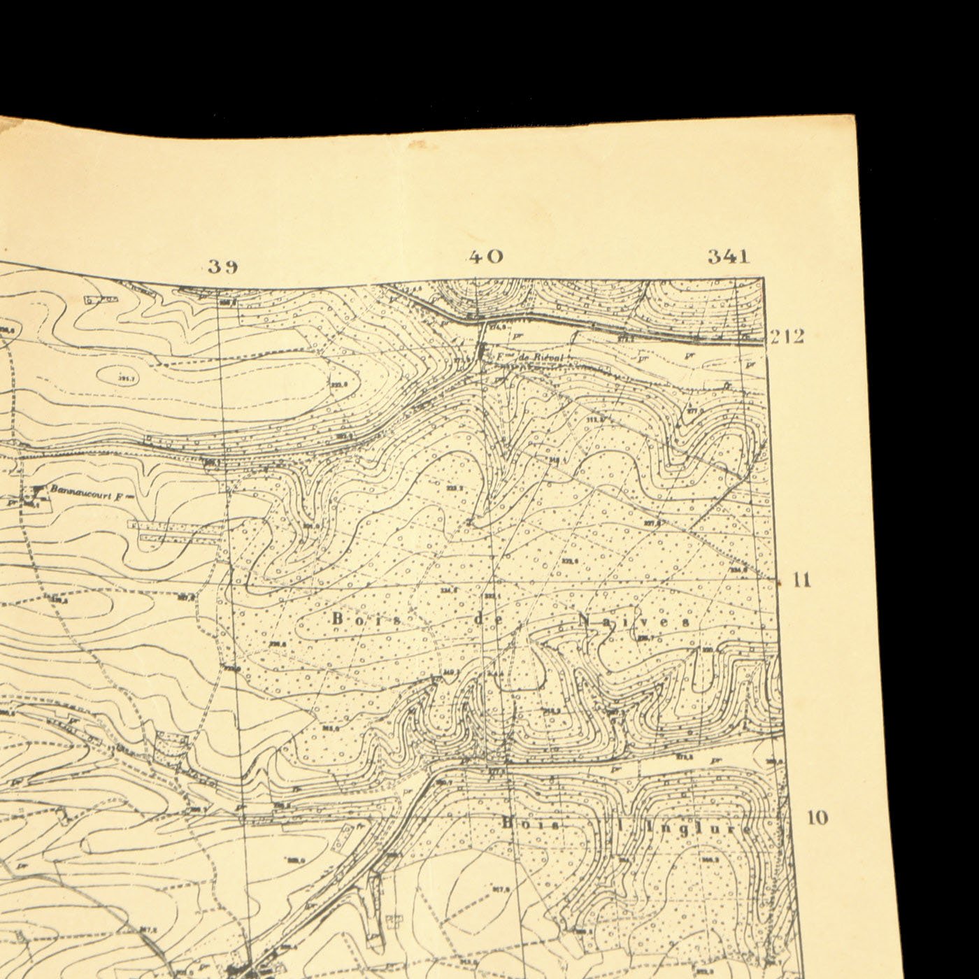 - Original Items: Only One Set Available. This is a set of three WORLD WAR I "Groupe des Canevas de Tir" large paper topographical maps. Approximately 32" x 40" inches or smaller; color-printed; original folds, scattered staining and occasional small tears or fold splits. Two are armed Fevrier 1918 (February 1918) and all show red lines which indicate trenches. Overprinted trench warfare maps consisting of the following areas in France: FRESNES, VAILLY N.O. and CAMP DE GONDRECOURT.