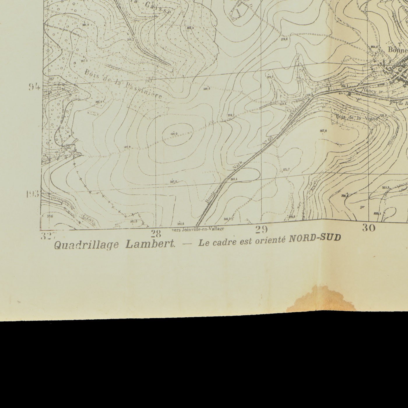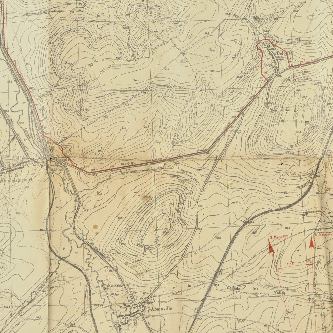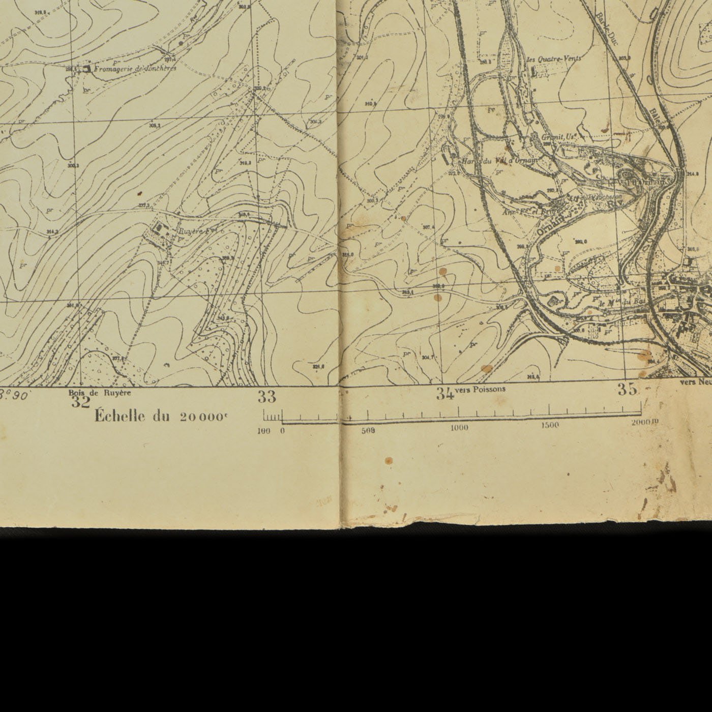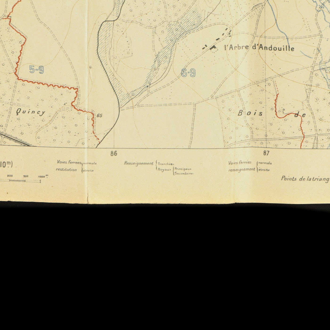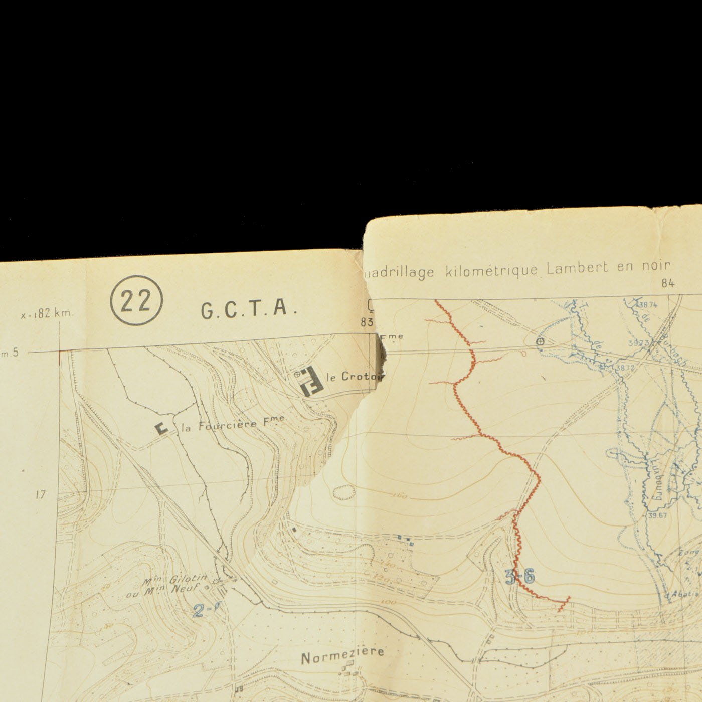 - Original Items: Only One Set Available. This is a set of three WORLD WAR I "Groupe des Canevas de Tir" large paper topographical maps. Approximately 32" x 40" inches or smaller; color-printed; original folds, scattered staining and occasional small tears or fold splits. Two are armed Fevrier 1918 (February 1918) and all show red lines which indicate trenches. Overprinted trench warfare maps consisting of the following areas in France: FRESNES, VAILLY N.O. and CAMP DE GONDRECOURT.