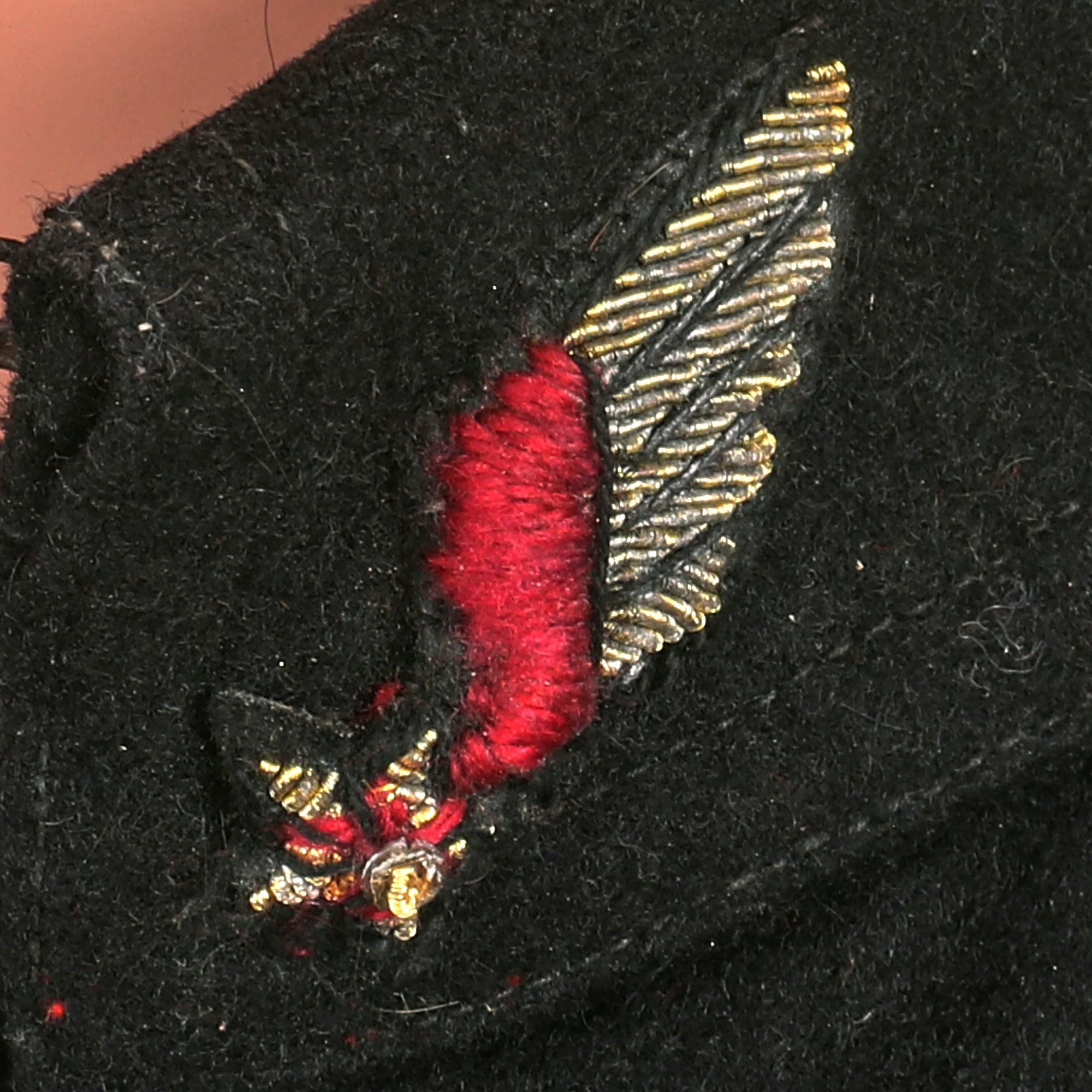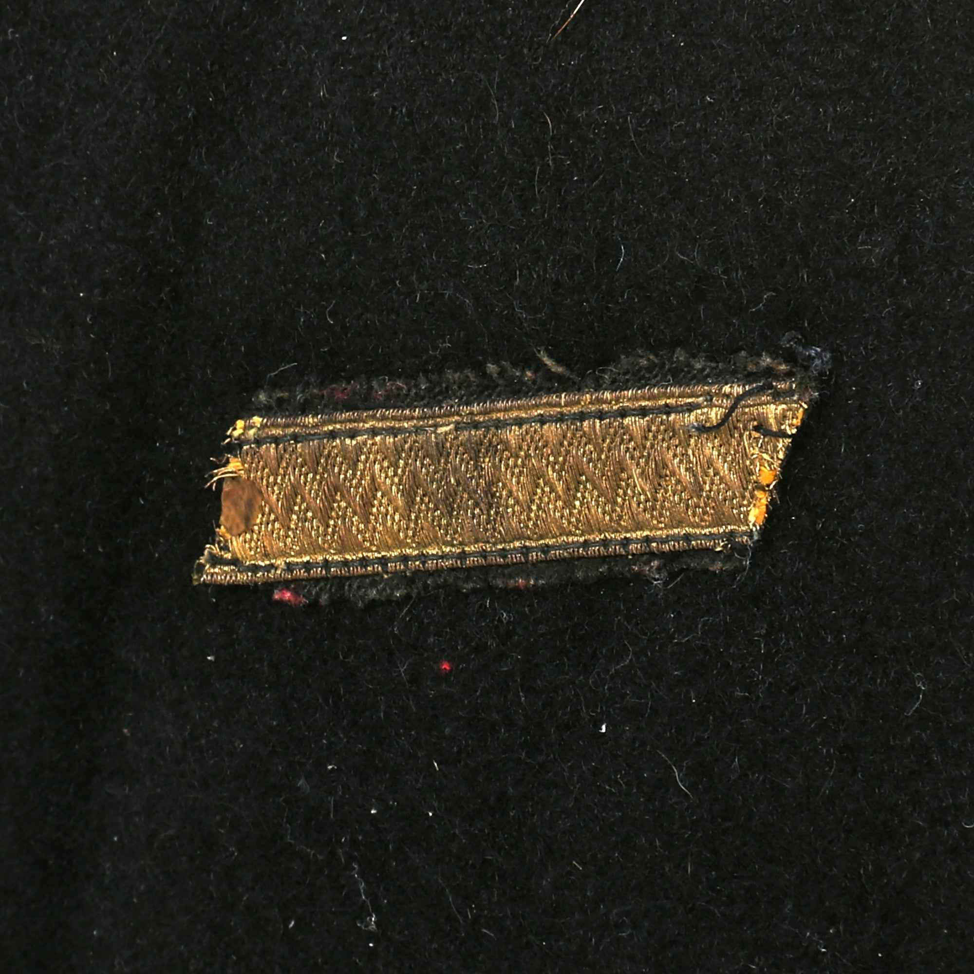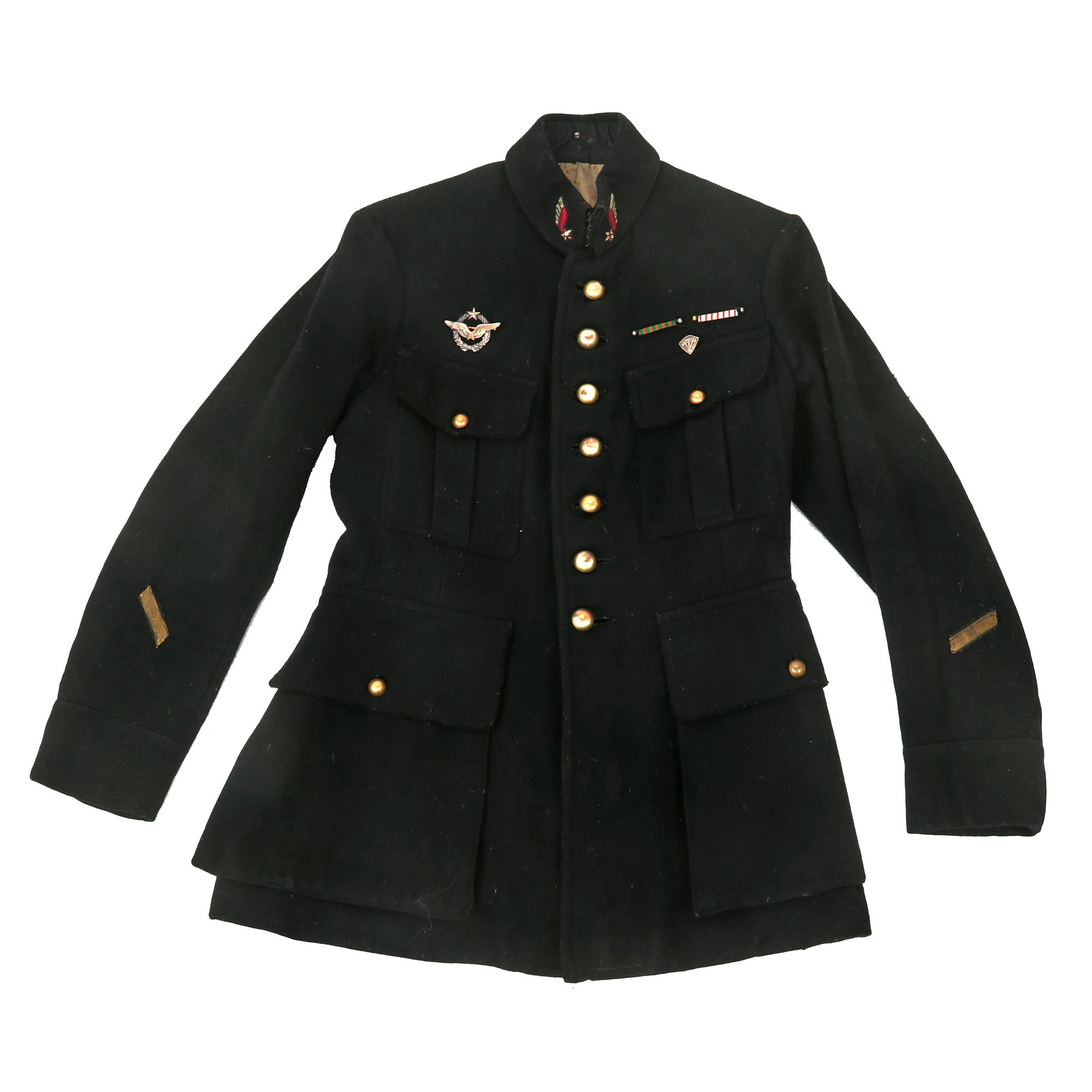 - Black wool French Air Service 2nd Hussars service coat, single breasted with all 7 brass buttons down front. The collar tabs feature beautiful gold bullion and maroon thread “winged star” insignia with vibrant color. The right side of the uniform features an original Great War metal “B” hallmarked Pilot’s Wings Badge which is marked on the reverse side B 9588. The badge is wartime manufactured version as indicated by the serial number. These badges in their own are very rare and sought after. Other original insignia present is a pair of ribbons for the Croix de Guerre and the Combatant’s Cross. The final insignia present is one that we have not encountered before or was able to identify. The interior lining is nicely unit stamped 1. G.A. (1er Groupe d'Aviation).