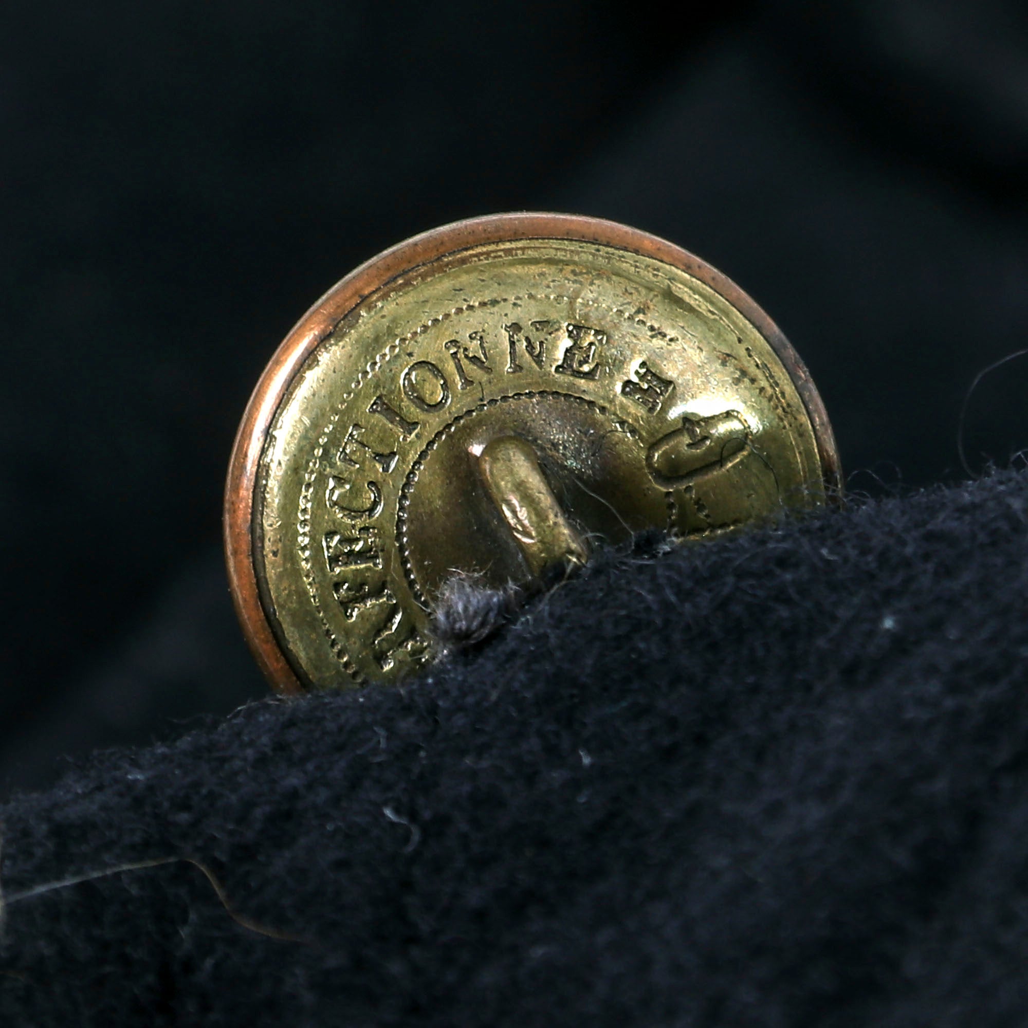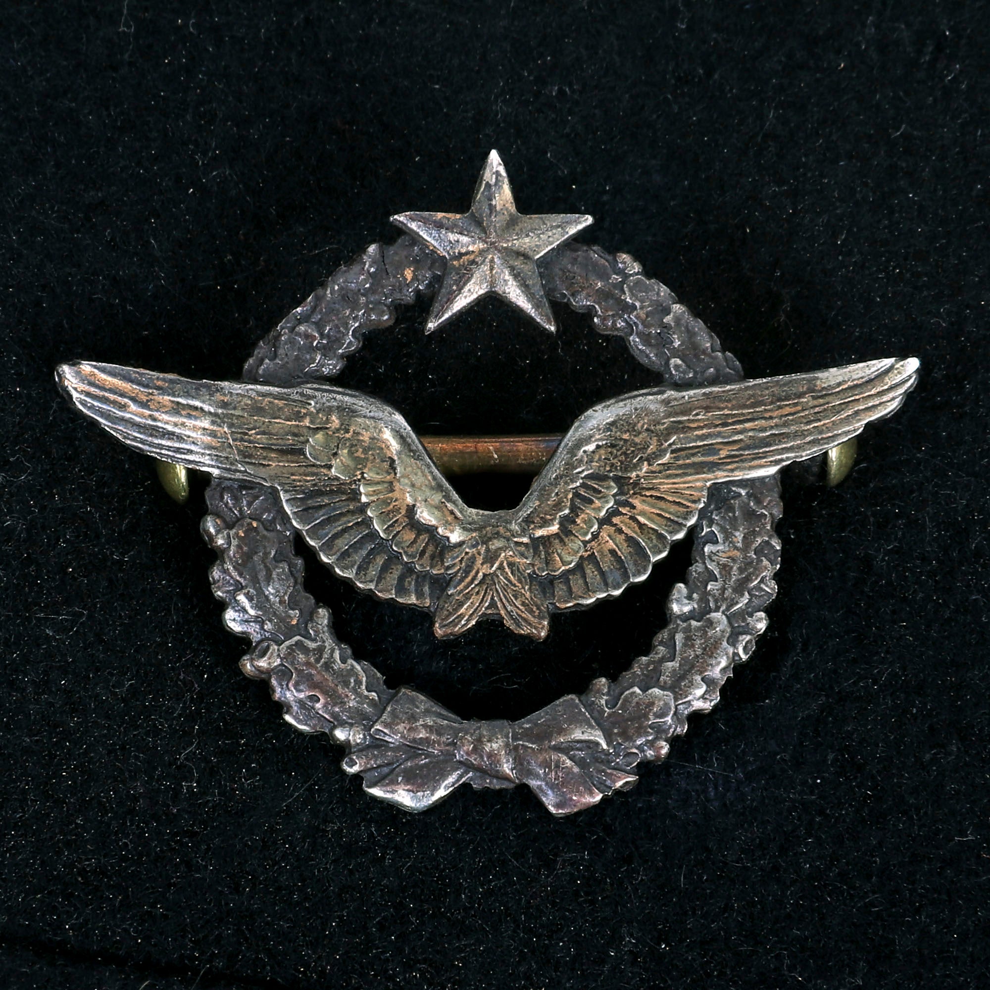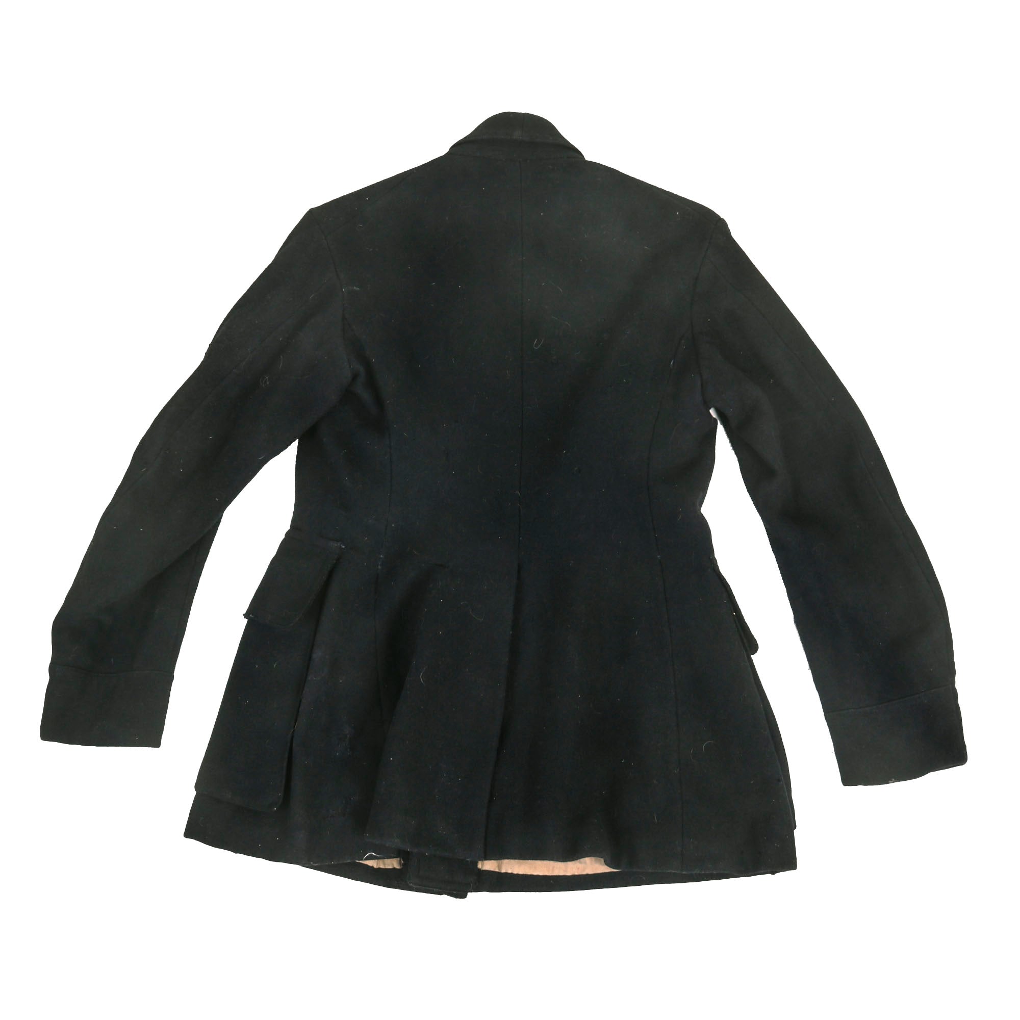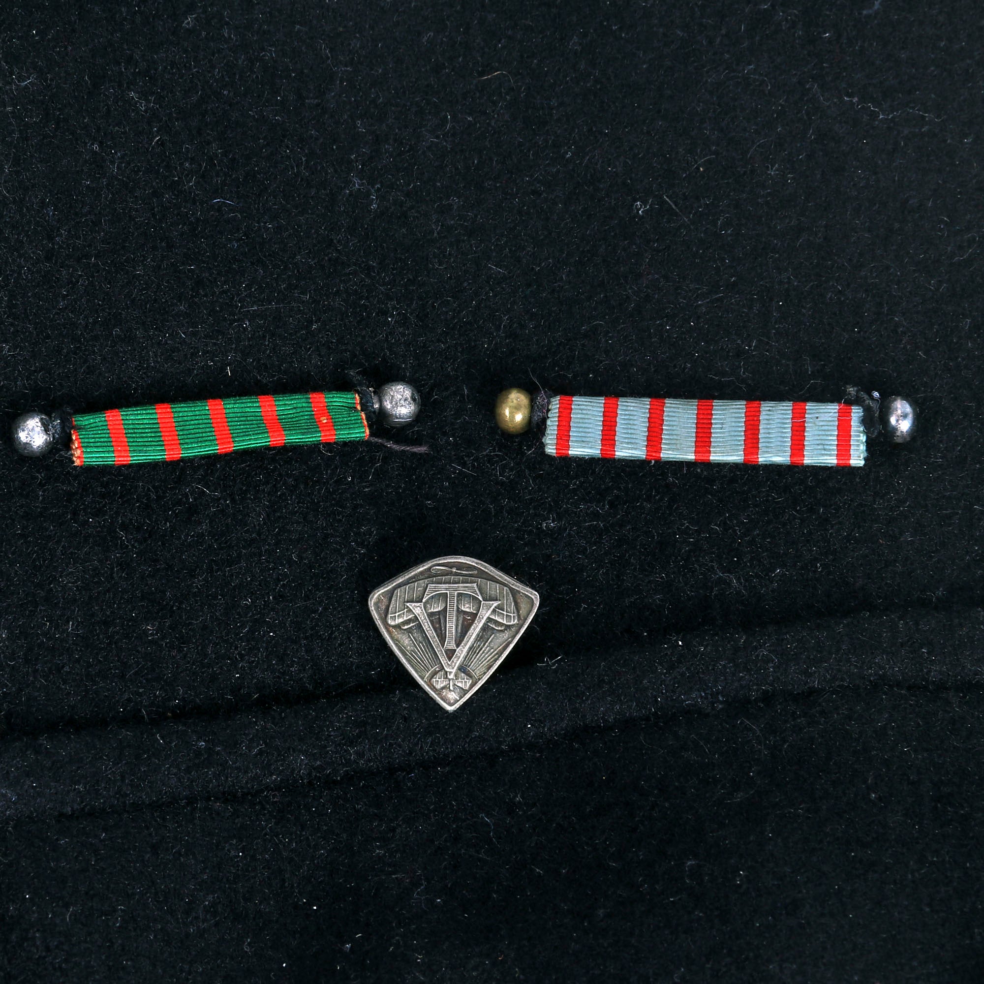 - Black wool French Air Service 2nd Hussars service coat, single breasted with all 7 brass buttons down front. The collar tabs feature beautiful gold bullion and maroon thread “winged star” insignia with vibrant color. The right side of the uniform features an original Great War metal “B” hallmarked Pilot’s Wings Badge which is marked on the reverse side B 9588. The badge is wartime manufactured version as indicated by the serial number. These badges in their own are very rare and sought after. Other original insignia present is a pair of ribbons for the Croix de Guerre and the Combatant’s Cross. The final insignia present is one that we have not encountered before or was able to identify. The interior lining is nicely unit stamped 1. G.A. (1er Groupe d'Aviation).