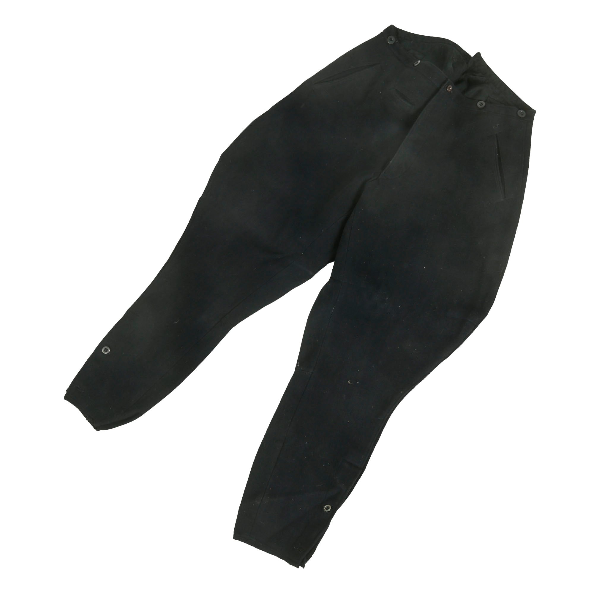 - French WWI black wool trousers are in wonderful condition with minor moth nips present and no extensive damage.
