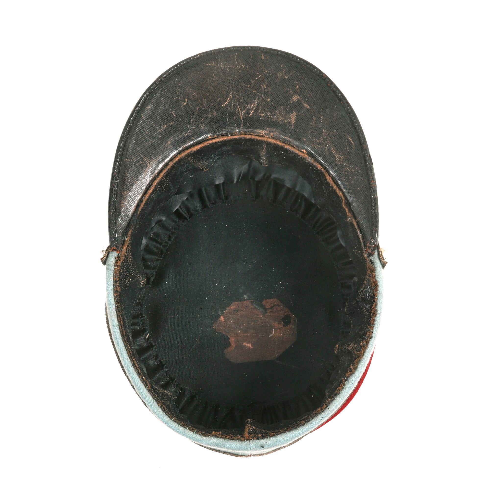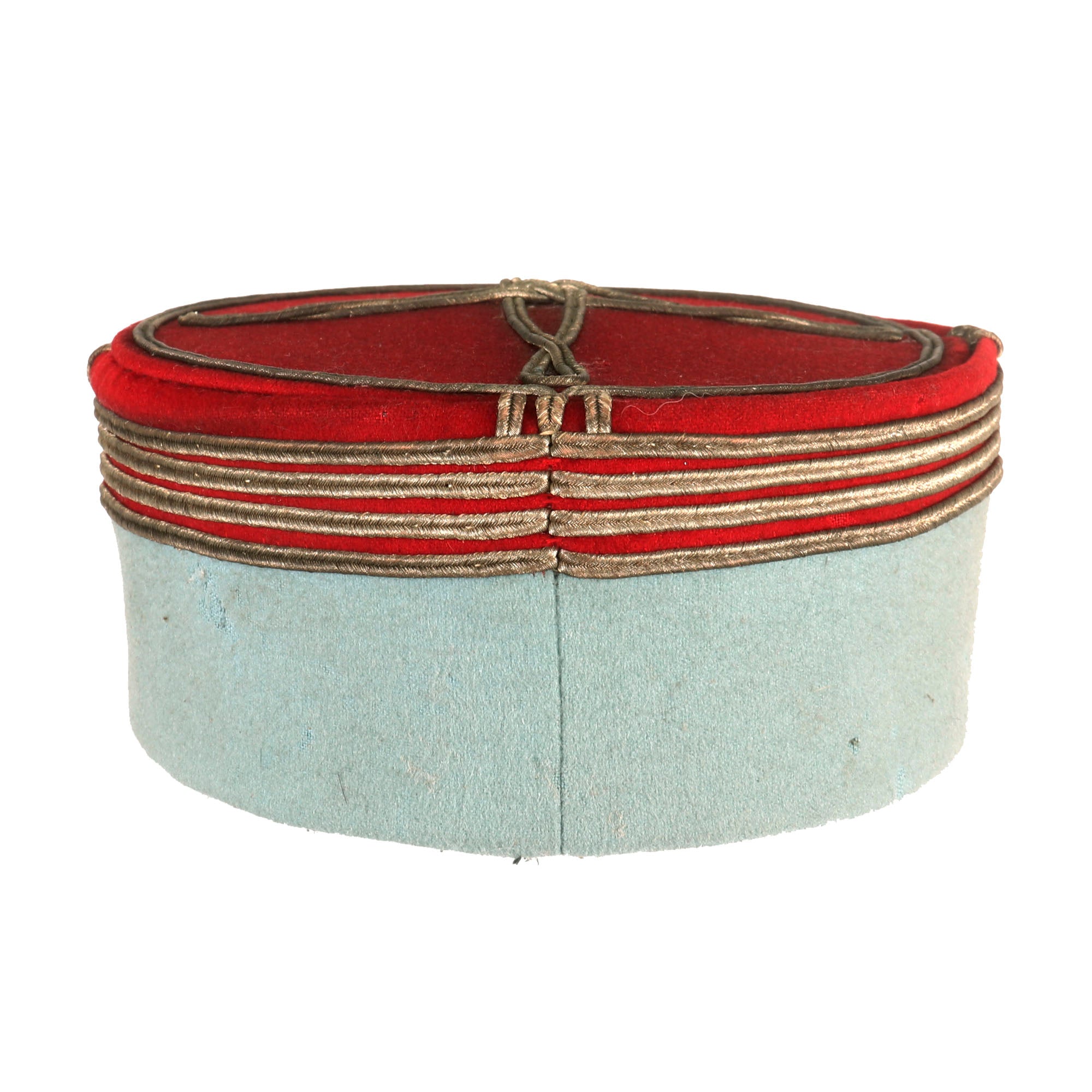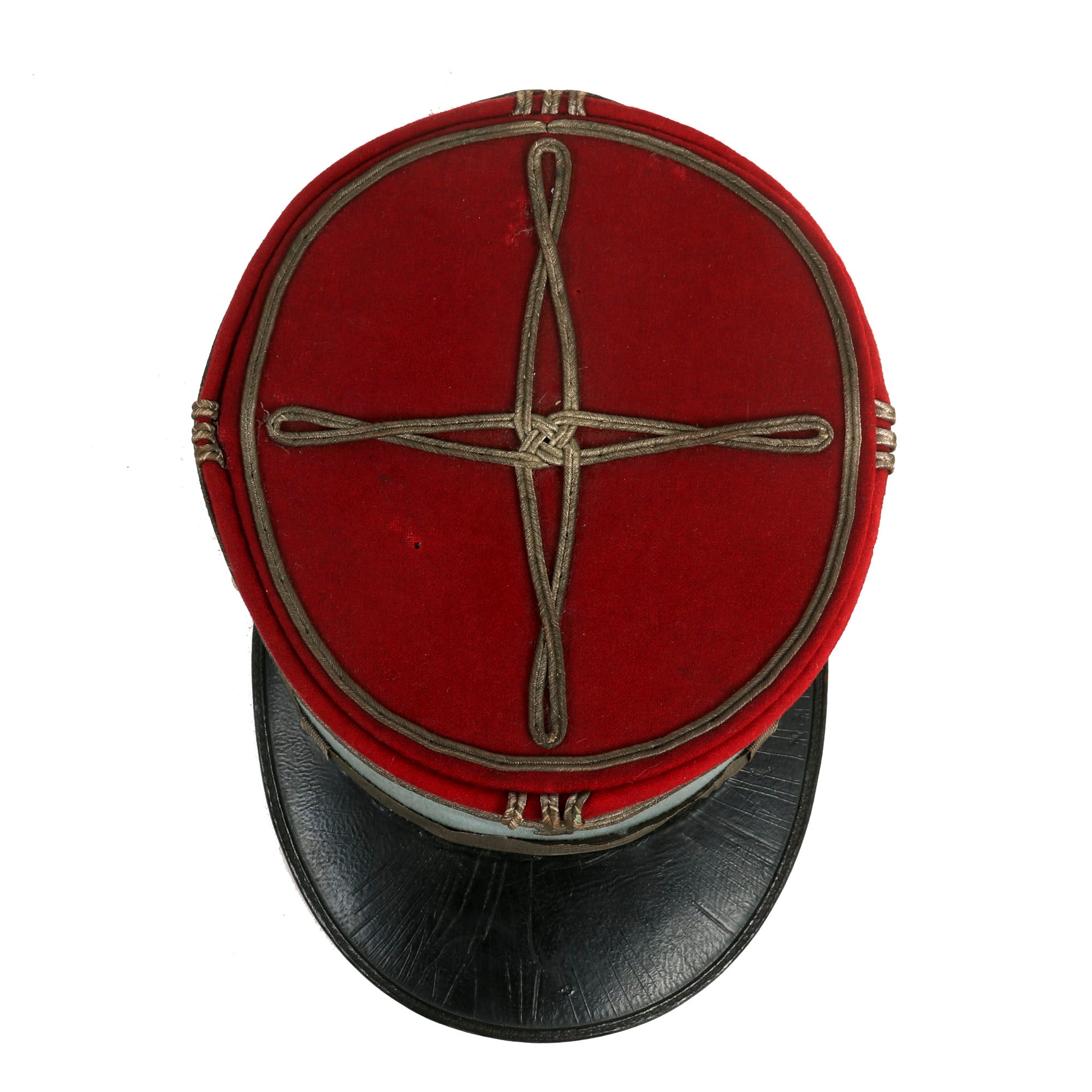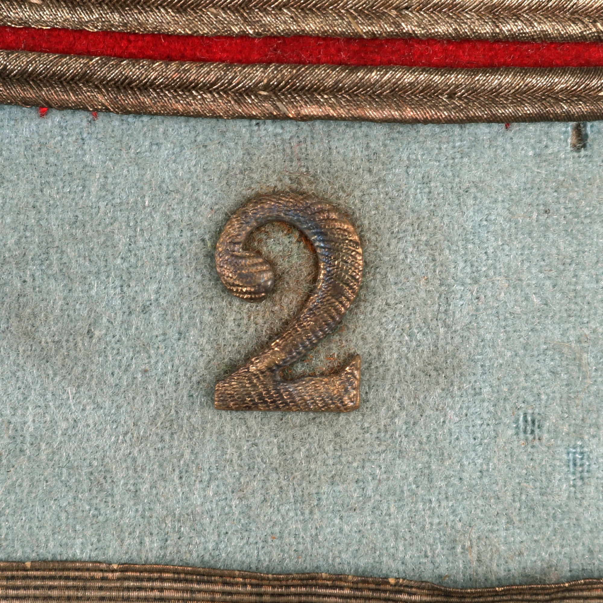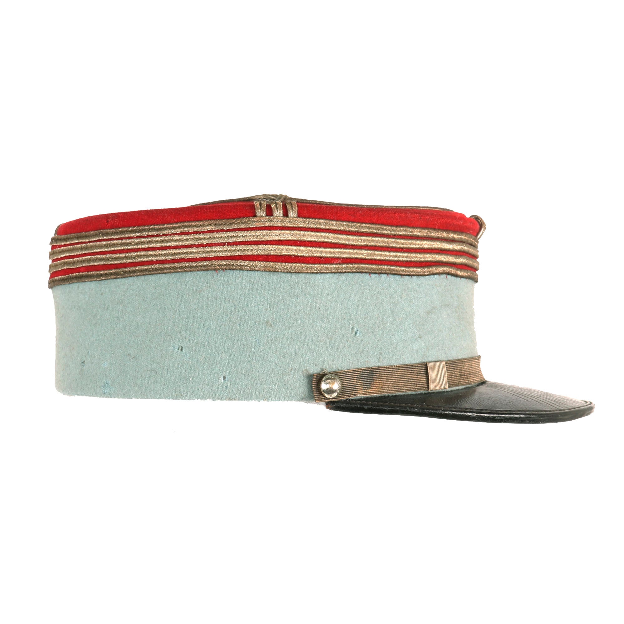 World War One French Infantry Officer kepi in excellent condition. This is the lower height style kepi they first started using after phasing out the floppy or "bummer" type kepis. This style was only worn for a short time during WWI into the early 1920's. The front features a number 2 for the 2nd Hussars. This example kepi is high quality and most likely a private purchase. It was issued to an officer with a bullion cross design to the crown. Interior has a leather sweatband with no maker marks present.