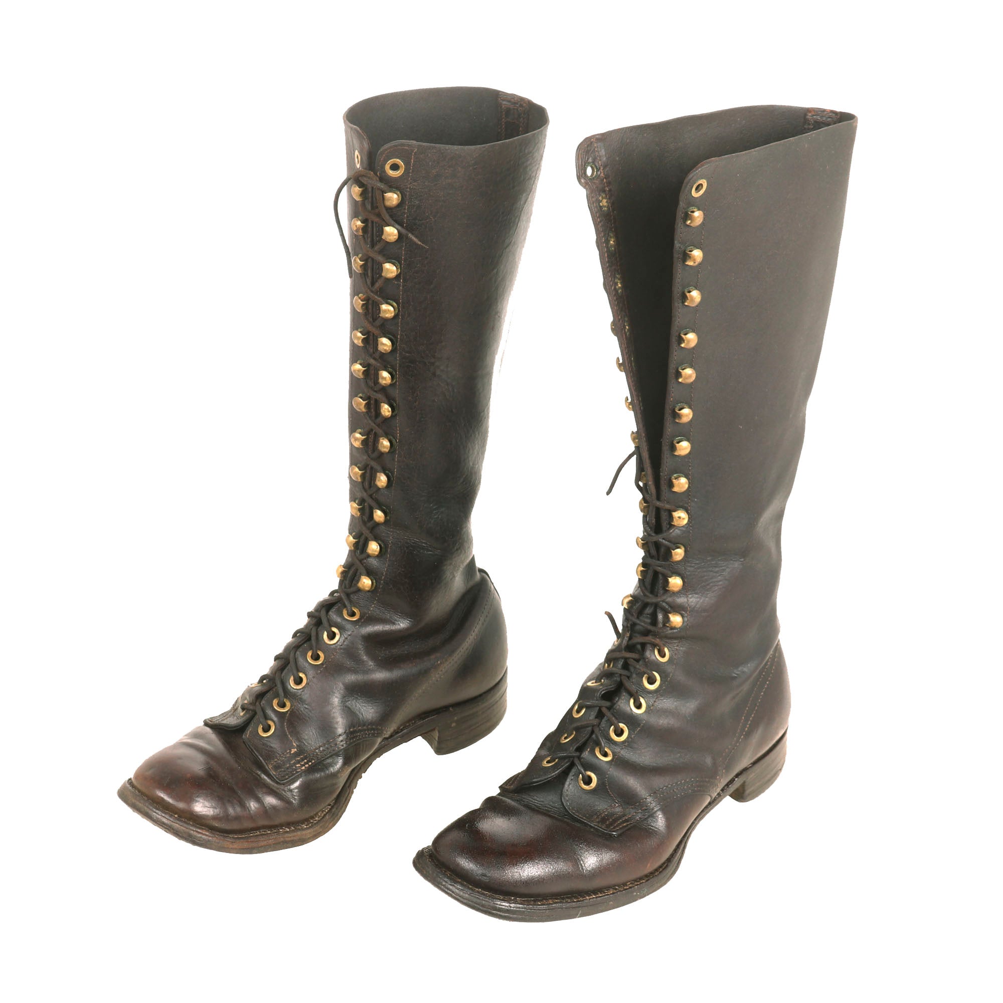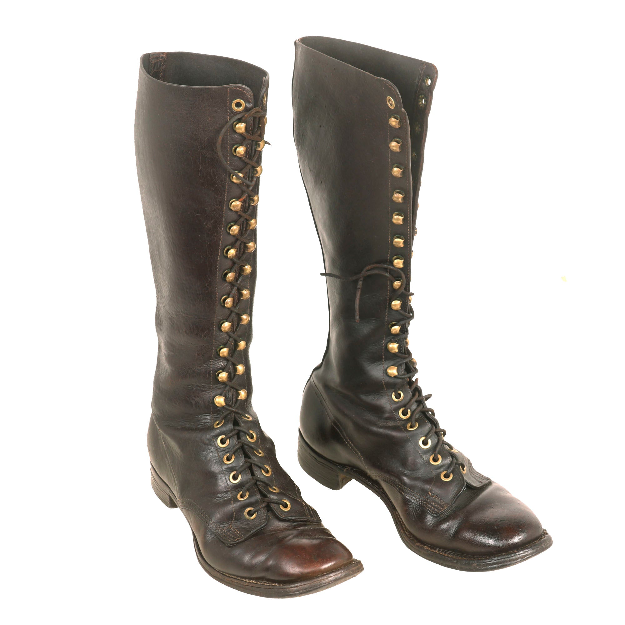 - French WWI knee height leather boots. As the extremities of the human frame, the hands, fingers, feet and toes, generally suffer more from cold exposure, it was these areas that needed to be adequately protected. The WW1 issue of knee or thigh boots, often worn with socks with multiple loose layers of silk and wool were superseded by the 1930-pattern boot; a knee length, light brown suede-boot lined with sheepskin with a rubberised section covering the foot. This rubberised covering prevented the lower areas of the boot absorbing water when traipsing across the apron to the aircraft and the water subsequently freezing in flight. While these boots aren’t the later produced 1930 pattern, the types of boots offered here still provided the pilot with an adequate amount of protection and warmth while in the skies. They are in wonderful condition and constructed entirely of leather without any lining. They are still structurally sound with a great appearance.