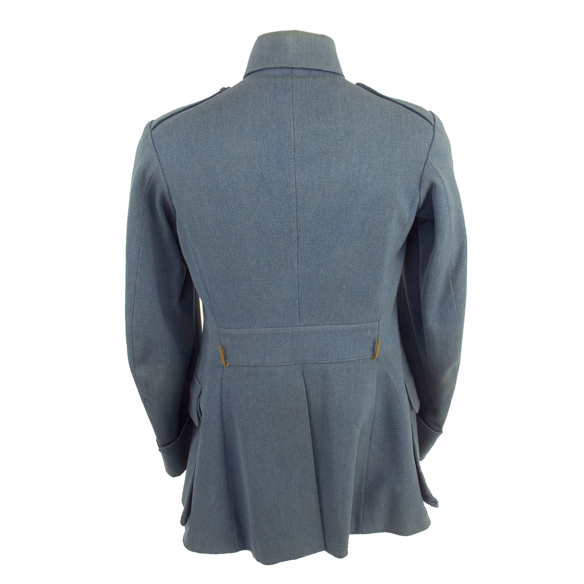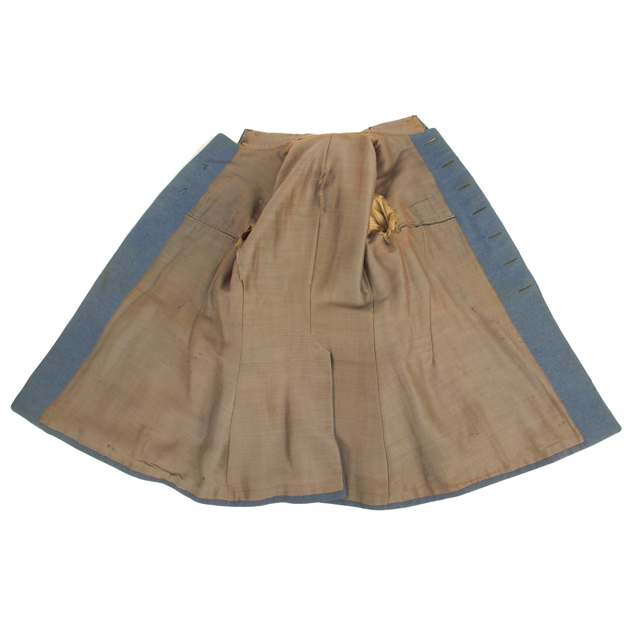 This is a very nice condition Horizon Blue Wool Uniform set of tunic and trousers issued to an Artillery Sergeant in the 31st Army Corps during World War One. The uniform featured red felt collar tabs with bullion embroidered 31 insignia, double triangle bullion line insignia indicating the rank of Sergeant. Bullion sleeve rank insignia, Artillery brass buttons and a makers late which is quite faded on the interior. The trousers feature wide red felt strips down the outside of each leg. Overall condition is very good.