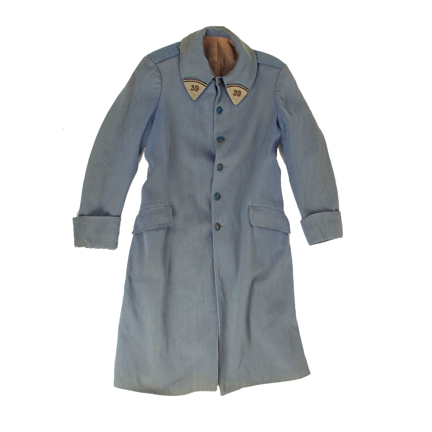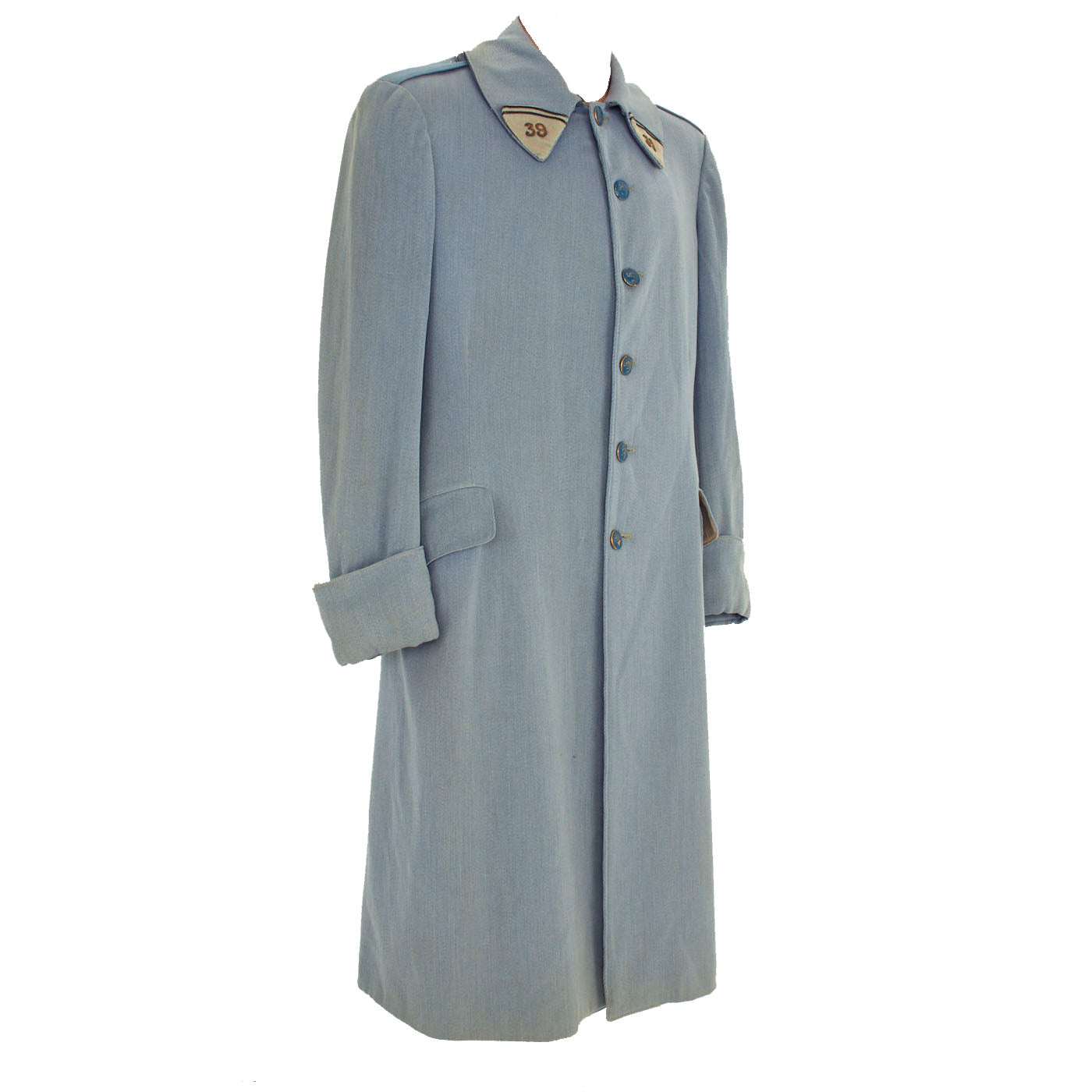 This is one of the best French greatcoats we have had! This nice condition greatcoat consists of a single breasted horizon-blue gabardine wool that appears to be either a transitional model 1914 or a very early one. The coat features 39th Infantry Regiment collar tabs, six brass painted “flaming bomb” buttons. The interior lining is also in fantastic condition with wear present but nothing damaging. There appears to have been a tailor’s tag or name tag present but it was either removed or fell off long ago.