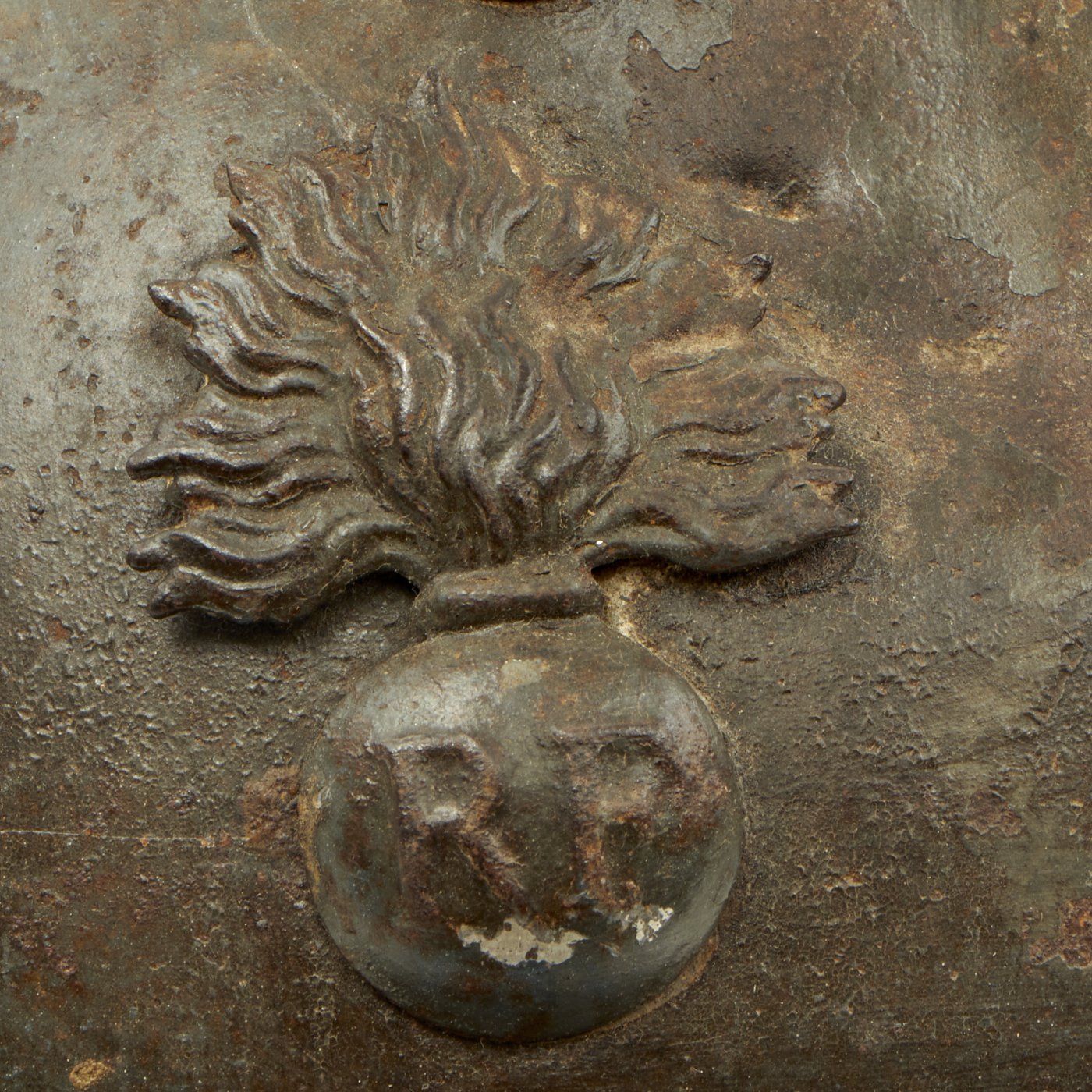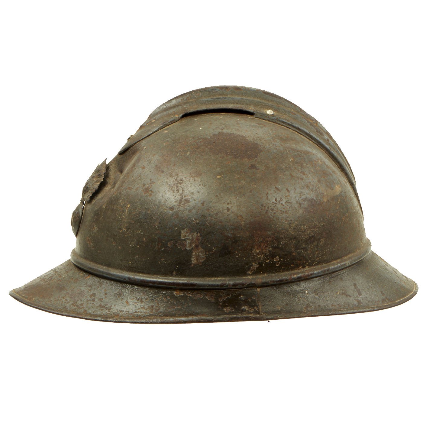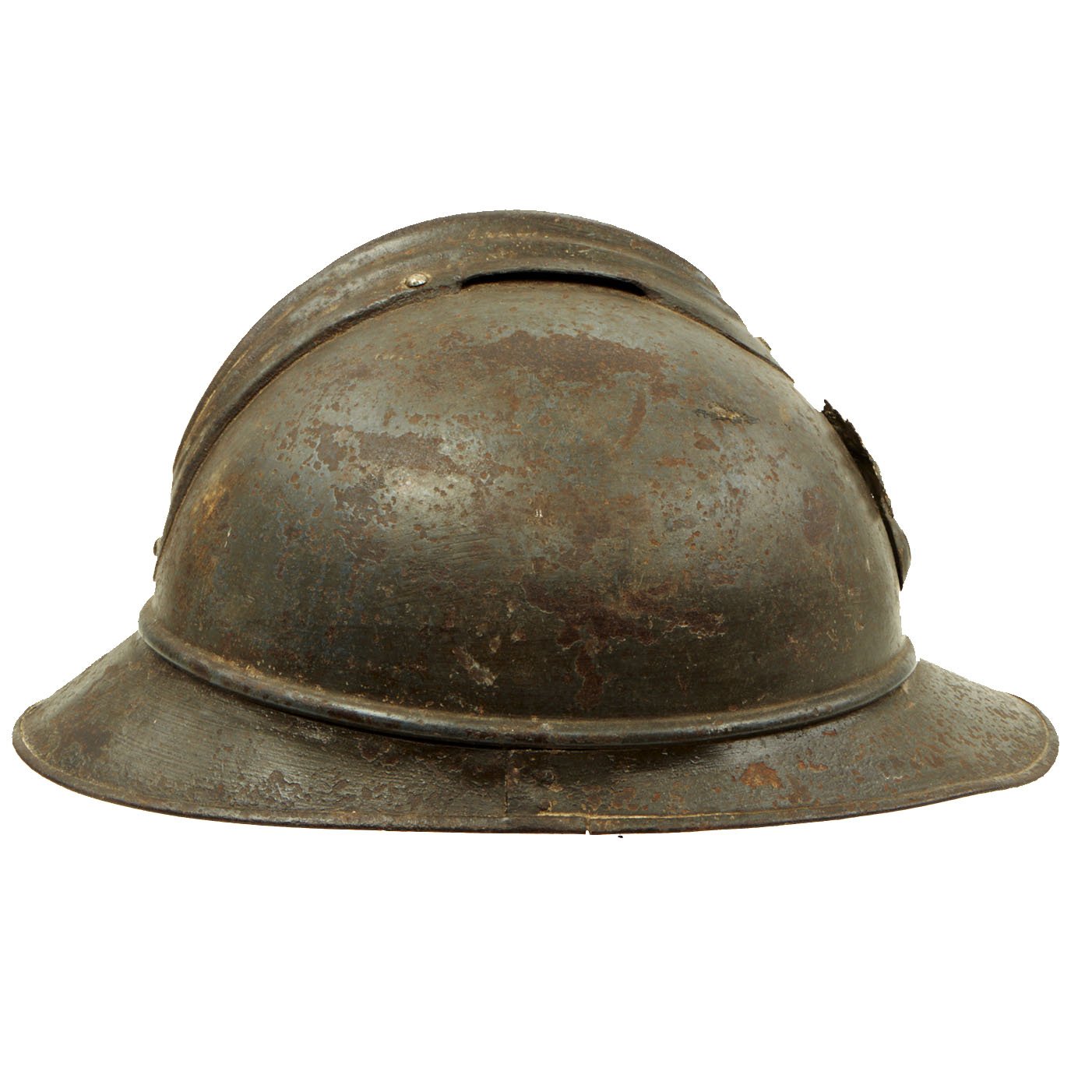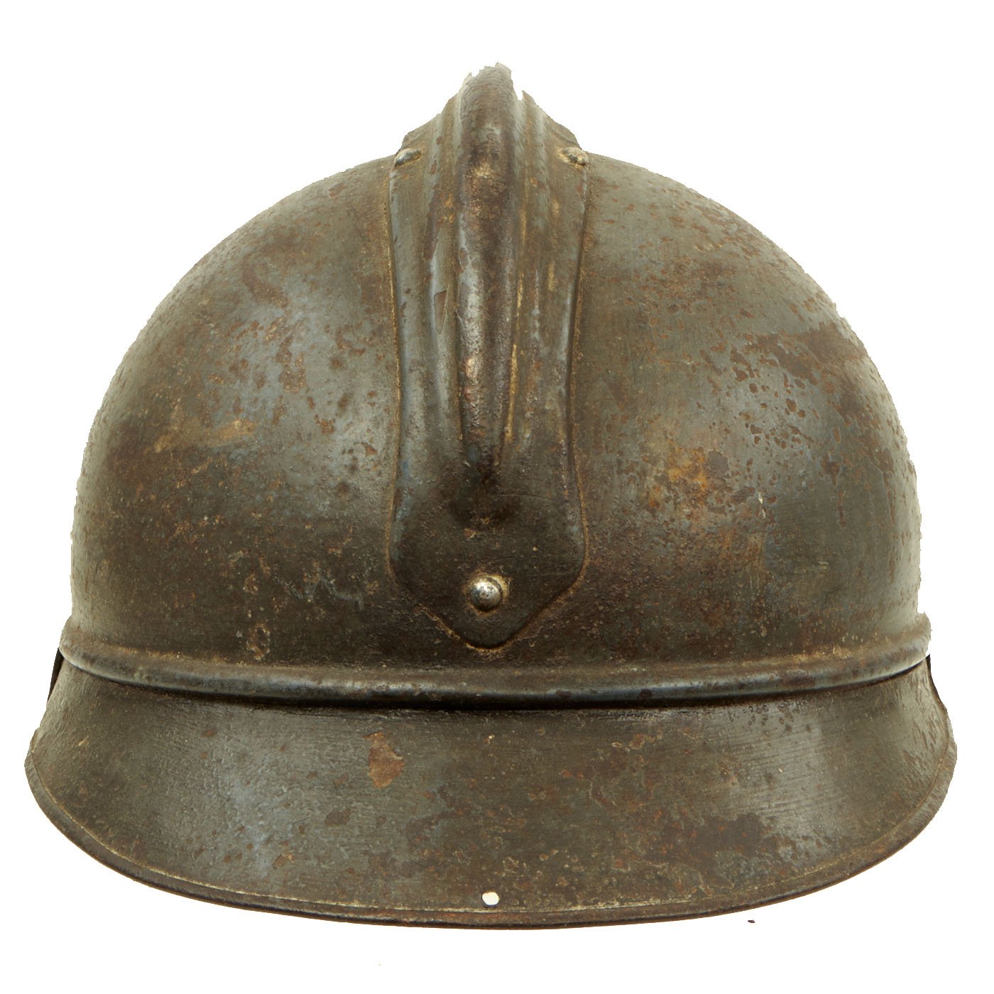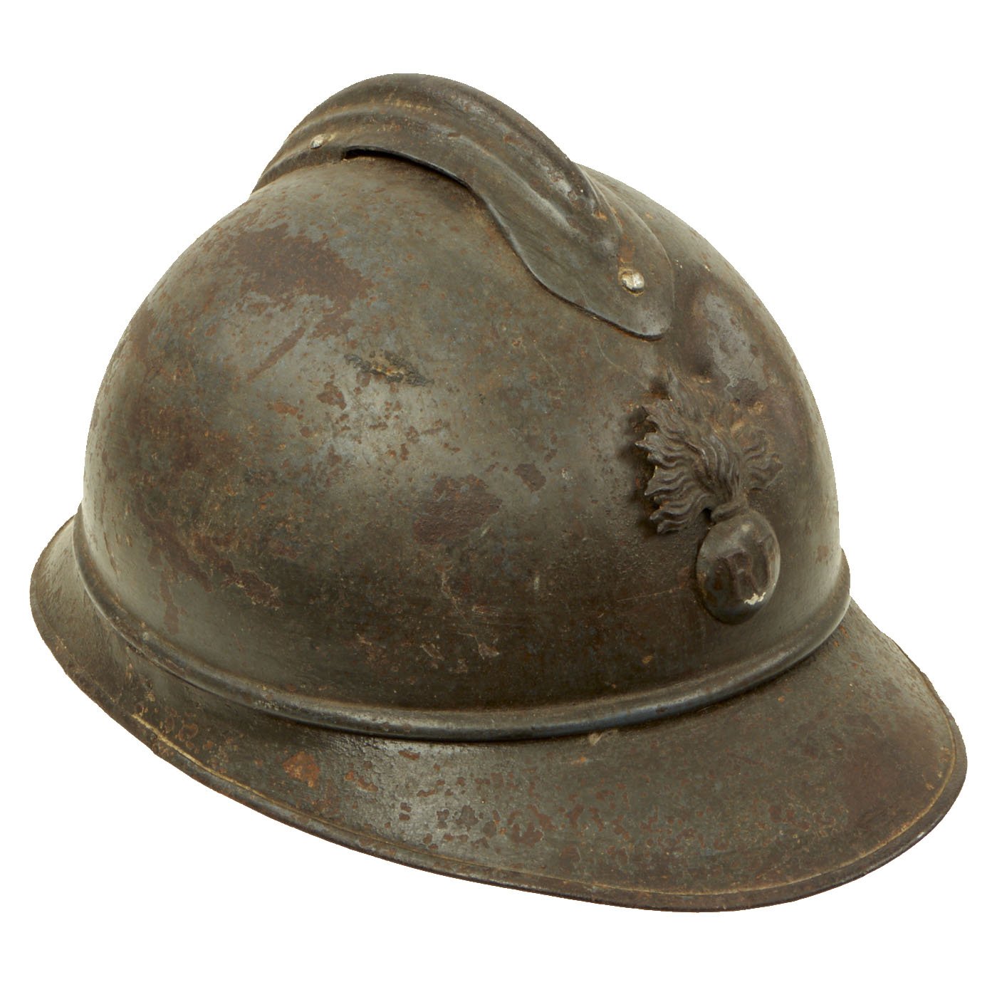 Original Item: Only One Available. This is a nice example of a genuine World War I M1915 French Army "Adrian" steel helmet. The helmet retains trace amounts of the original "dark horizon blue" paint, along with the original French "Flaming Bomb" badge. The badge has the standard R F on the "bomb", for Republique Francaise.