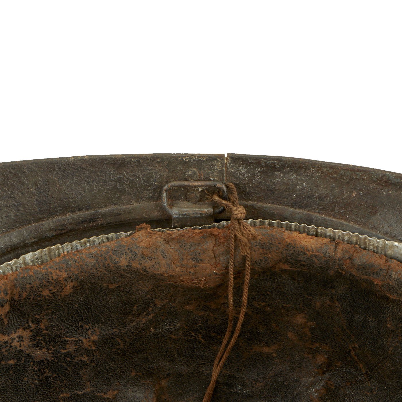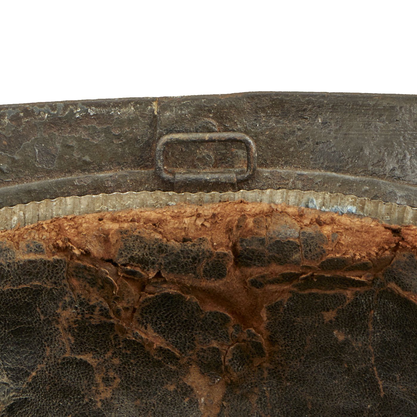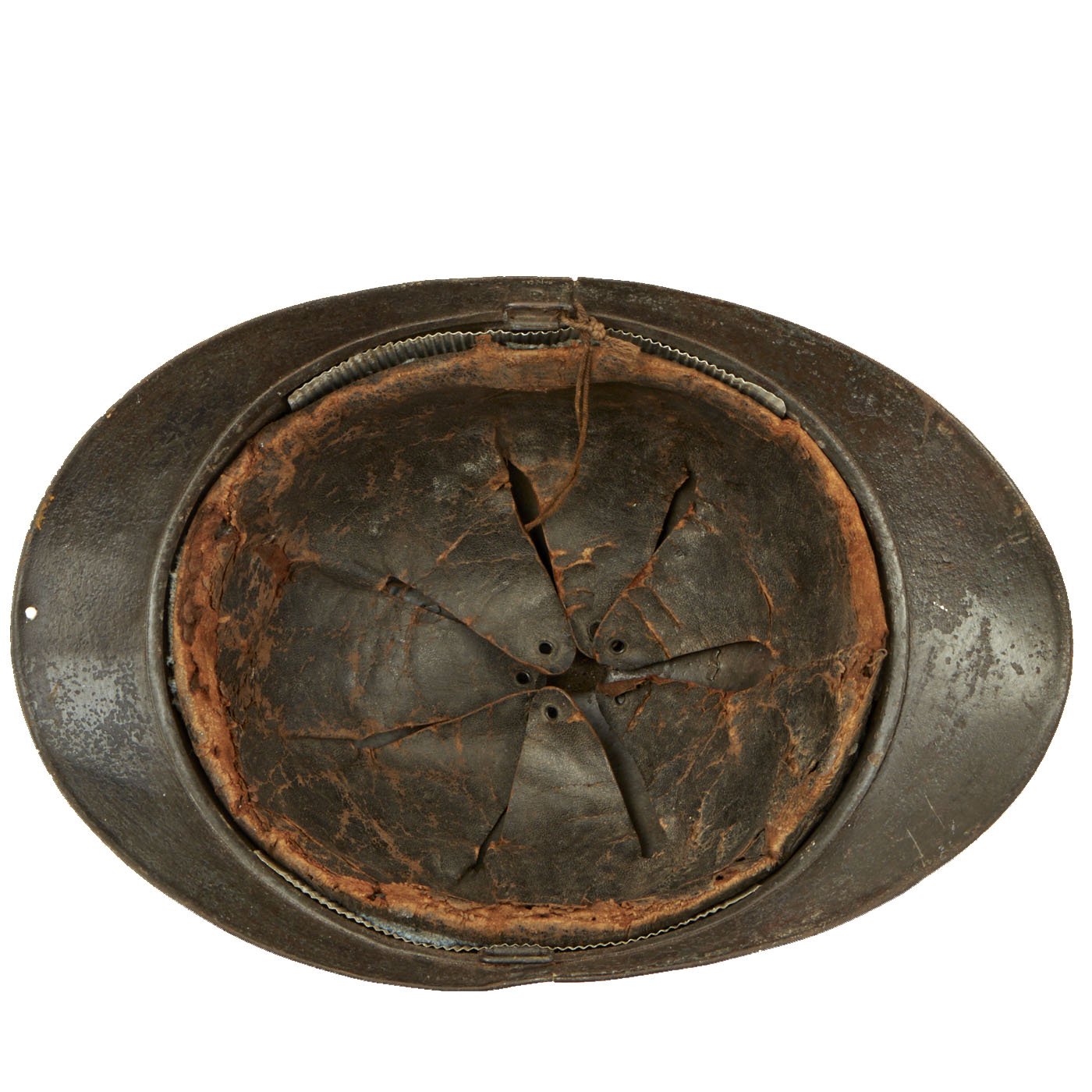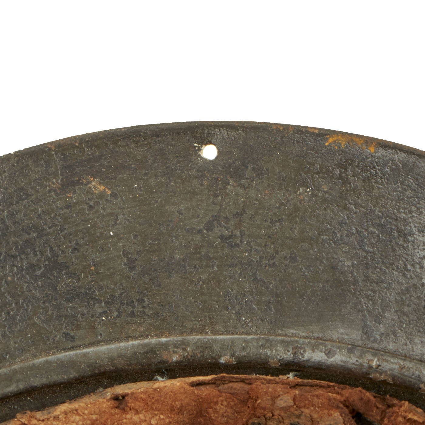 The liner size is approximately US 7 1/4 (58cm). Features a complete original leather liner in poor condition, it is worn, stained and dry from age. The chin strap is missing. Overall condition of the helmet is nice, though it does show its age. The shell shows some minor dings with damage to the left of the RF badge on the front. There are also scratches and heavy paint wear consistent with age and long service.