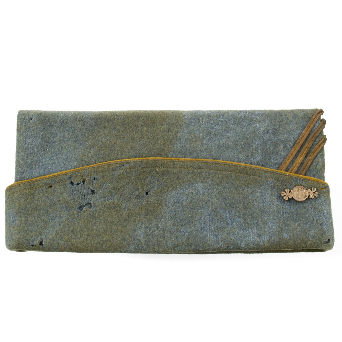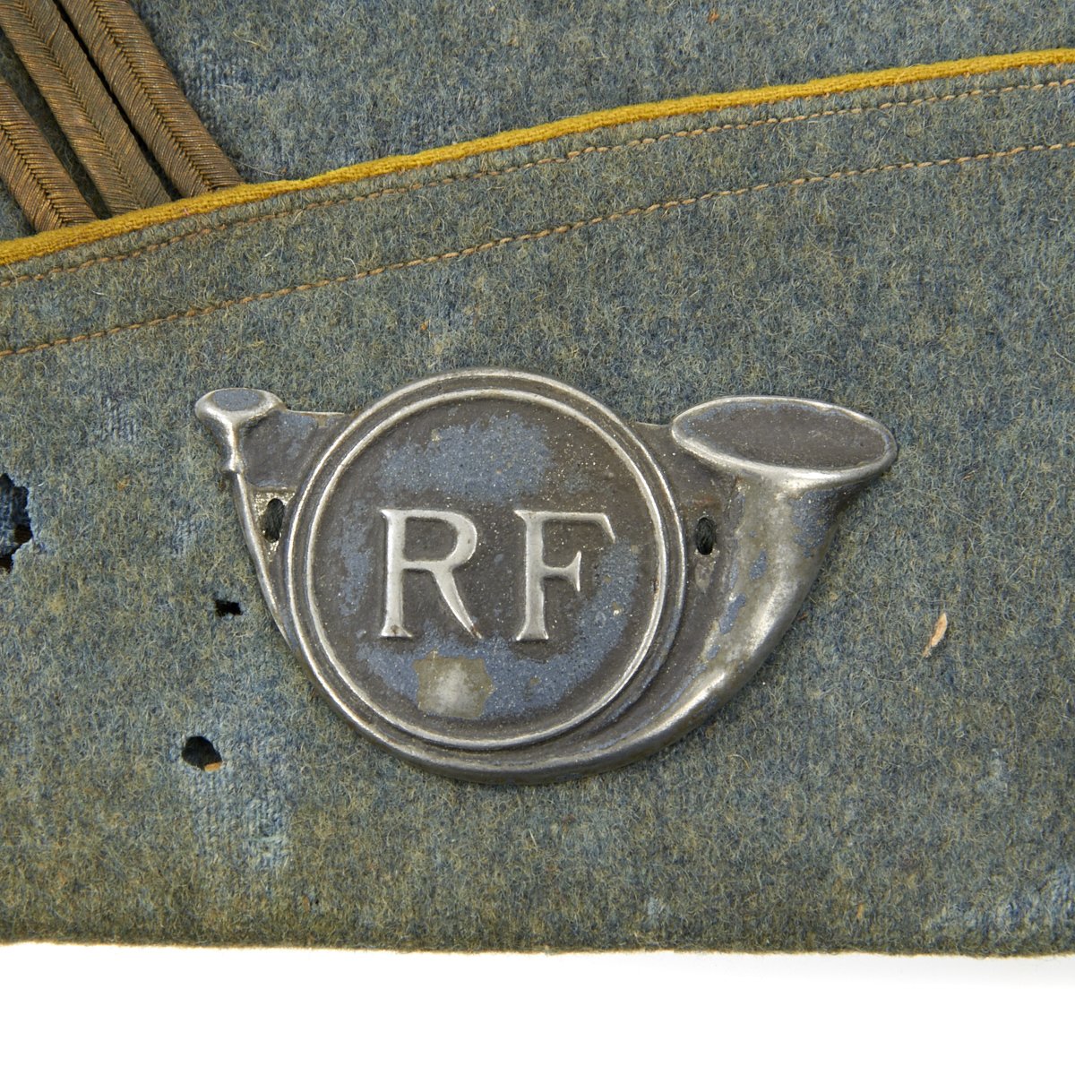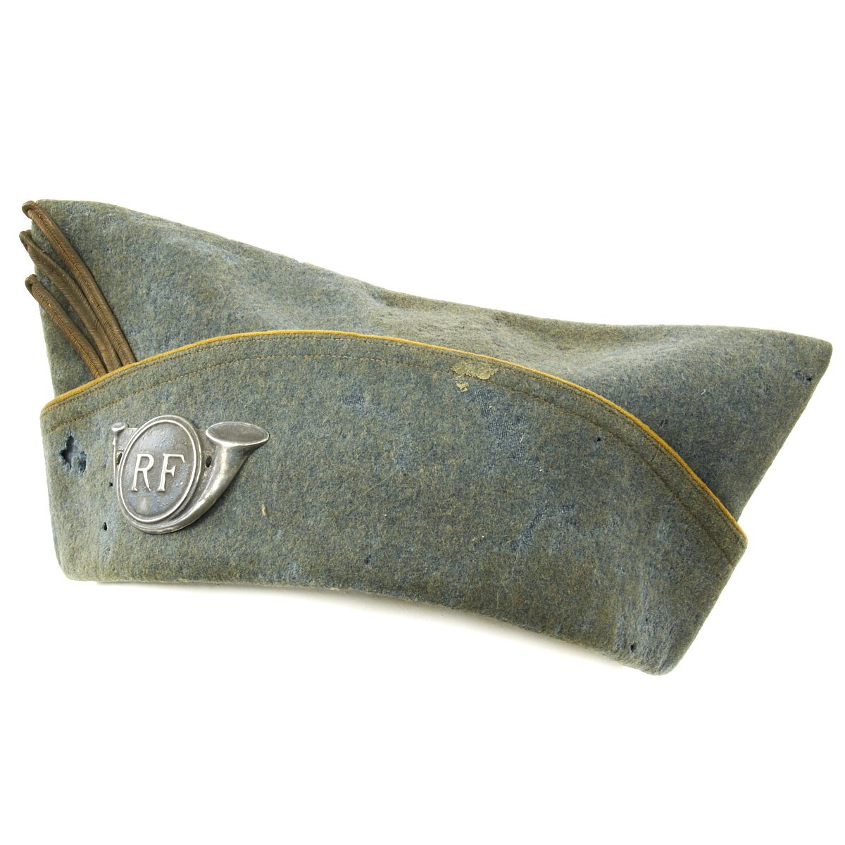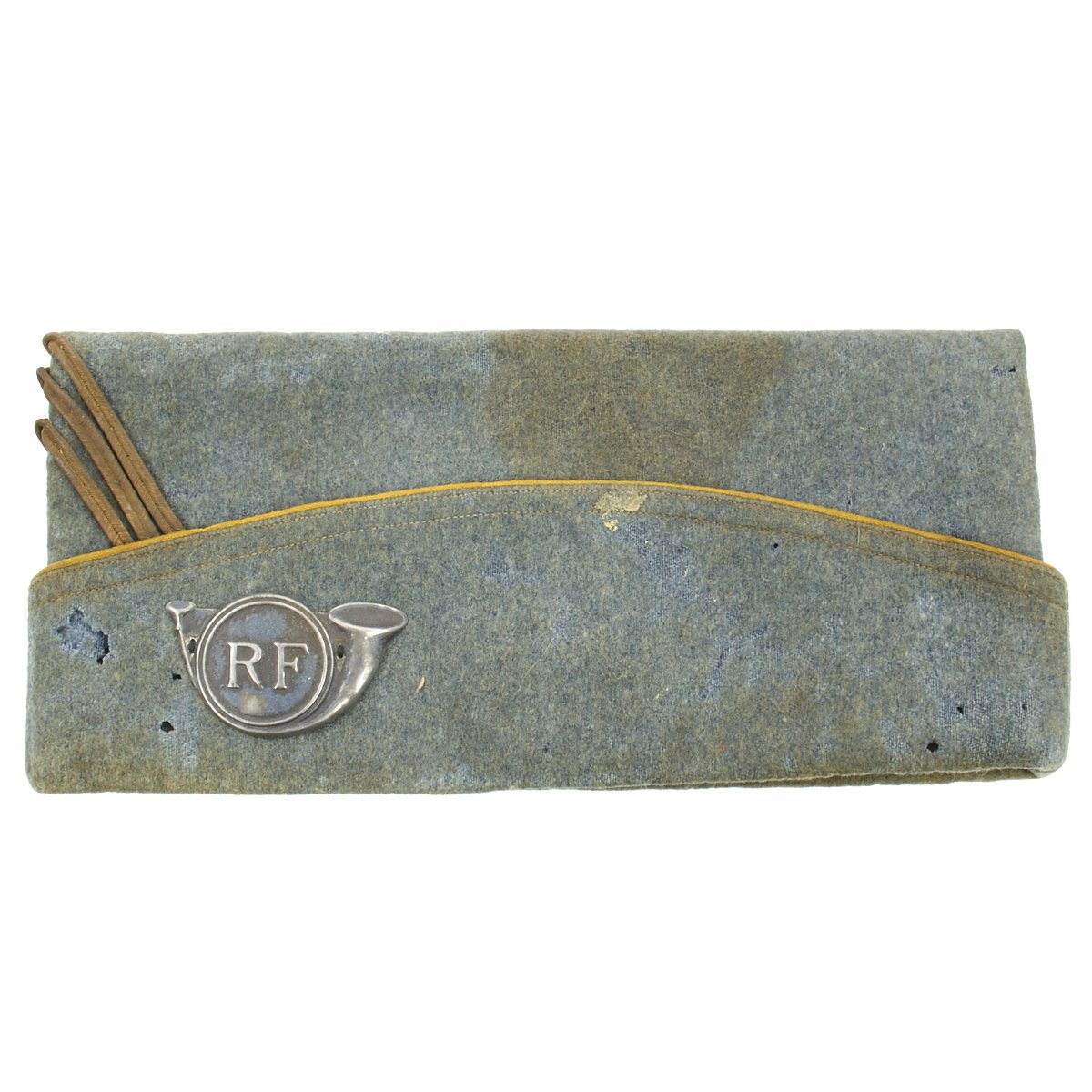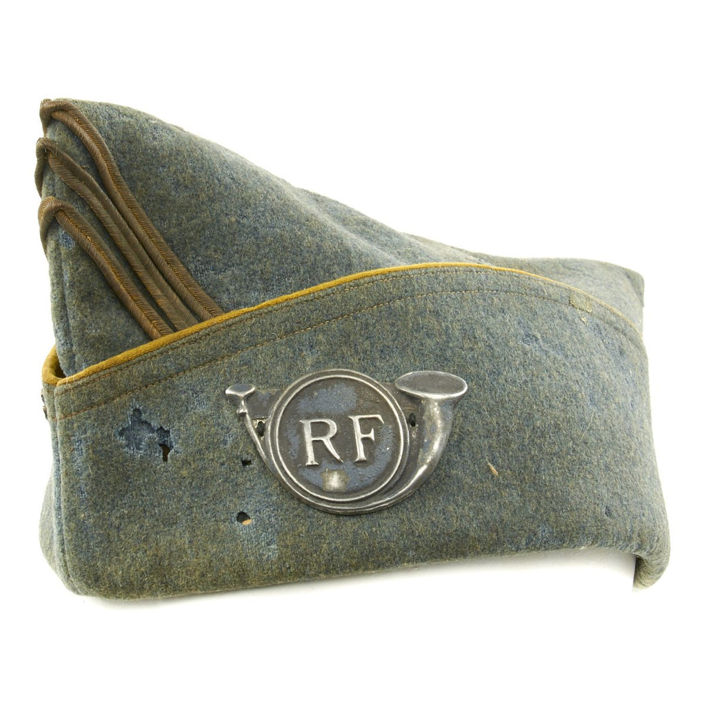 Original Item: Only One Available. This is a blue wool French World War One officer overseas side cap. We believe the three stripes on the front indicate the rank of major. The cap is lined on the interior with cotton. Size is approximately a US 7 (56cm). The front of the cap bears a bugle horn insignia and RF.