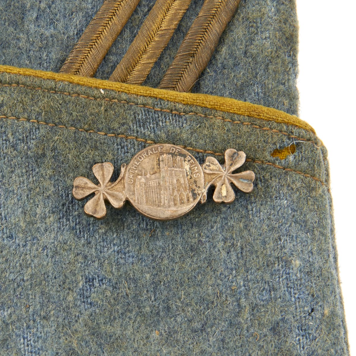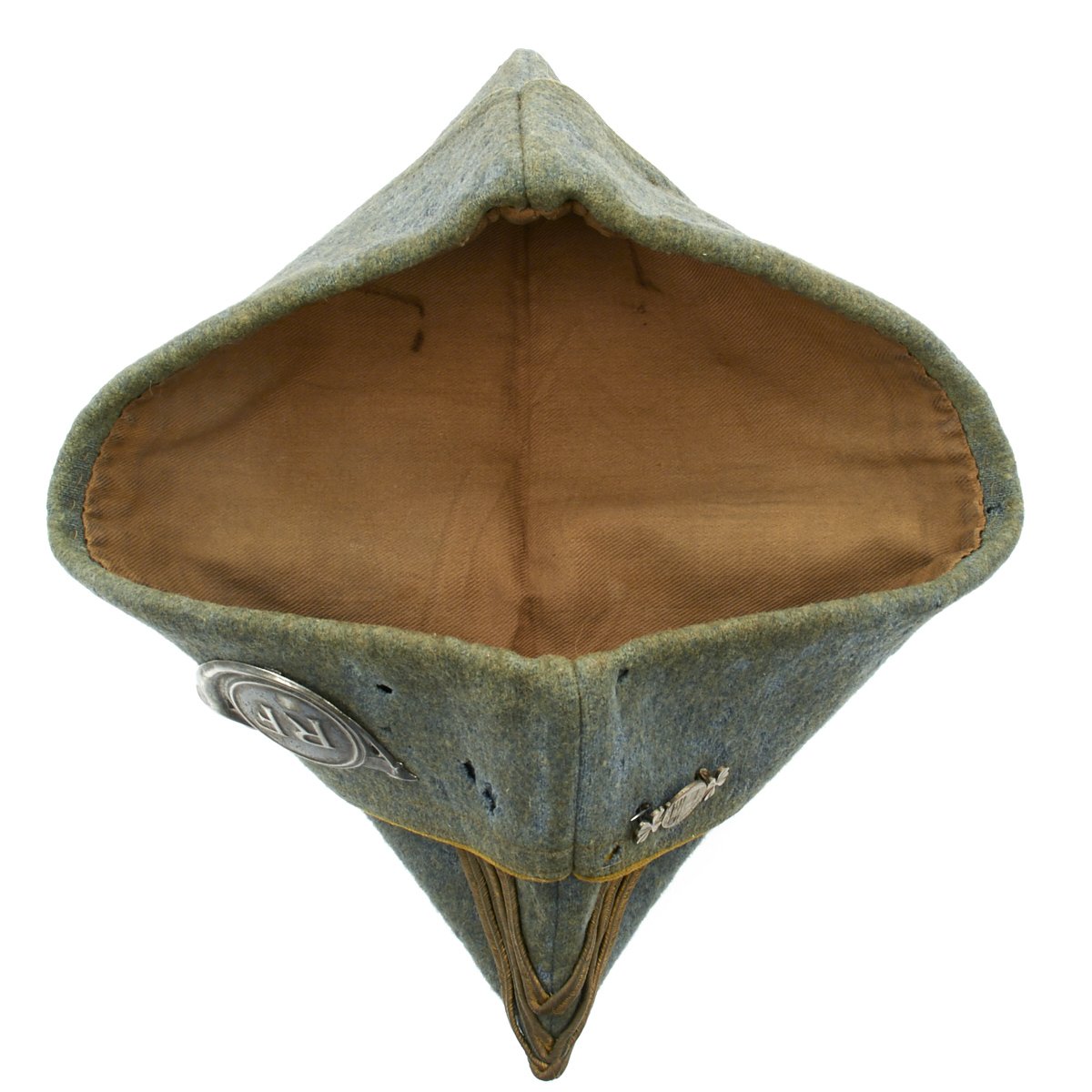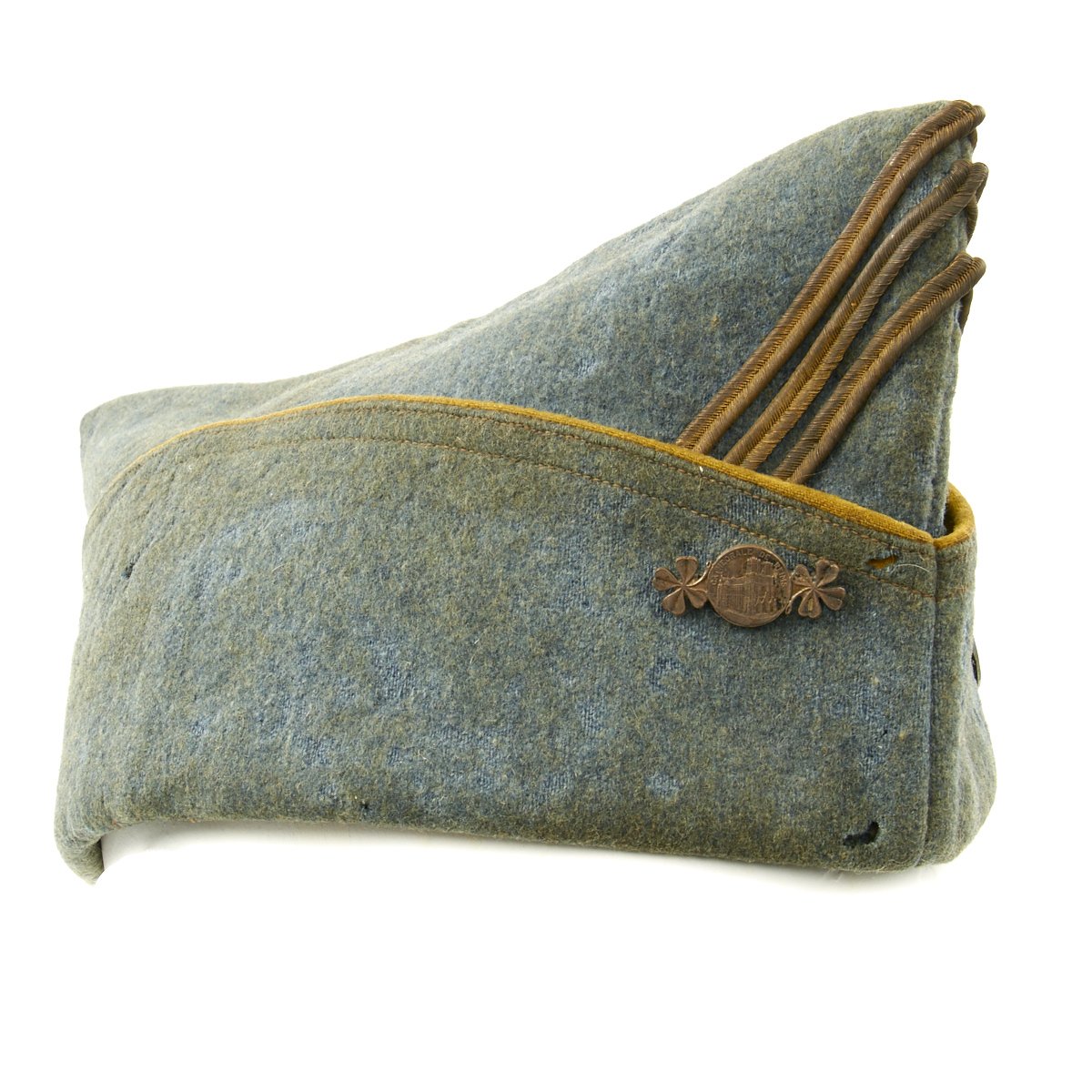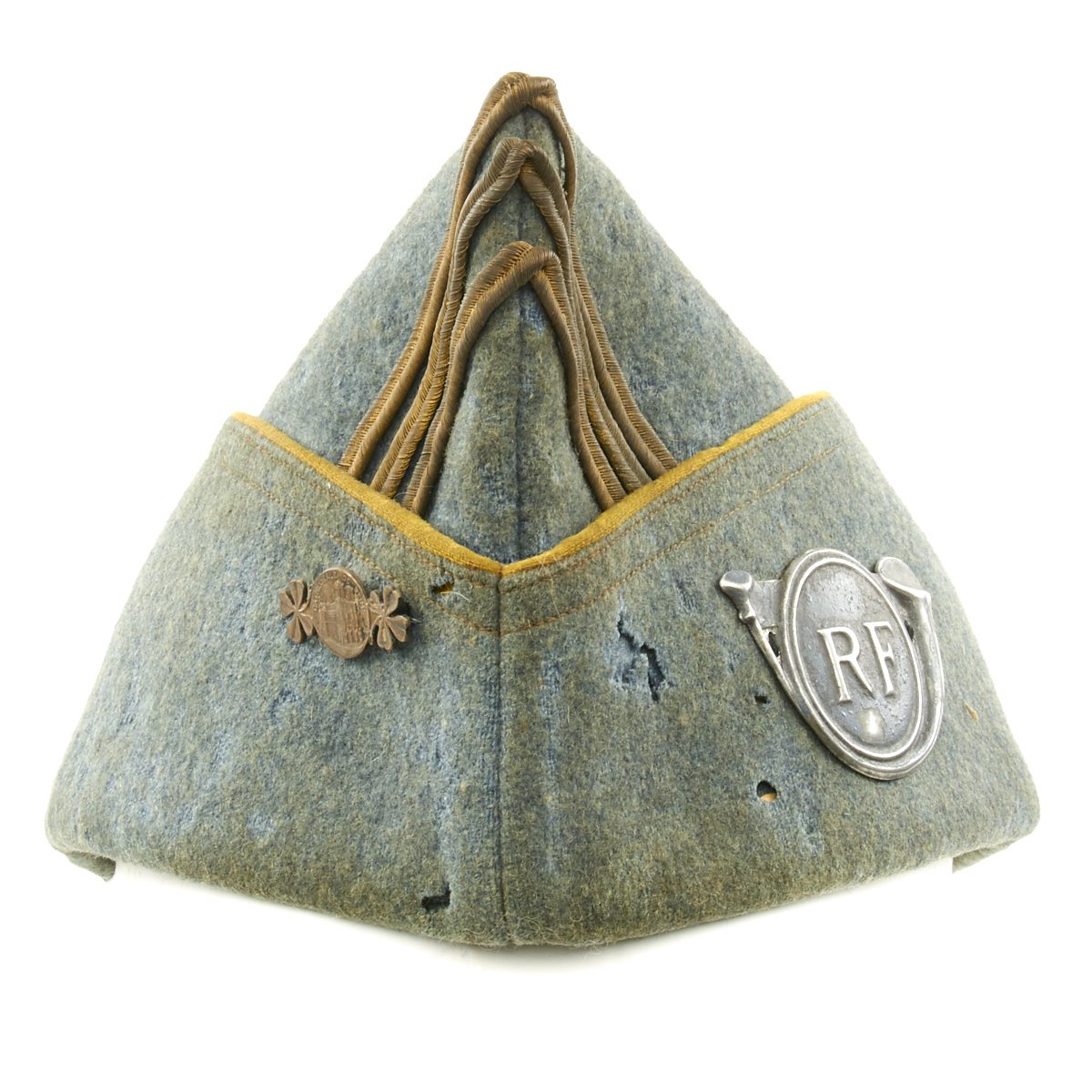 Original Item: Only One Available. This is a blue wool French World War One officer overseas side cap. We believe the three stripes on the front indicate the rank of major. The cap is lined on the interior with cotton. Size is approximately a US 7 (56cm). The front of the cap bears a bugle horn insignia and RF.