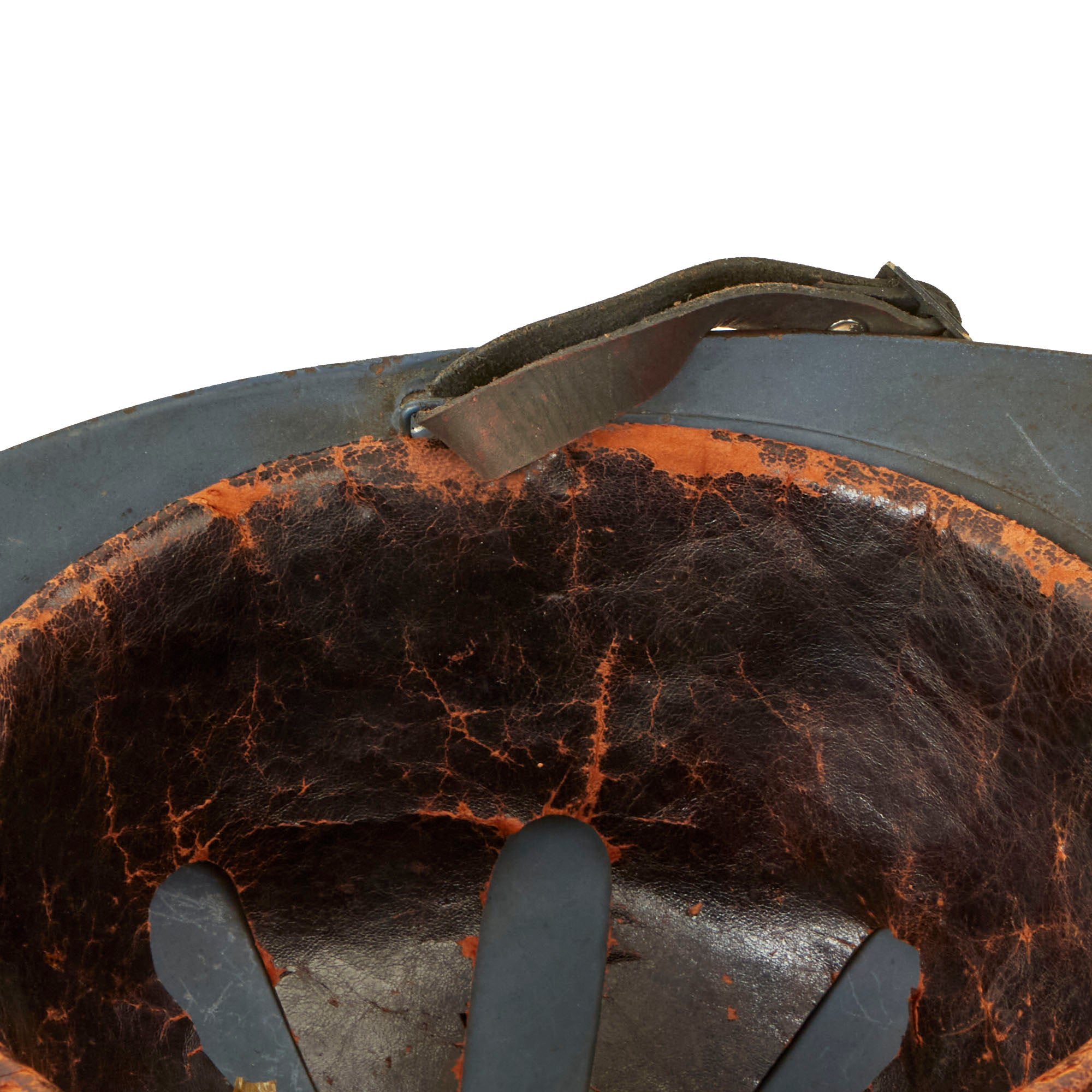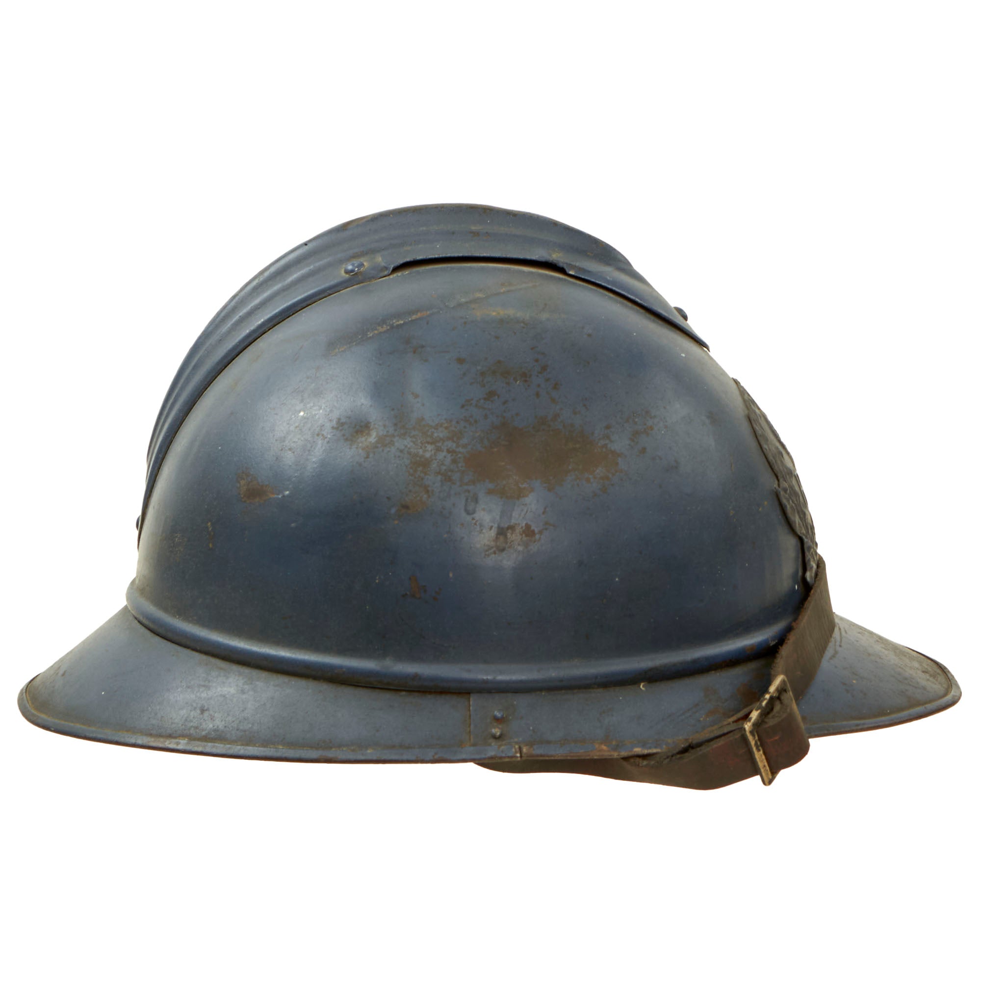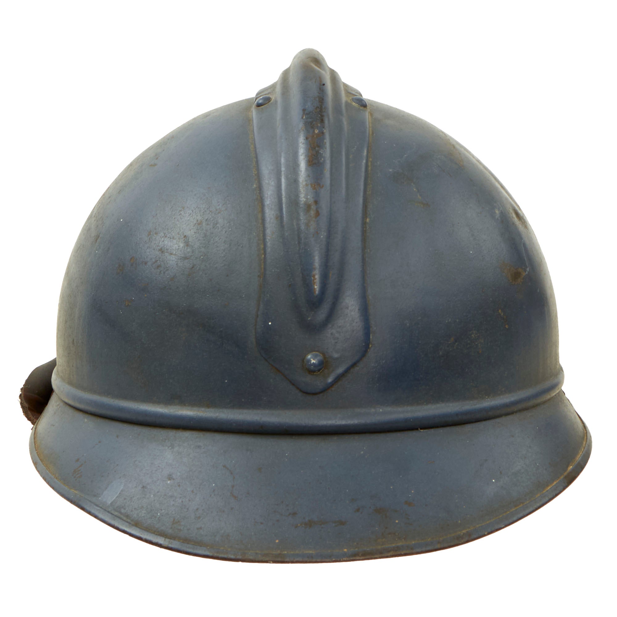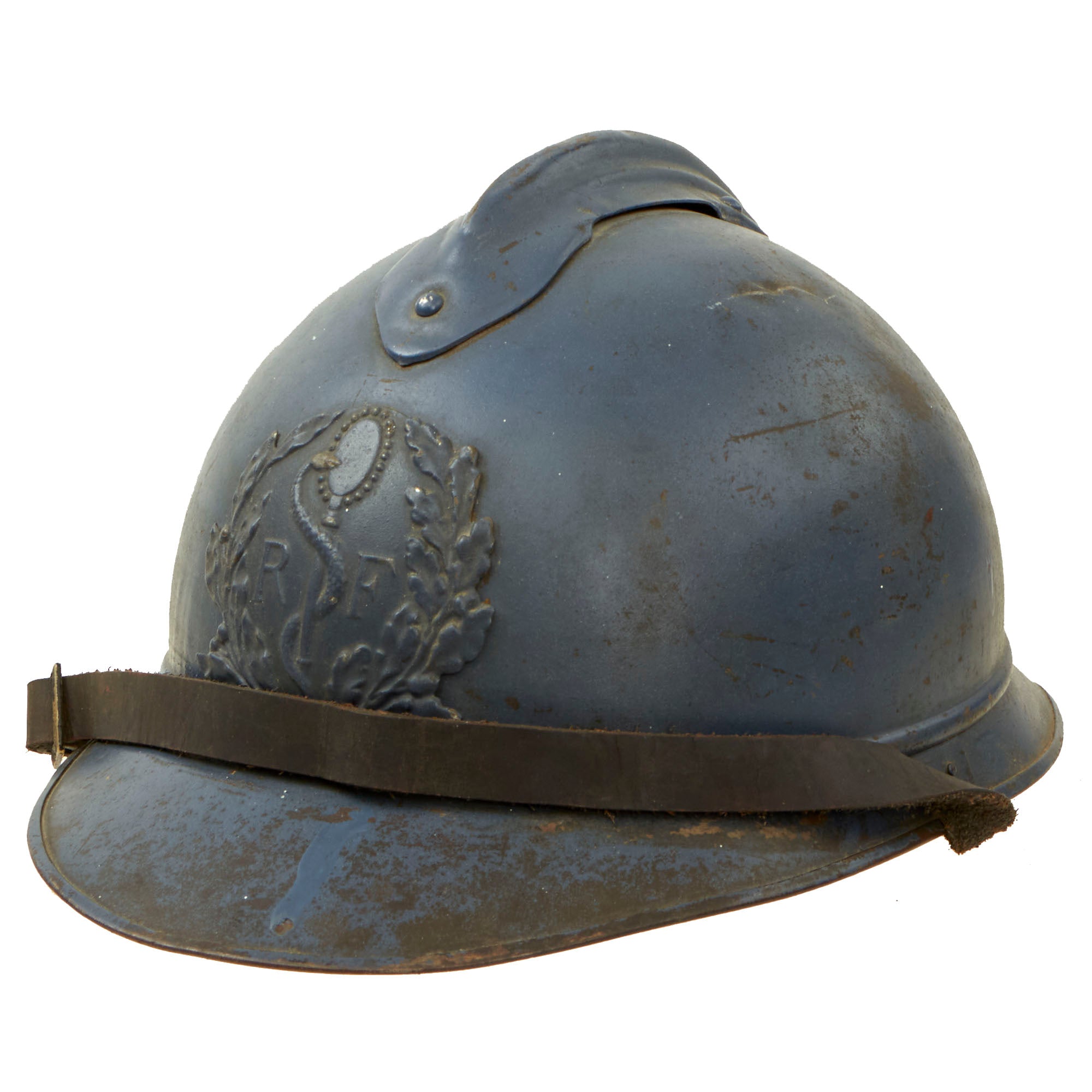 Original Item: Only One Available. This is a very good example of a genuine World War I M1915 French Army "Adrian" steel helmet, outfitted for medical personnel. Medical Adrian Helmets are very hard to come by, especially in original unmolested condition. The helmet retains the original "dark horizon blue" paint on the shell, and was not repainted post war. The front of the helmet still has its original French Medical Personnel badge, which has a half Laurel / Half Oak wreath, with the medical "Rod of Asclepius" in the center. Around this is the standard R F on the "bomb", for Republique Francaise. This is the badge used for Field Medics, Combat Surgeons, and other medical personnel operating in the field.