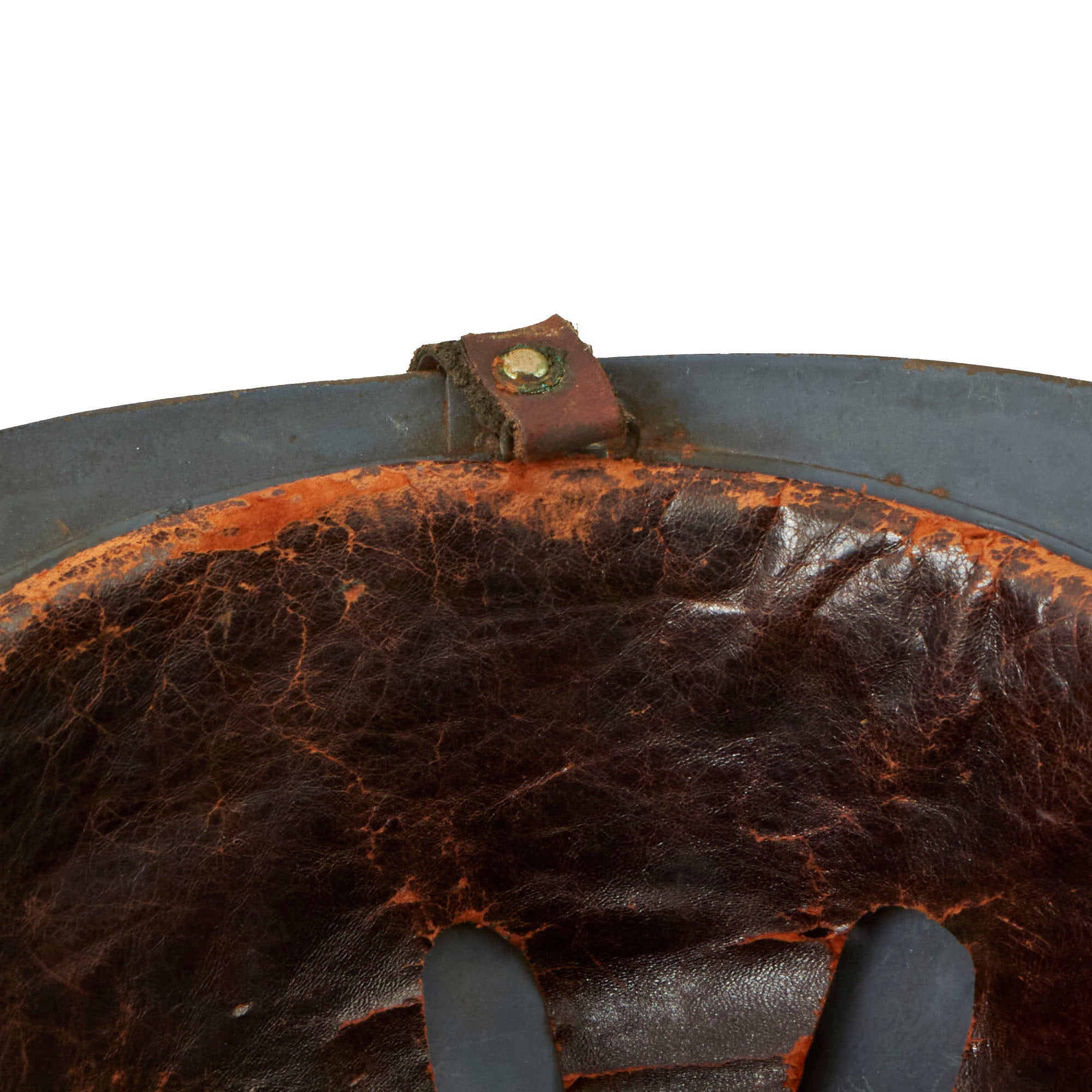 The 1st Pattern leather liner is present, but is definitely worn, with wear in the finish and some gearing in the crown. The leather is still however mostly supple, and definitely has stood the test of time. The original chin strap is present and is a much thicker example.