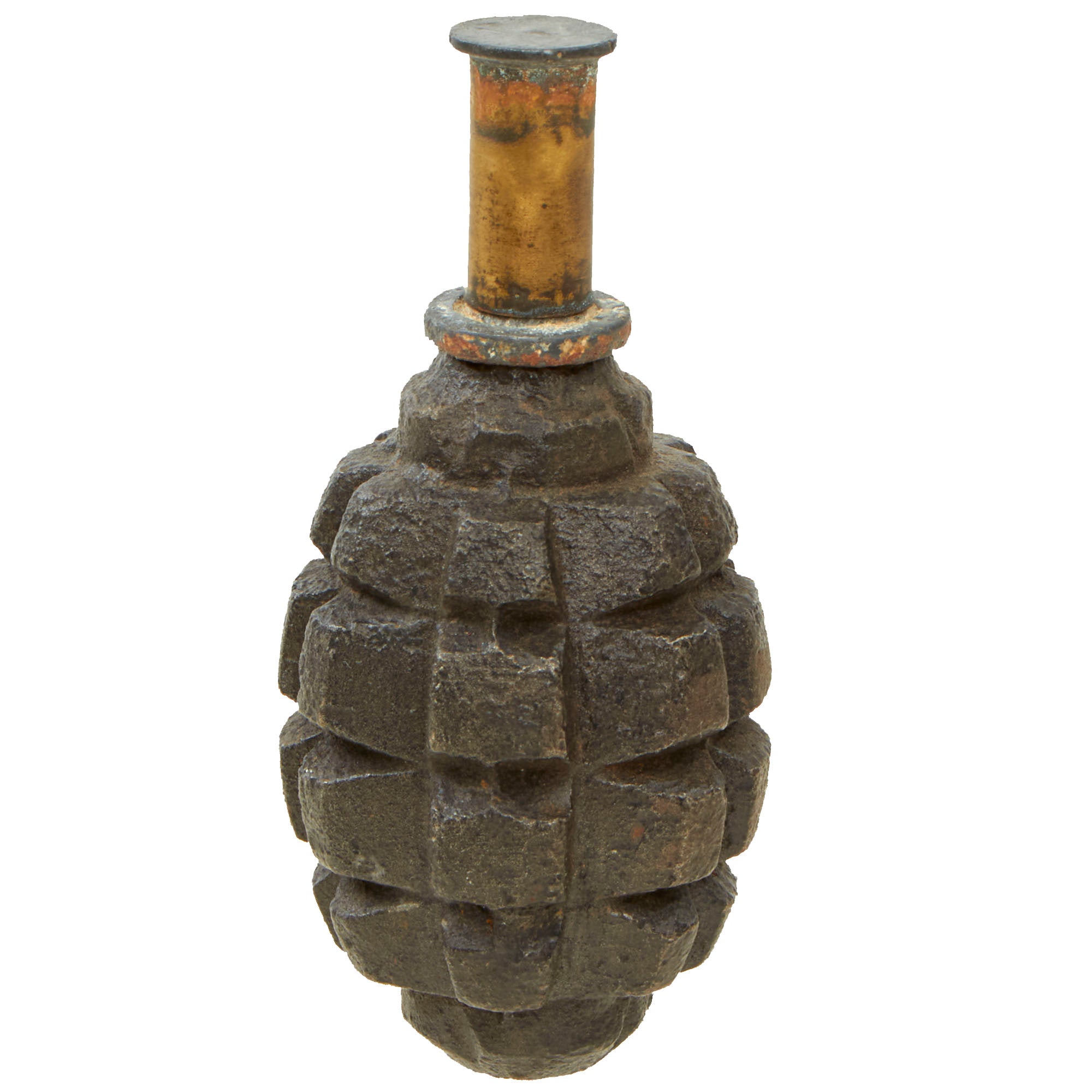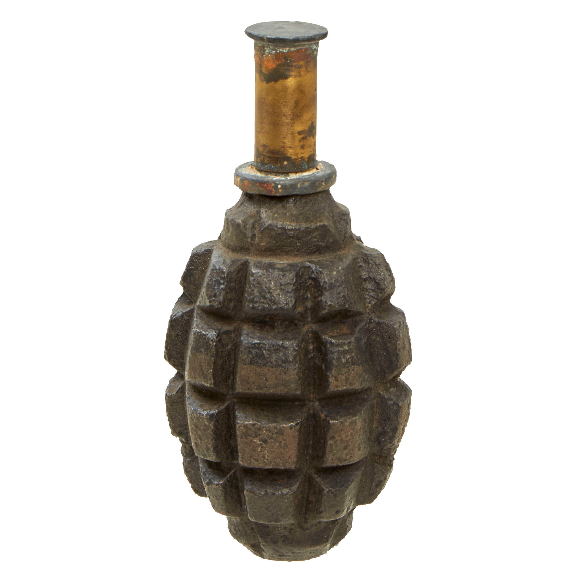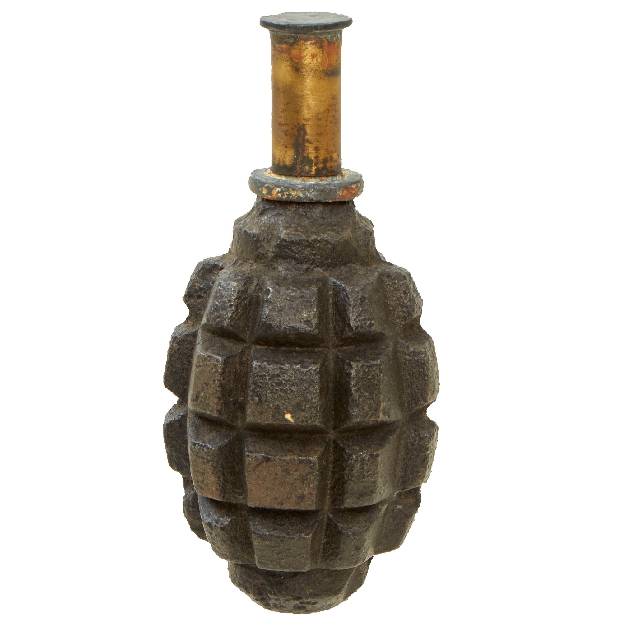 Original Item: Only One Available. This is a totally inert BATF compliant genuine World War One French F1 Grenade with an original fuse and cap. The grenade was rendered completely inert and is unable to be used as a destructive device.