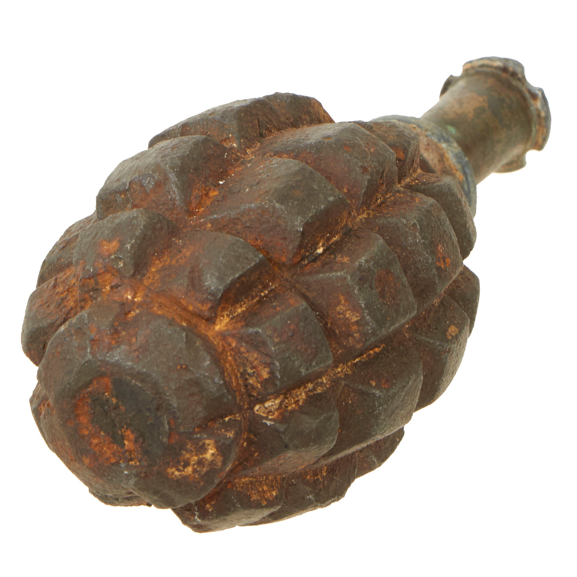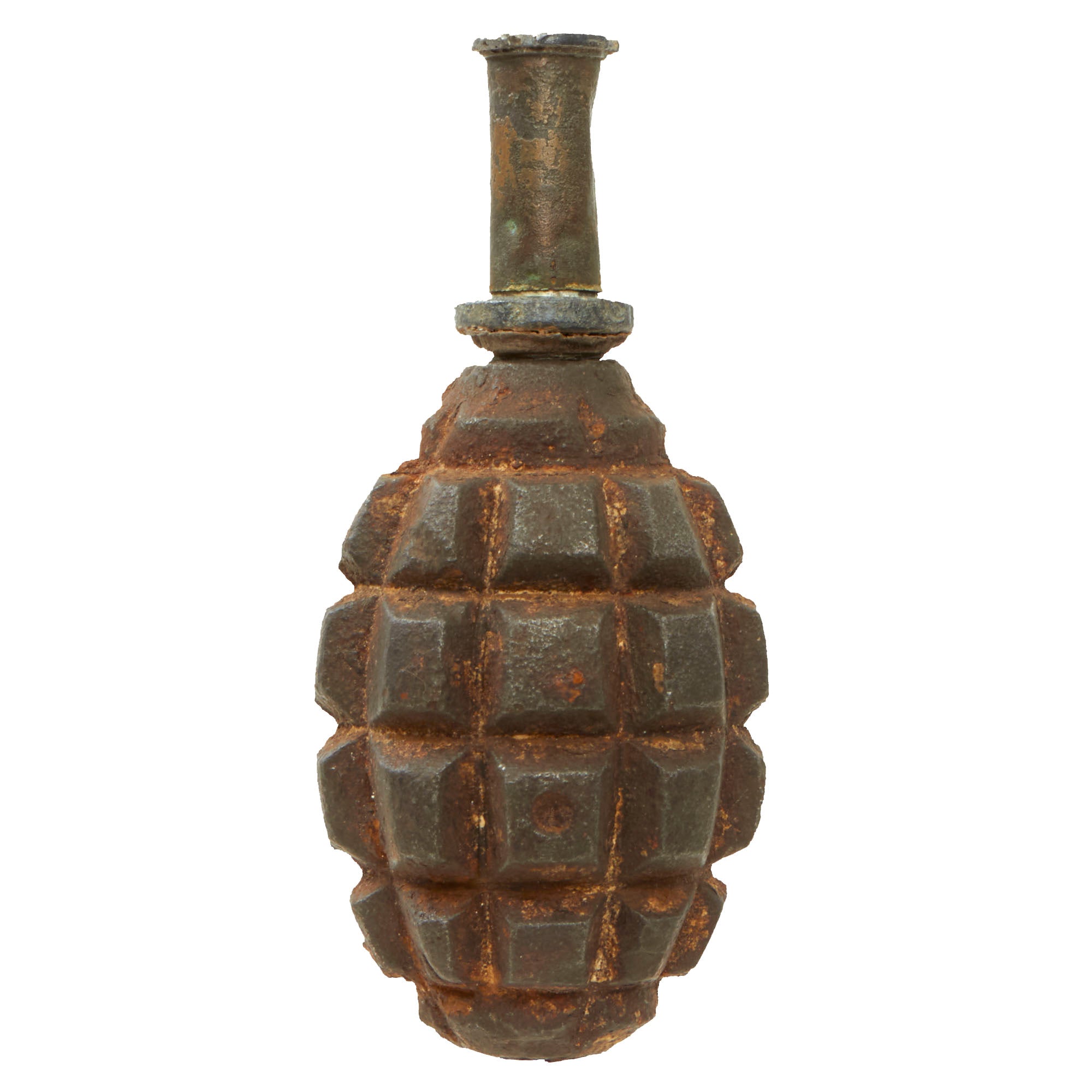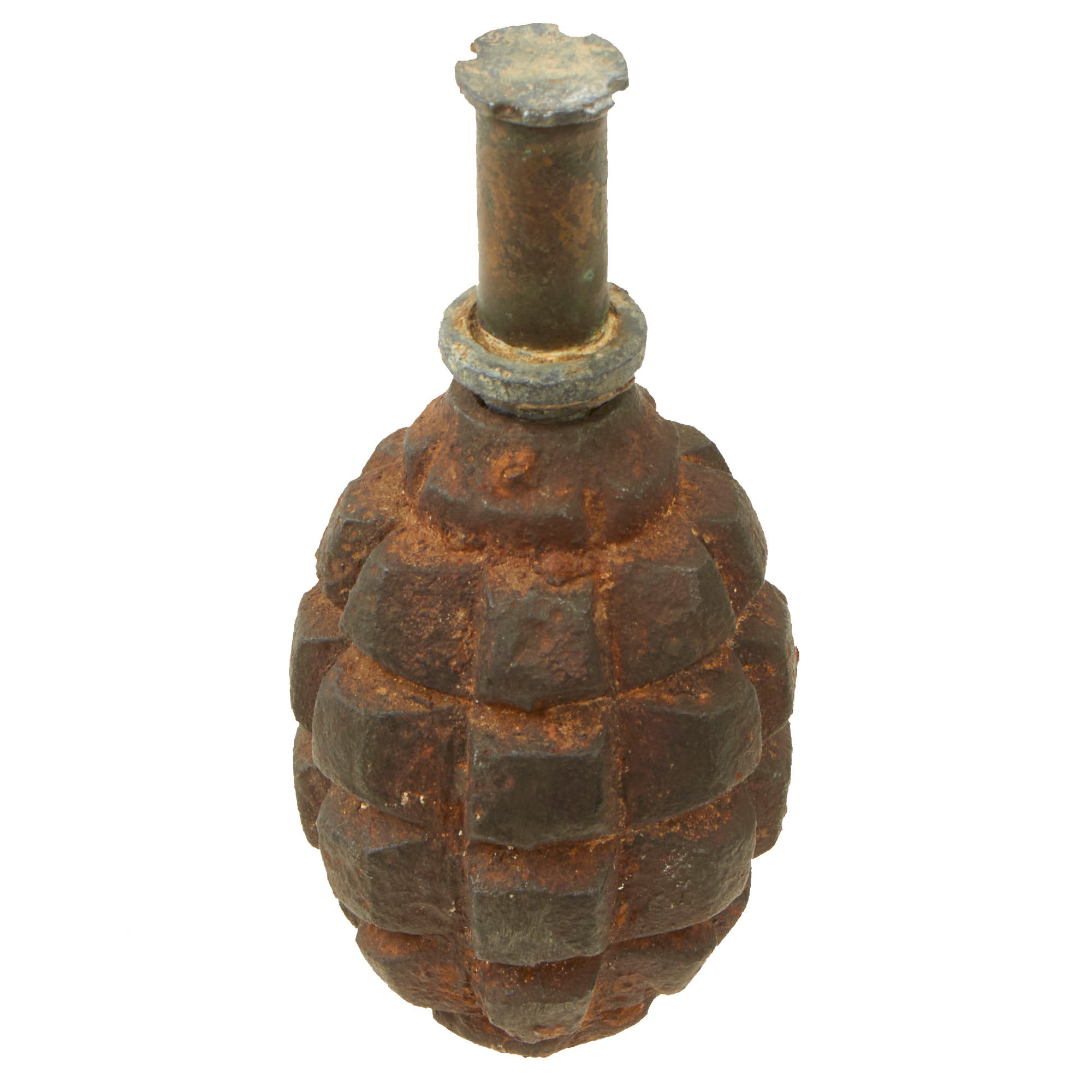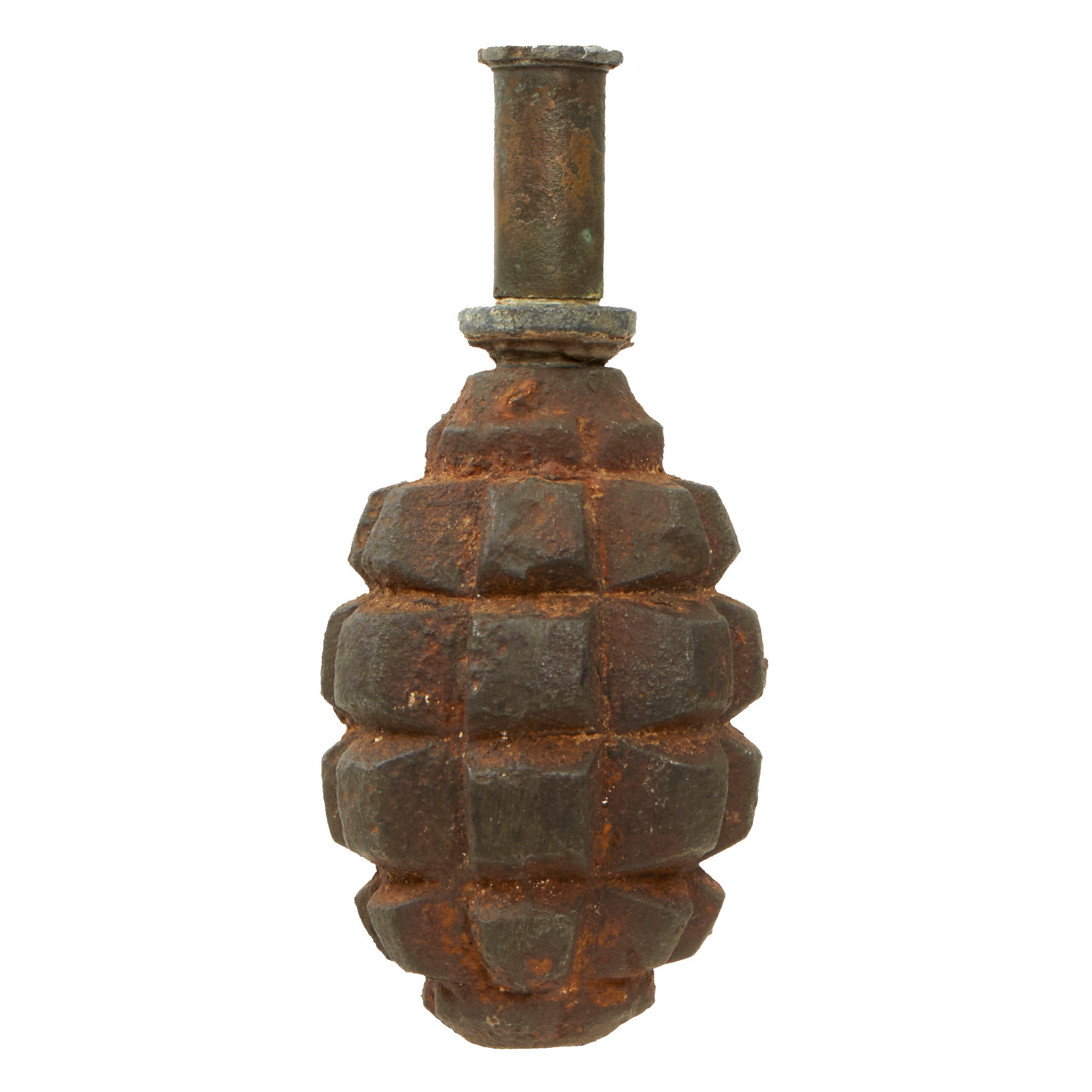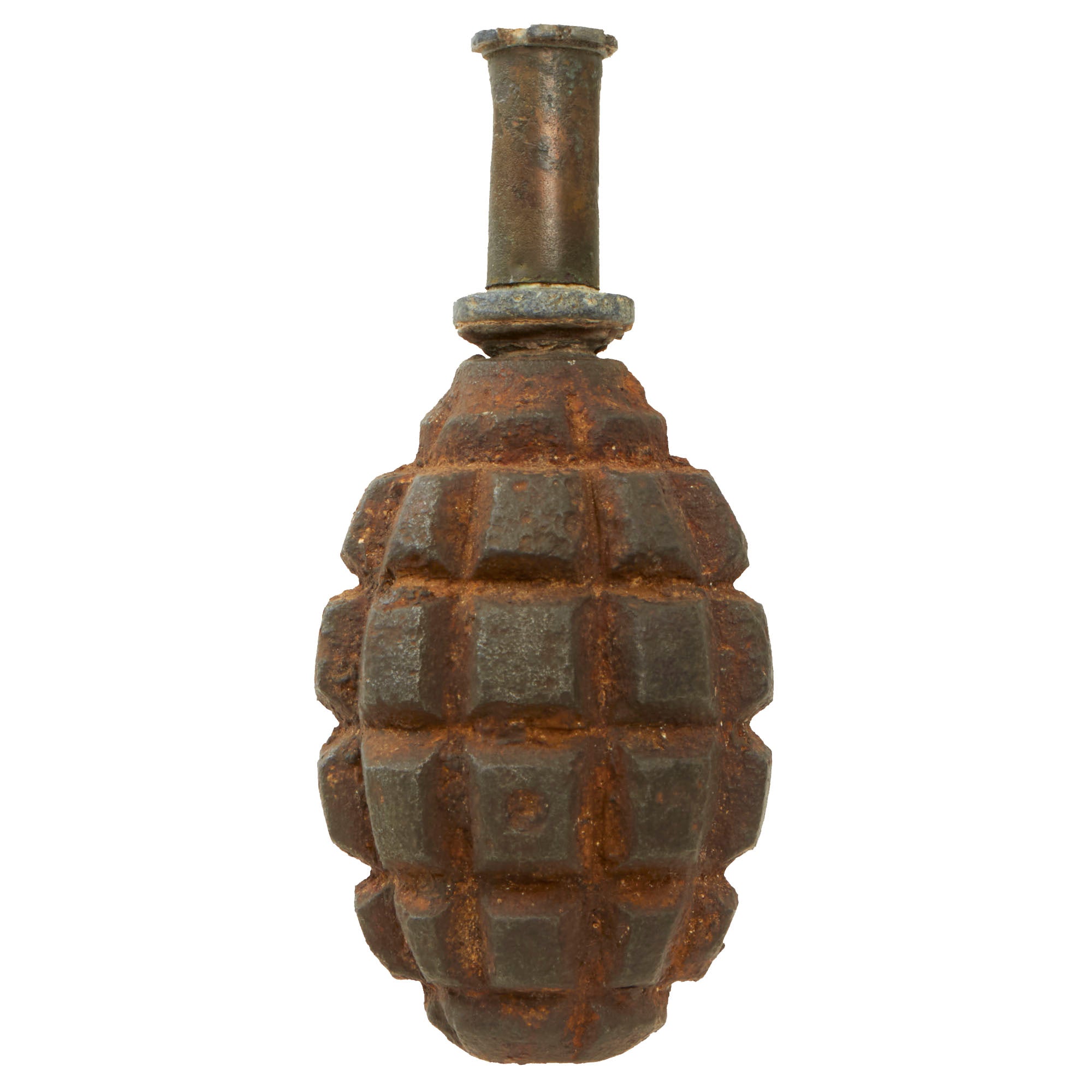 Original Item: Only One Available. This is a totally inert BATF compliant genuine World War One French F1 Grenade with an original fuse and cap. The grenade was rendered completely inert and is unable to be used as a destructive device.