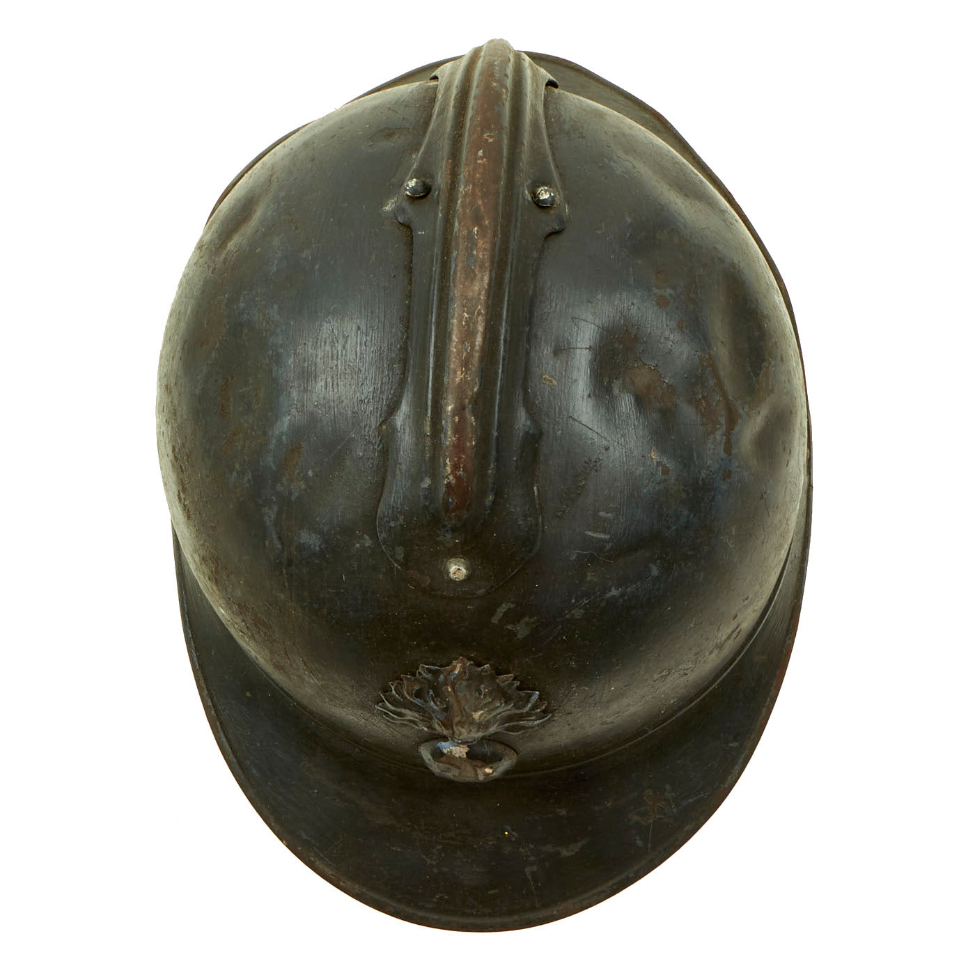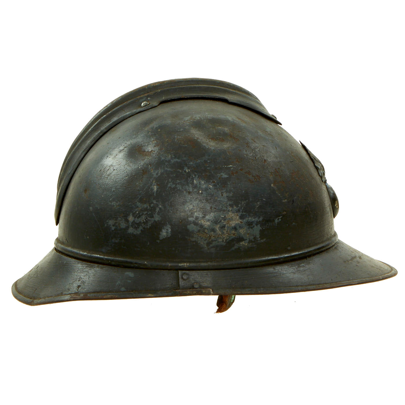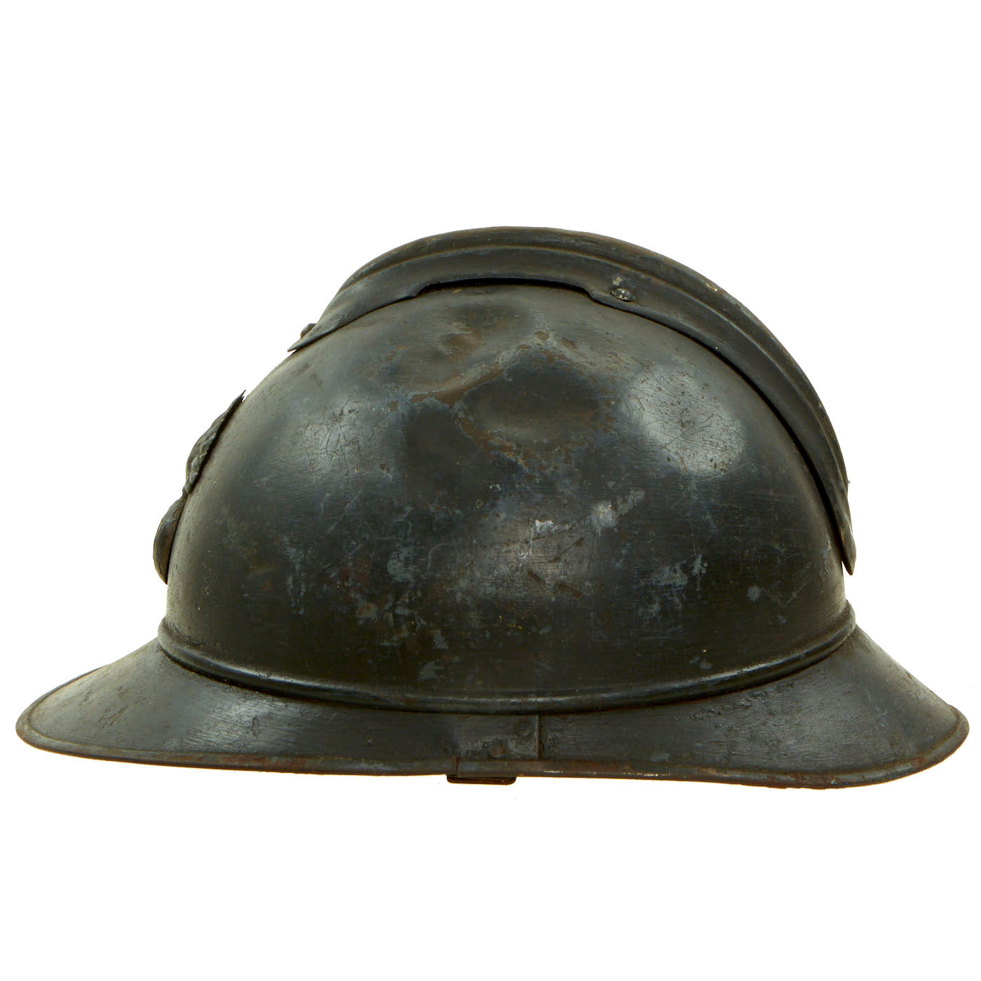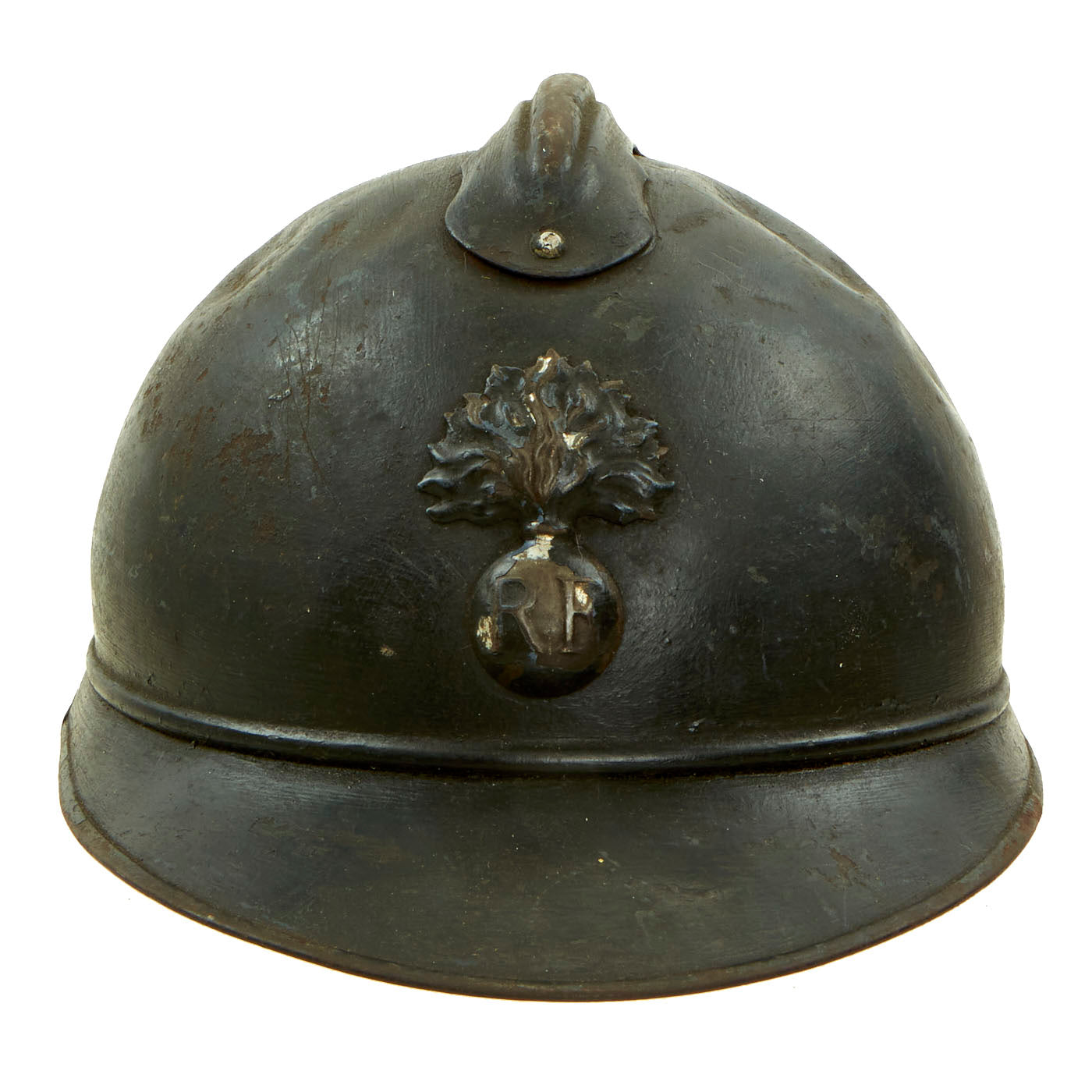 Original Item: Only One Available. This is a nice example of a genuine World War I M-1915 French Army "Adrian" steel helmet, which looks to have seen long service. The front of the helmet still has its original French "Flaming Bomb" badge. The badge has the standard R F on the "bomb", for Republique Francaise. This is the badge used on standard Infantry issue helmets. The helmet shows signs of being repainted several times, which was not uncommon to see a few coats of paint on a helmet in the French Army, especially a helmet as early as this one.