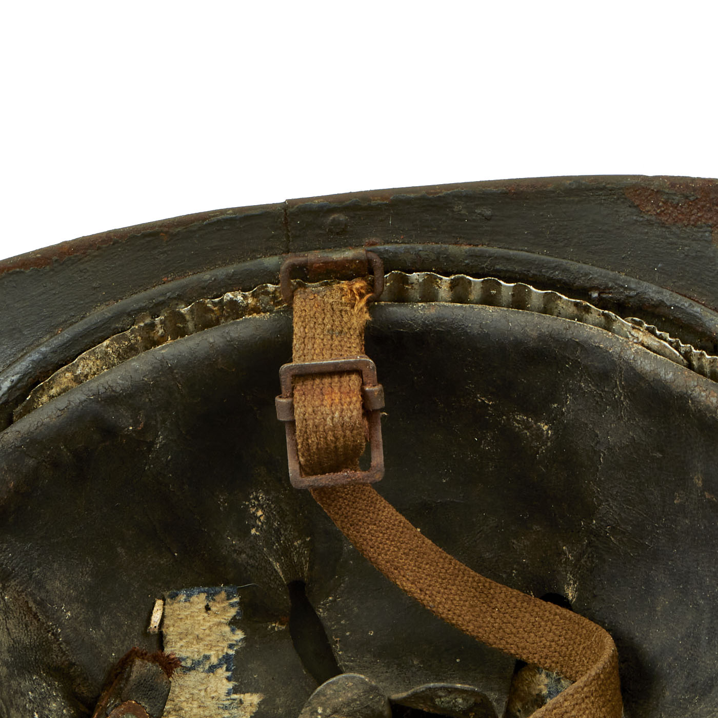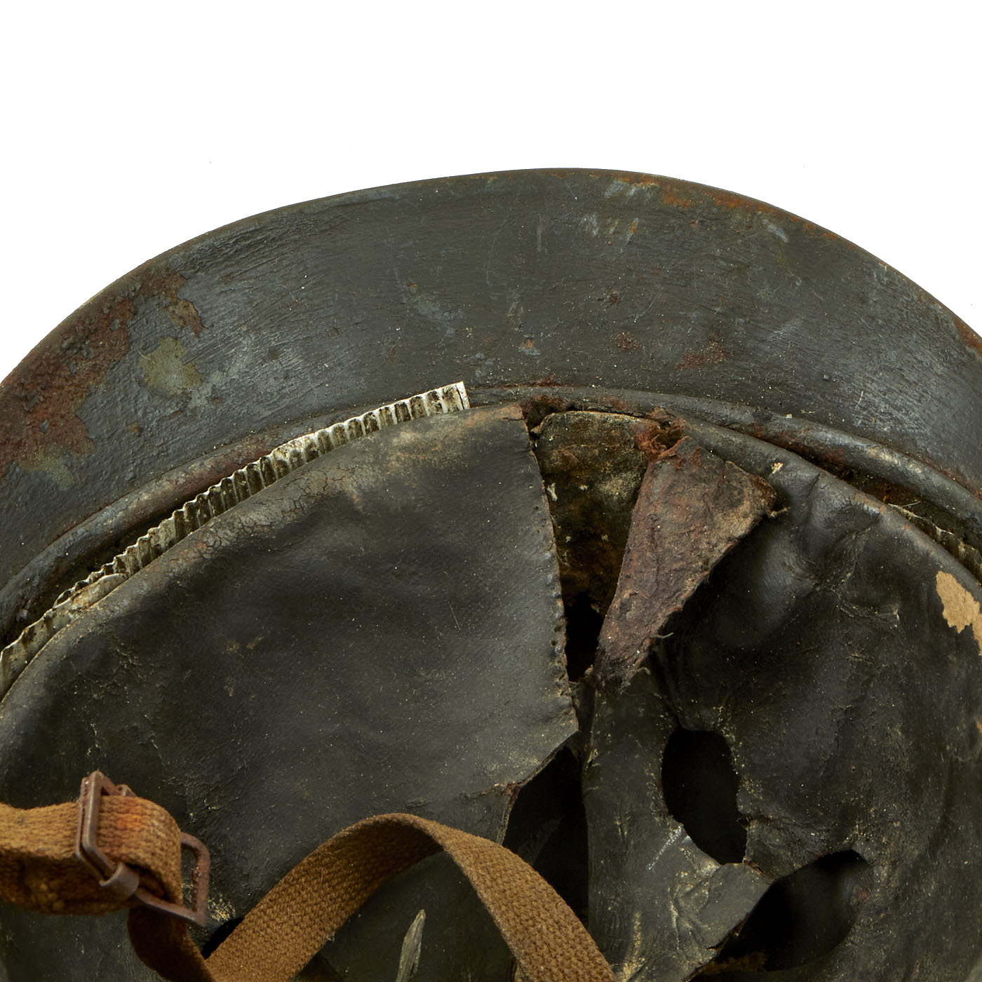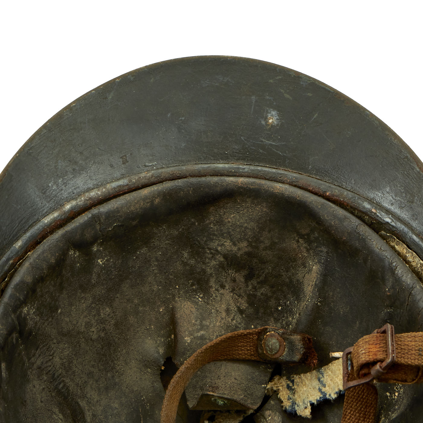 The early 1st Pattern leather liner is present, but is definitely worn, with a lot of the finish present. There is a hole in the liner as well as all of the stitching on the rear seam completely missing. The helmet does still have a chin strap, which is cloth and unfortunately broken. Overall condition is good, but definitely worn.