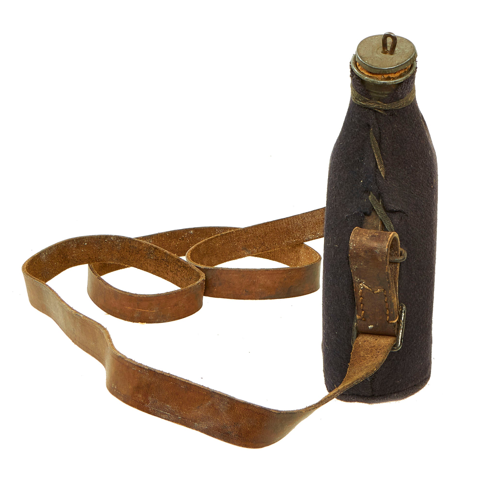 Original Item: Only One Available. This is a very nice example of a dark blue canvas covered Model 1877 French 2-liter canteen, complete with the original cover and full length leather shoulder strap. Amazingly, the cork stopper is present but not the wood plug. Overall condition of the canteen and cover is very good. The leather carry strap is complete and supple. We've only had a very few of these canteens, as they are rare and hard to find. Ready to display!