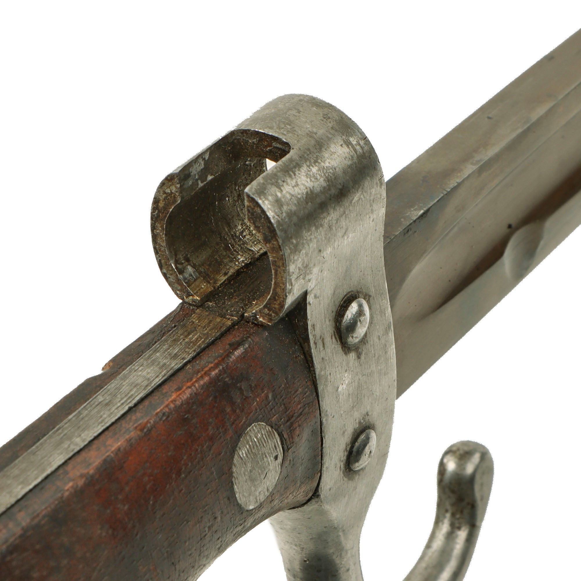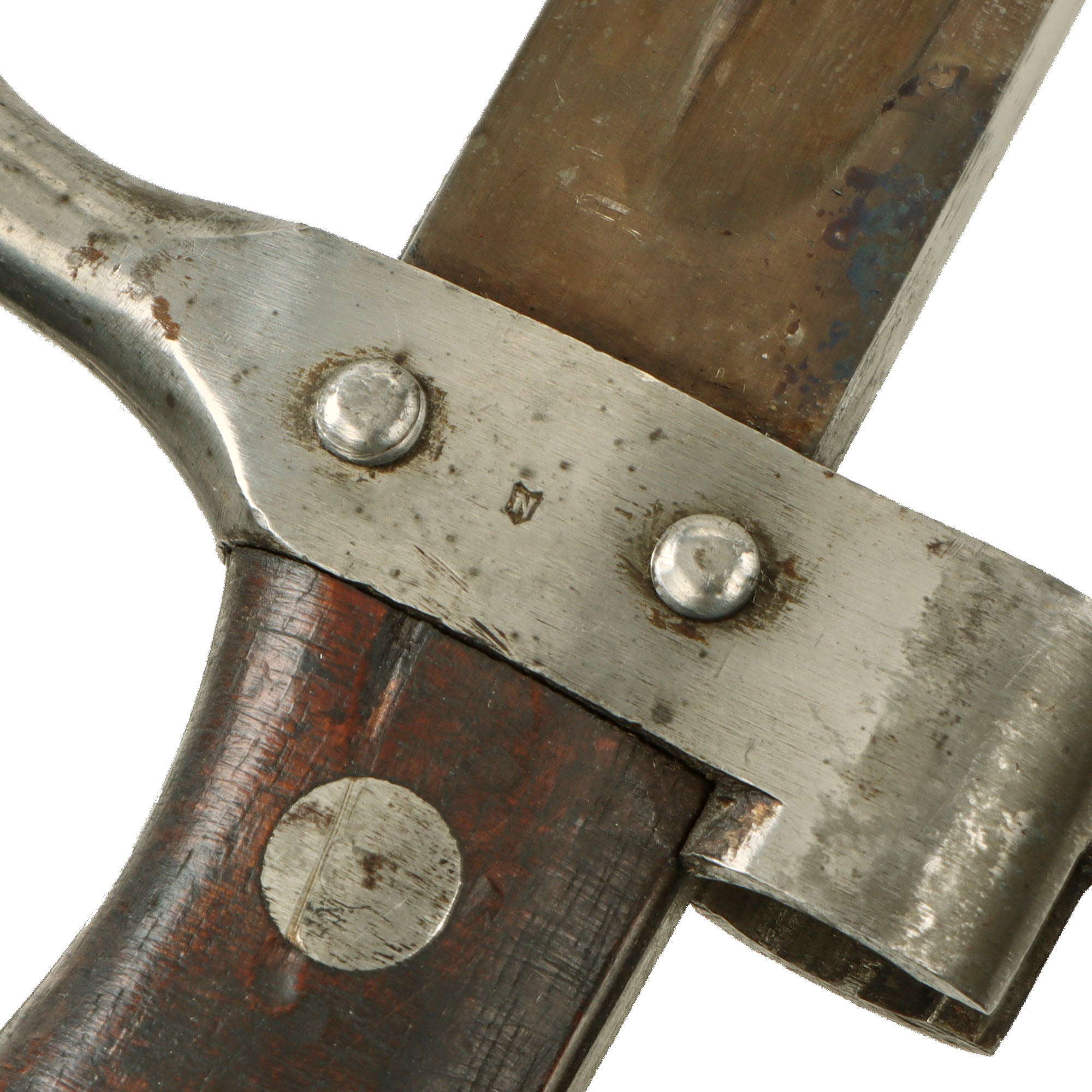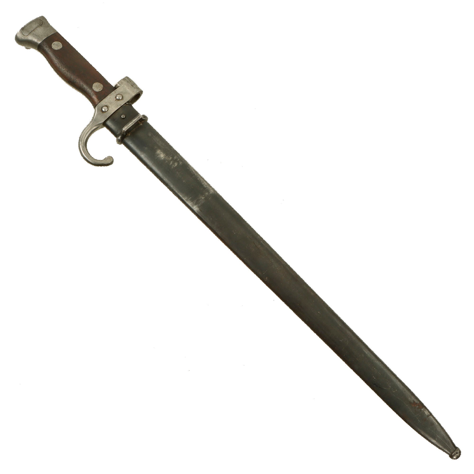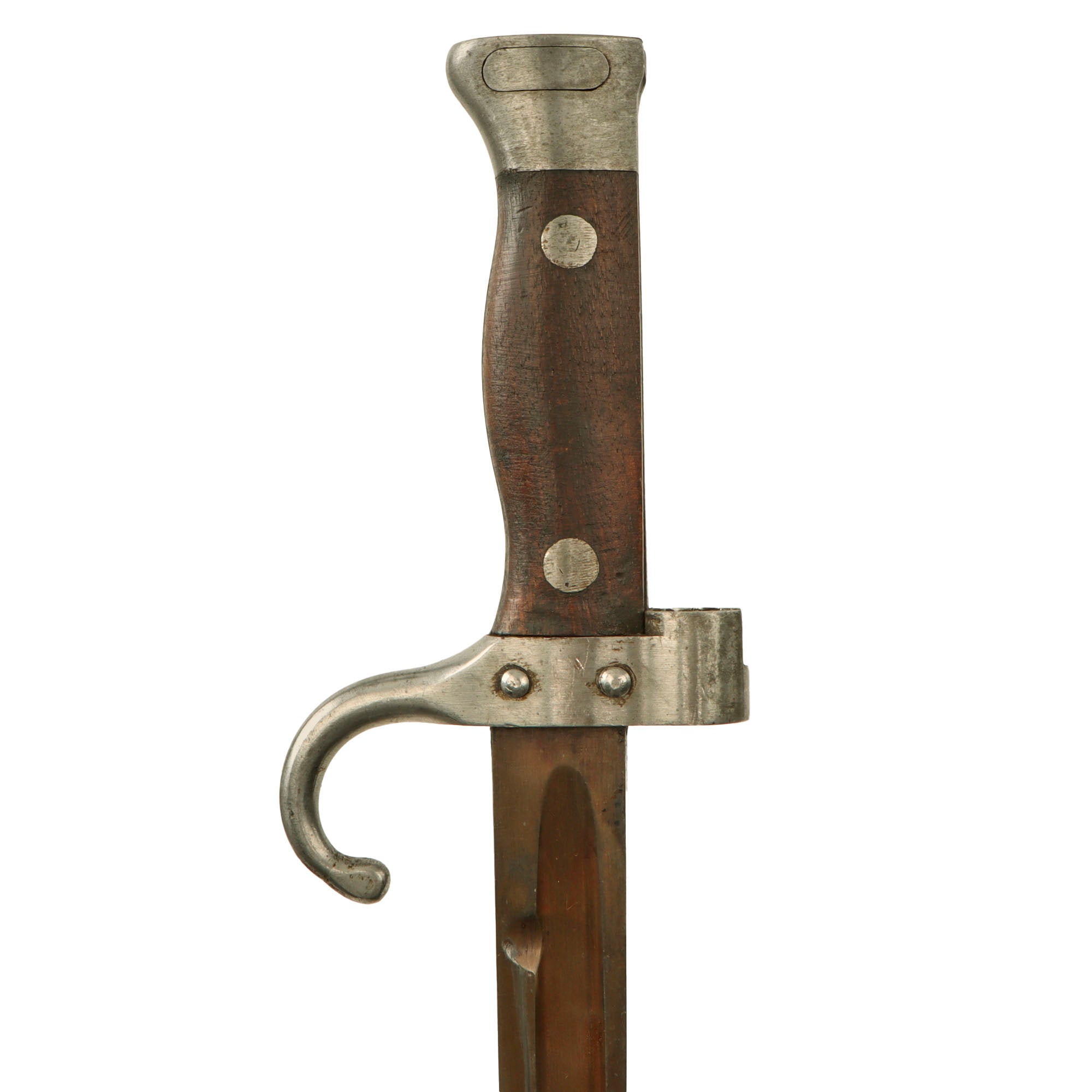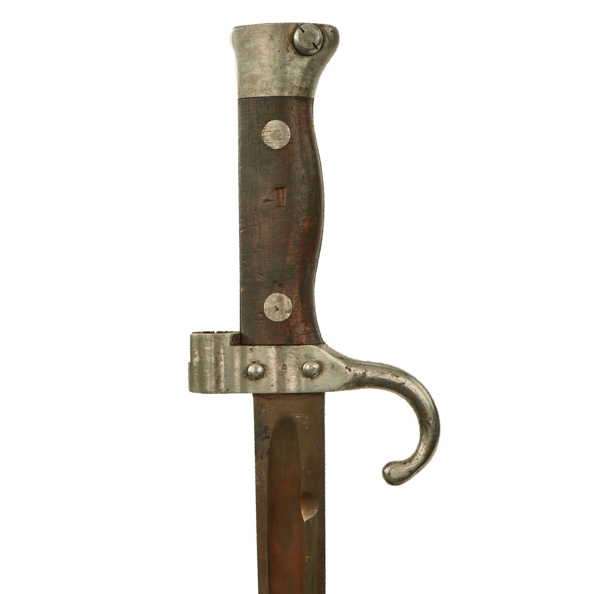 This is an example of the second pattern, which has rivet retaining grips, and a muzzle ring that overlaps the grips slightly. It no longer retains a hooked quillon, many of these were modified by having the quillon reduced in size for WWI service. For more details please see Watts & White The Bayonet Book, page 98, item 214.