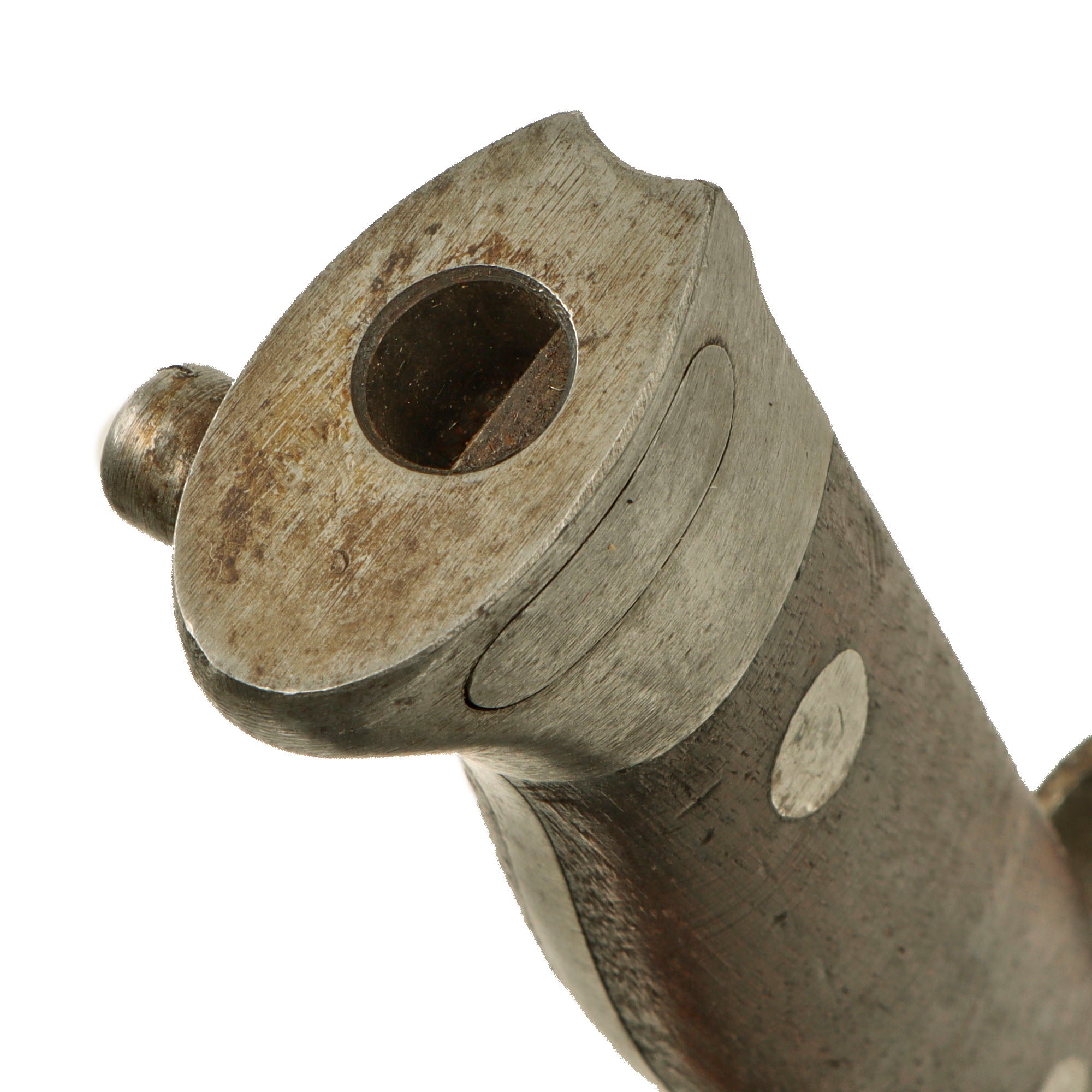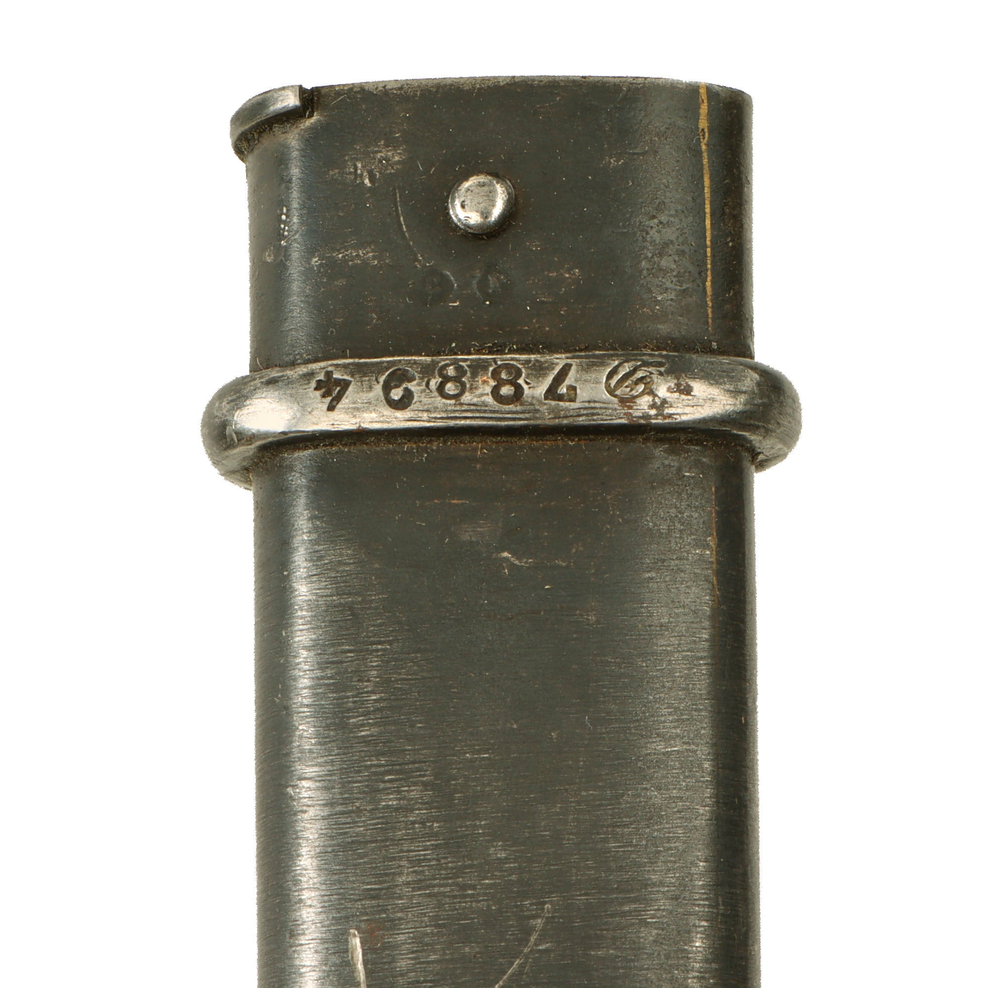 Condition is very good, with wear and light oxidation commensurate with age. There is some cracking of the vulcanized rubber grip scales around the retaining rivets. The bayonet latch is fully functional. There is no serial number on the bayonet D78894.