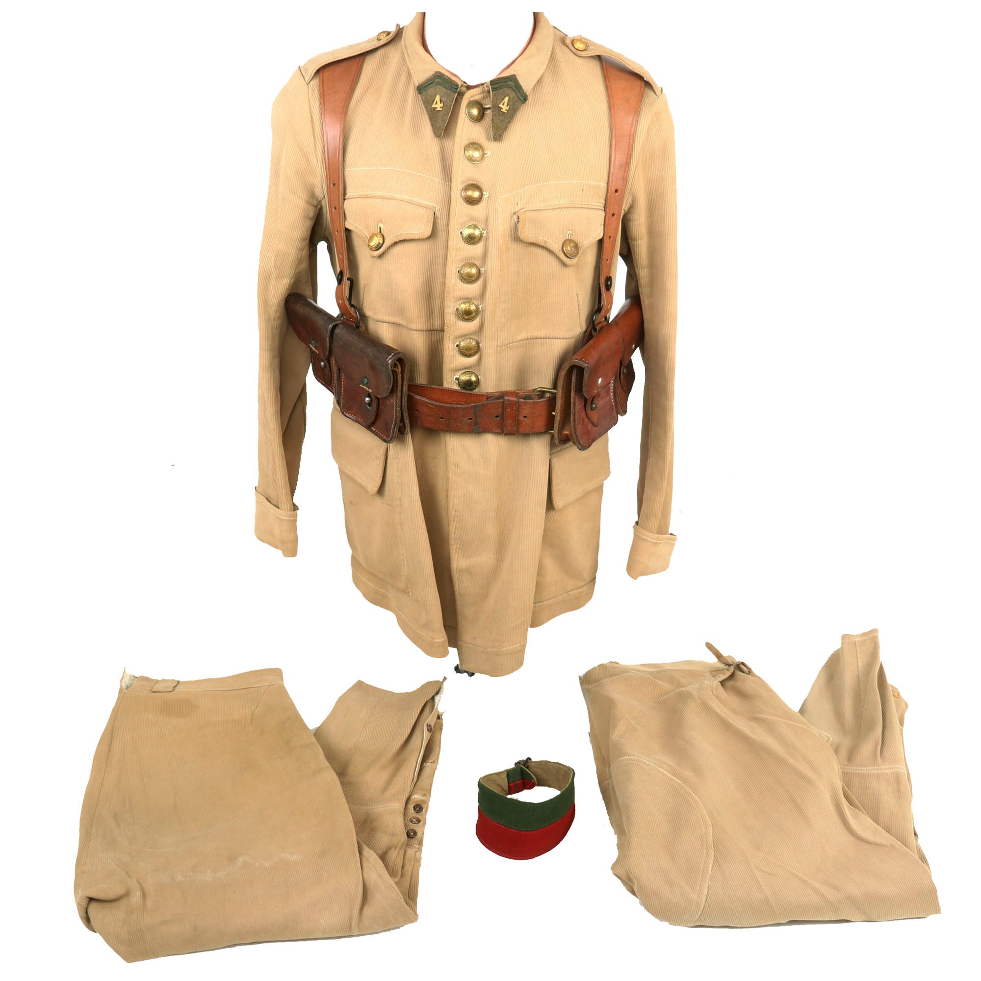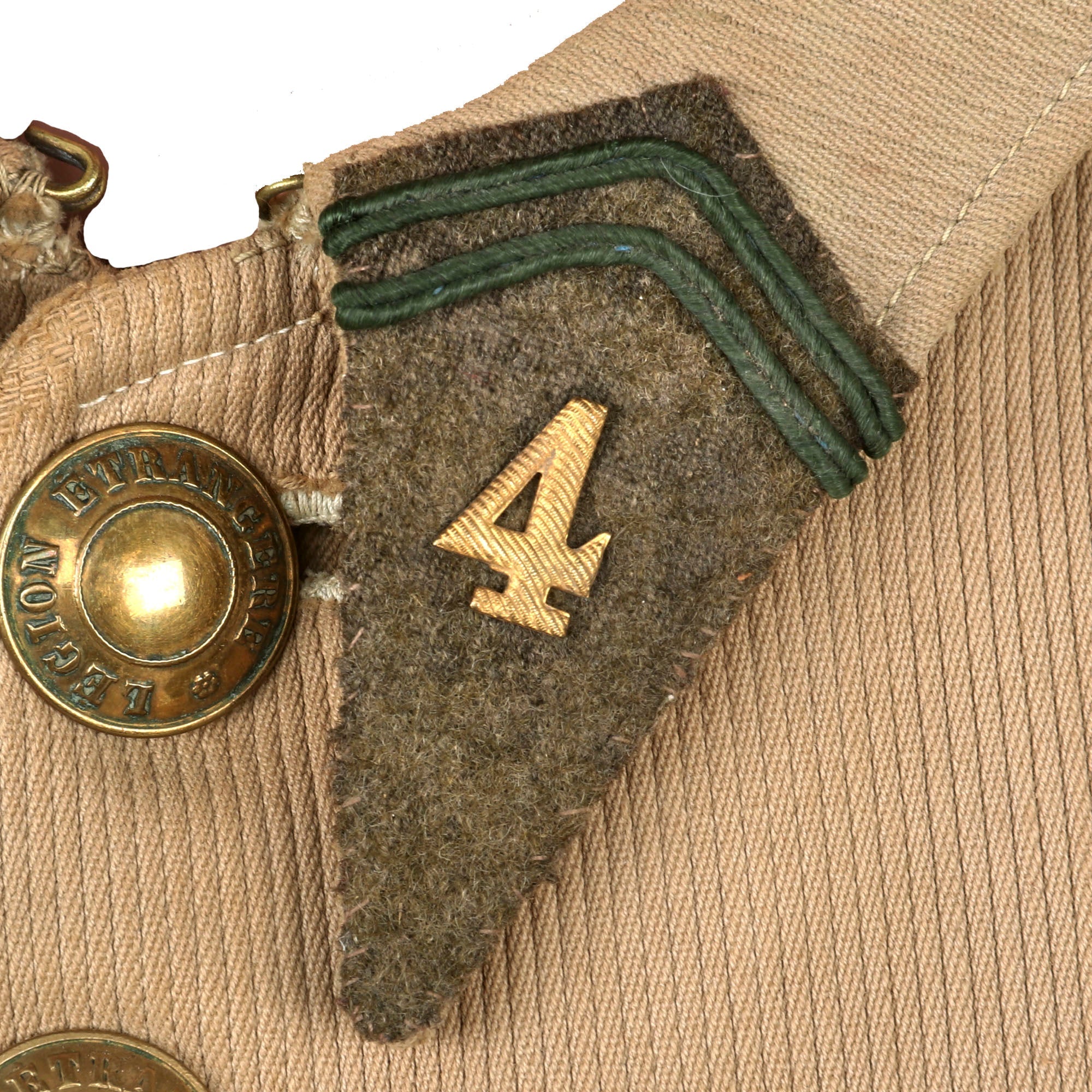 Original Group. One-of-a-Kind. From its foundation until World War I the Foreign Legion normally wore the uniform of the French line infantry for parade with a few special distinctions. In the early 20th century the legionnaire wore a red kepi with blue band and piping, dark blue tunic with red collar, red cuff patches, and red trousers. Distinctive features were the green epaulets (replacing the red of the line) worn with red woolen fringes; plus the embroidered Legion badge of a red flaming grenade, worn on the kepi front instead of a regimental number. In the field a light khaki cover was worn over the kepi, though this one was manufactured in the khaki color and was more than likely a private purchase. During the initial months of World War I, Foreign Legion units serving in France wore the standard blue greatcoat and red trousers of the French line infantry, distinguished only by collar patches of the same blue as the capote, instead of red. After a short period in sky-blue the Foreign Legion adopted khaki, in common with other units of the Armée d'Afrique, with steel helmets, from early 1916.