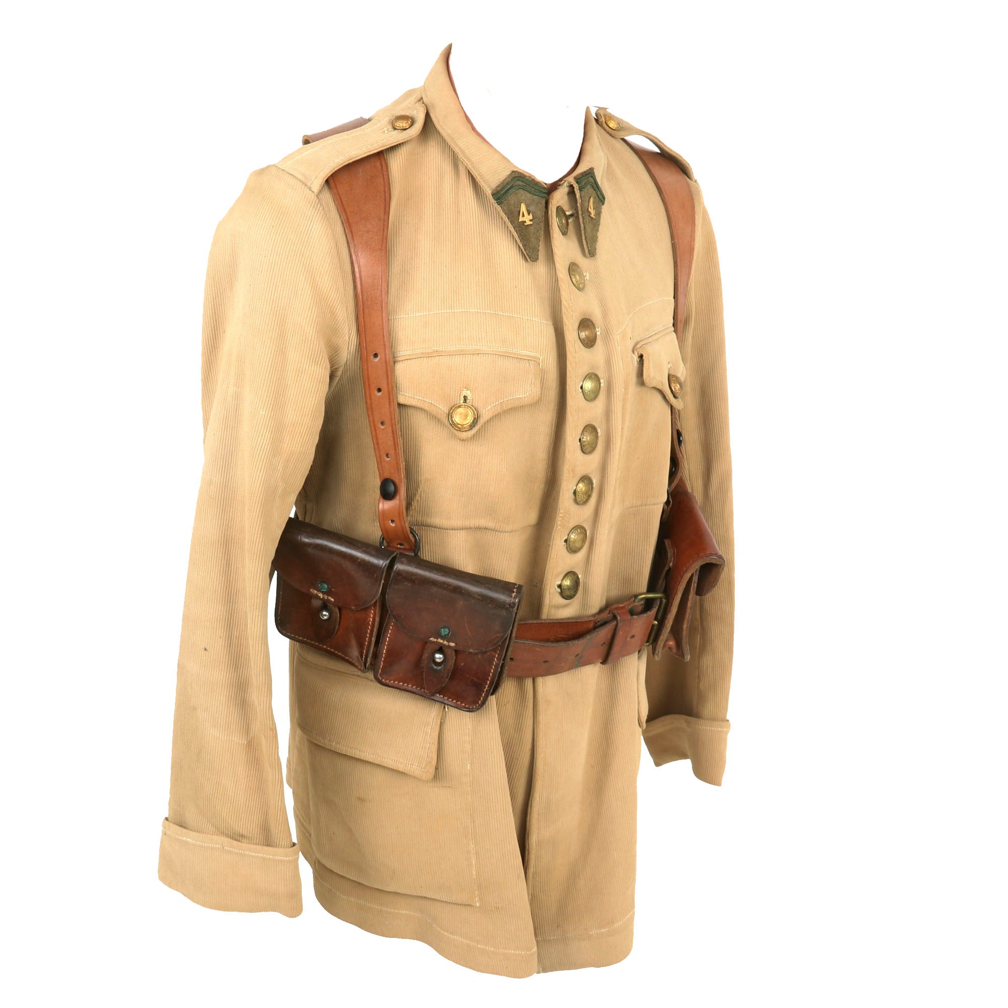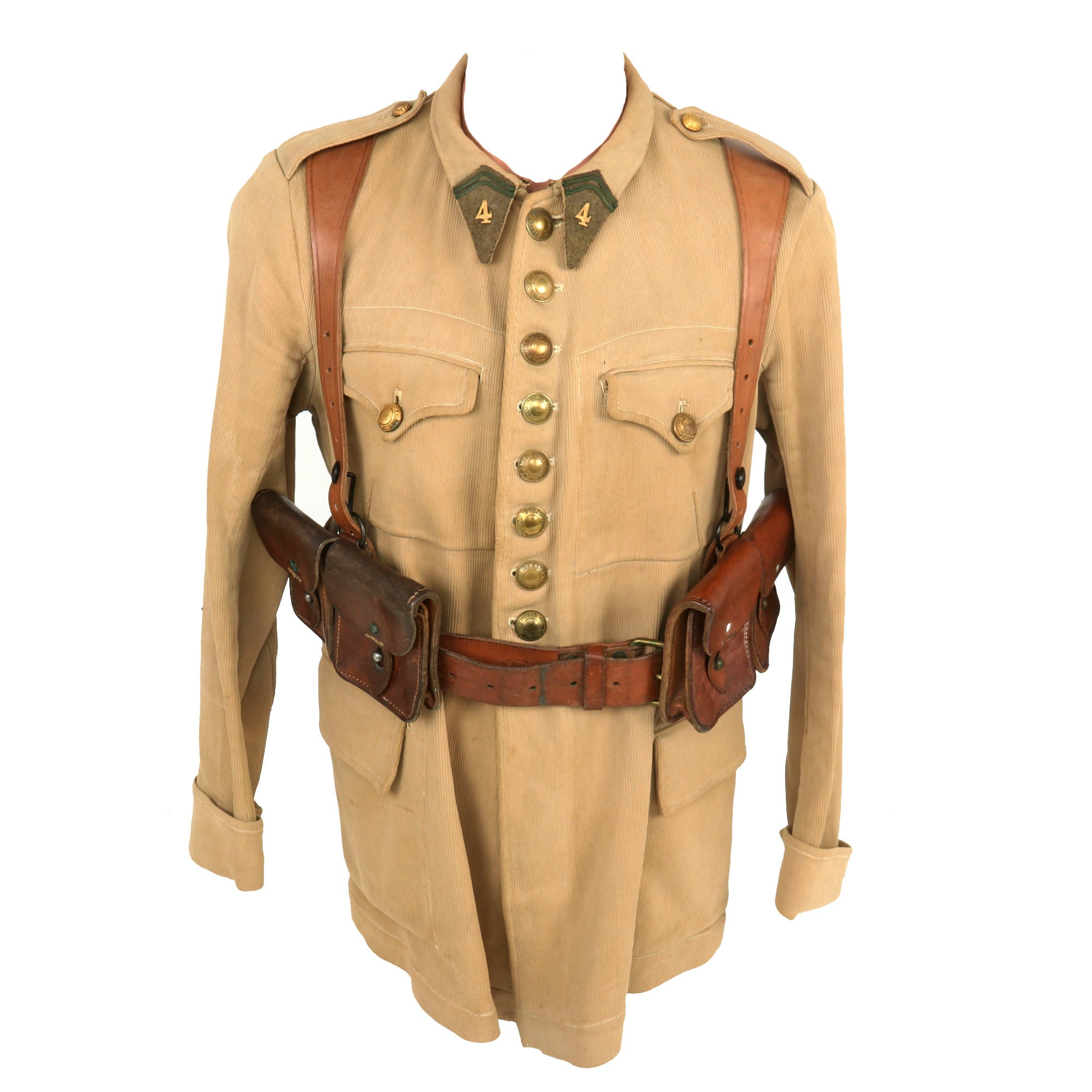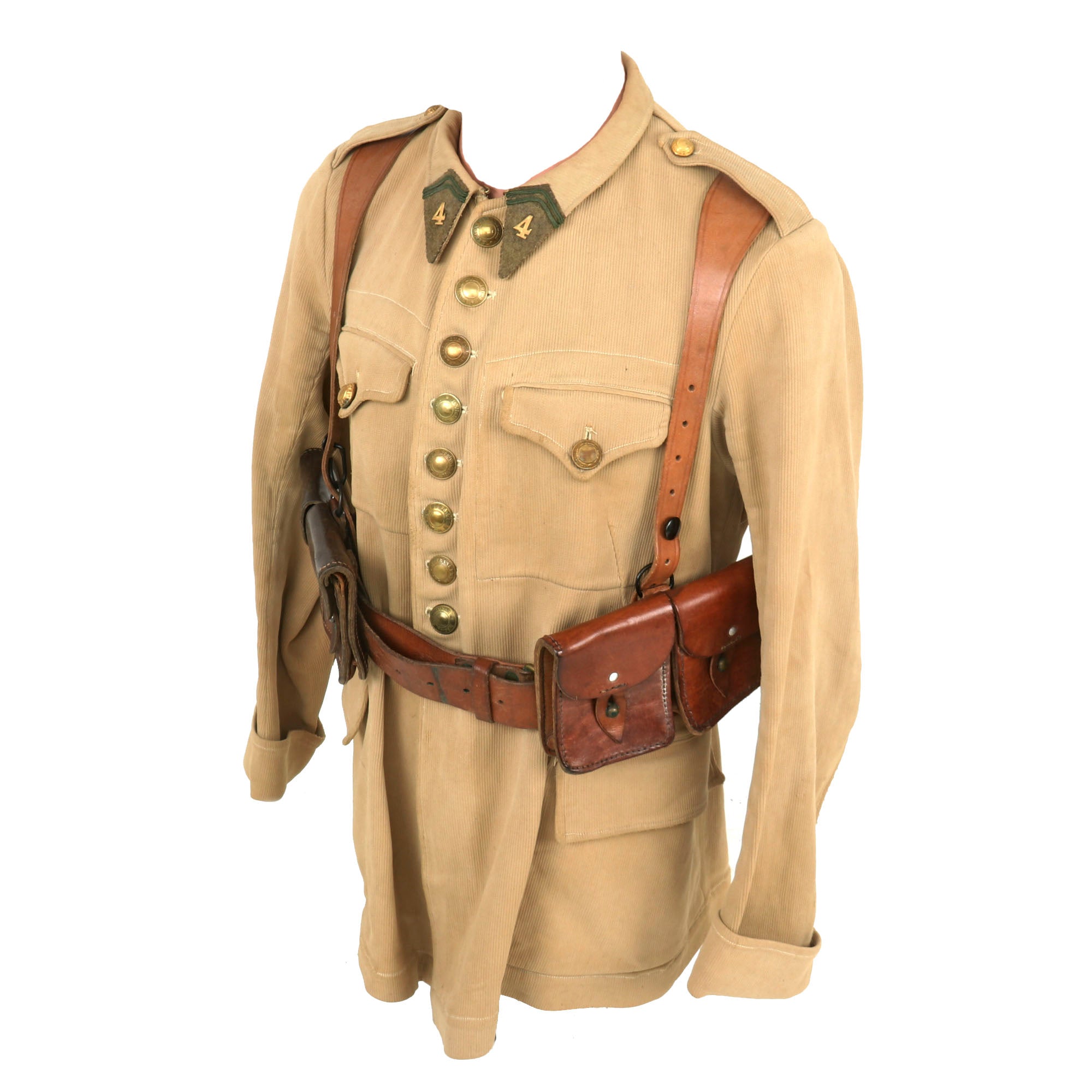 This is a lovely Post-WWI French Foreign Legion Corduroy uniform named on the interior under the buttons to Motat Gouaix of the 4th Foreign Regiment as indicated by the collar tabs. The Created in November 1920 in Marrakesh, Morocco, the 4th Foreign Regiment became the 4th Foreign Infantry Regiment in 1922. Following its formation, the regiment was engaged in campaigns in Morocco in the Rif War between 1920 and 1934.