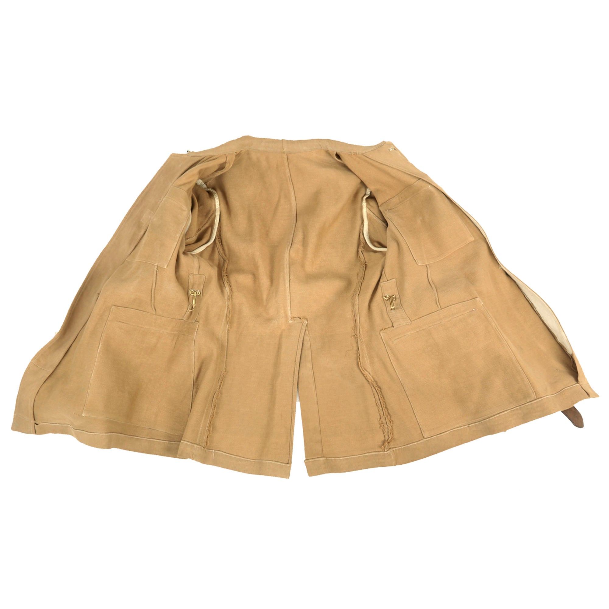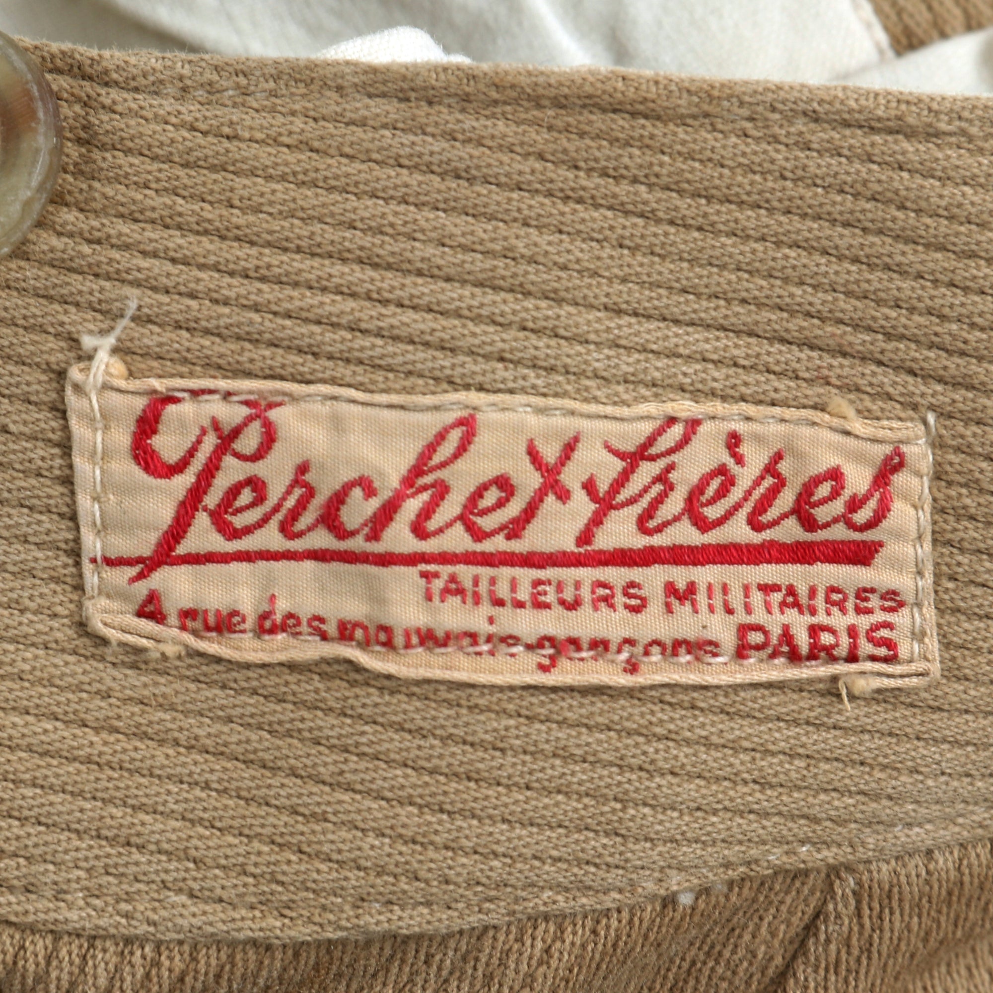 The jacket retains all buttons although some were added later. There is a bag in one pocket with 6 large buttons and 2 small buttons. The material is well-retained and displays well. The interior has a small maker’s tag for L. Arraou of Paris. There are some small field repairs in the material.