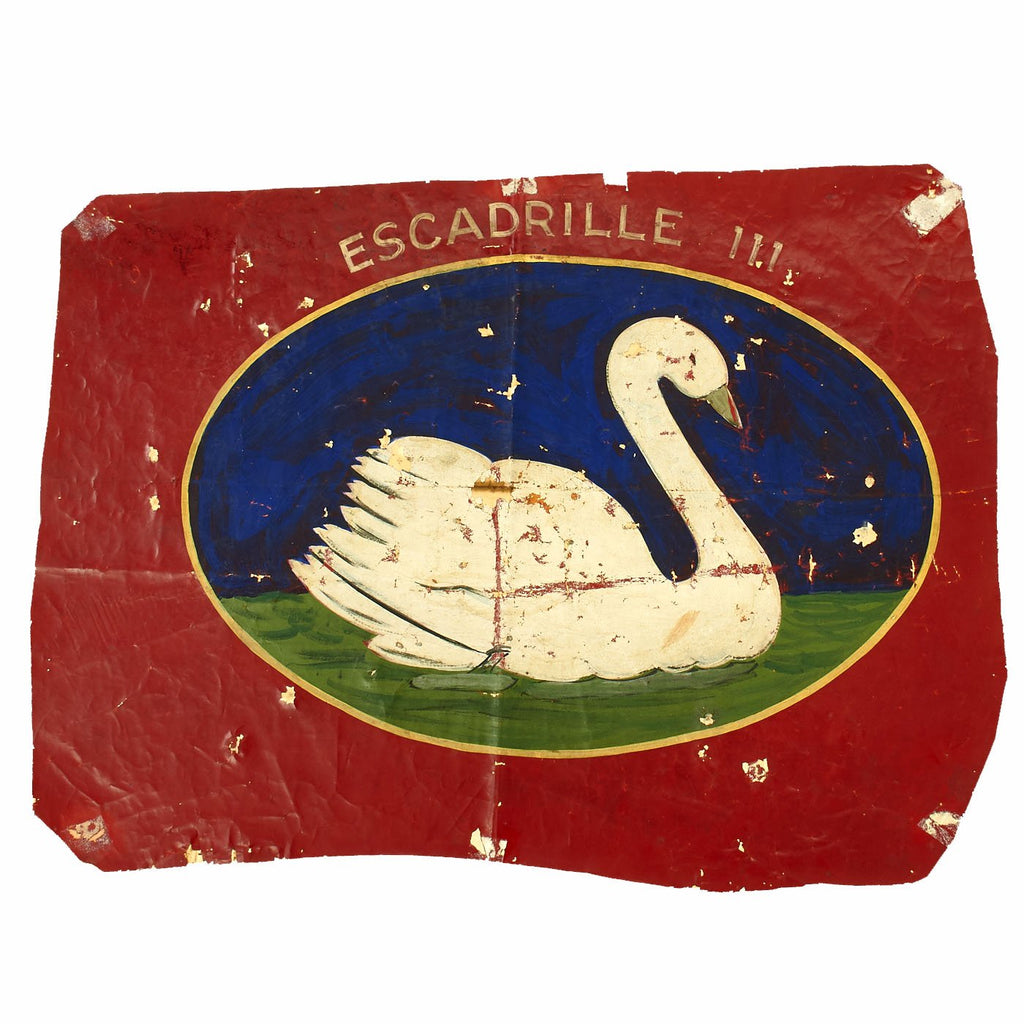 Original Item: One-of-a-kind. Cut from the tail section of a French Great War Biplane (most likely a Nieuport 11), this is the skin or canvas fabric used to line the body of the airplane. This Swan insignia represented Escadrille BR 111 (Squadron 111) and was reportedly cut away from a crashed biplane that was shot down during the Great War. Aircraft skin section measures 27 1/2" x 19 1/4” and is offered in very good condition.