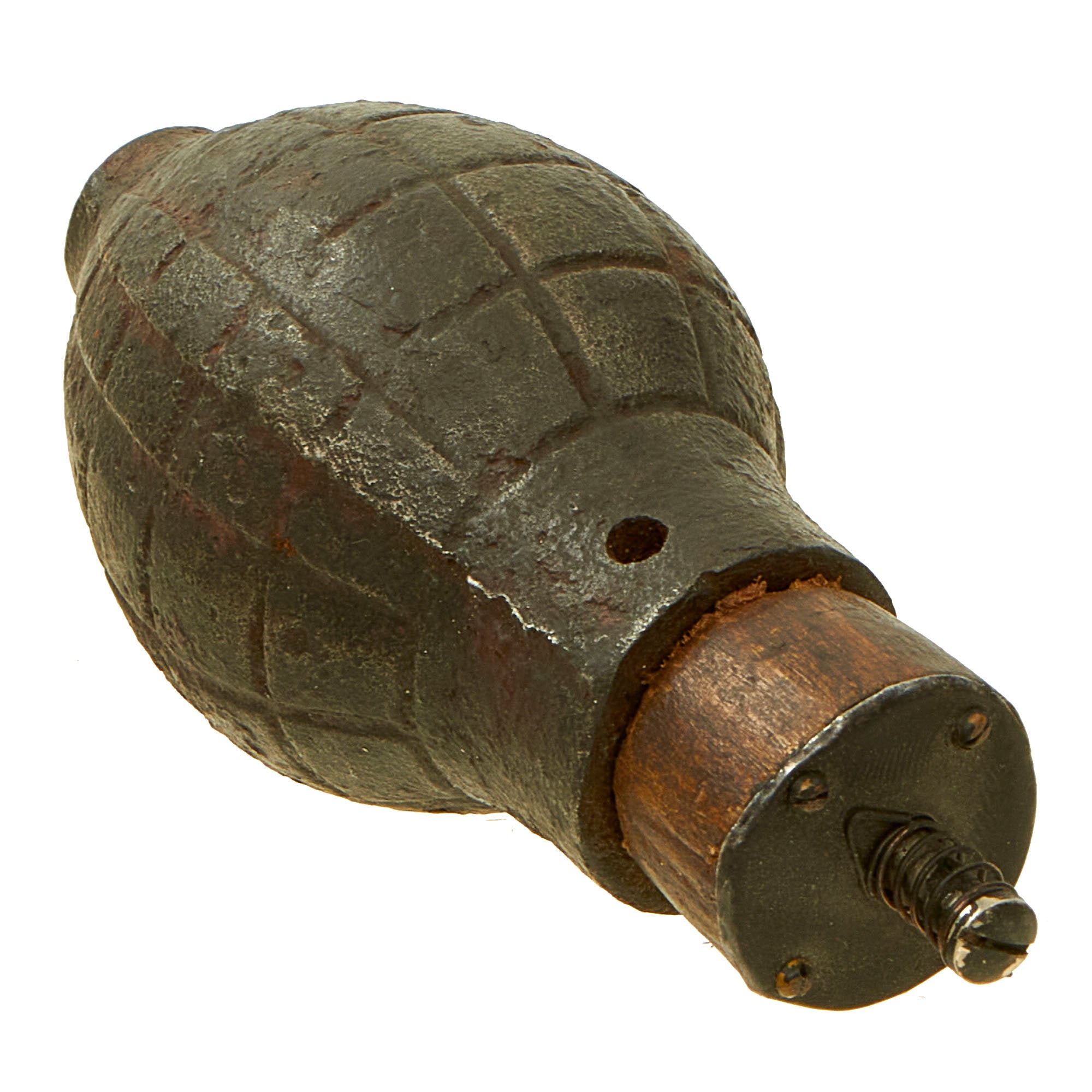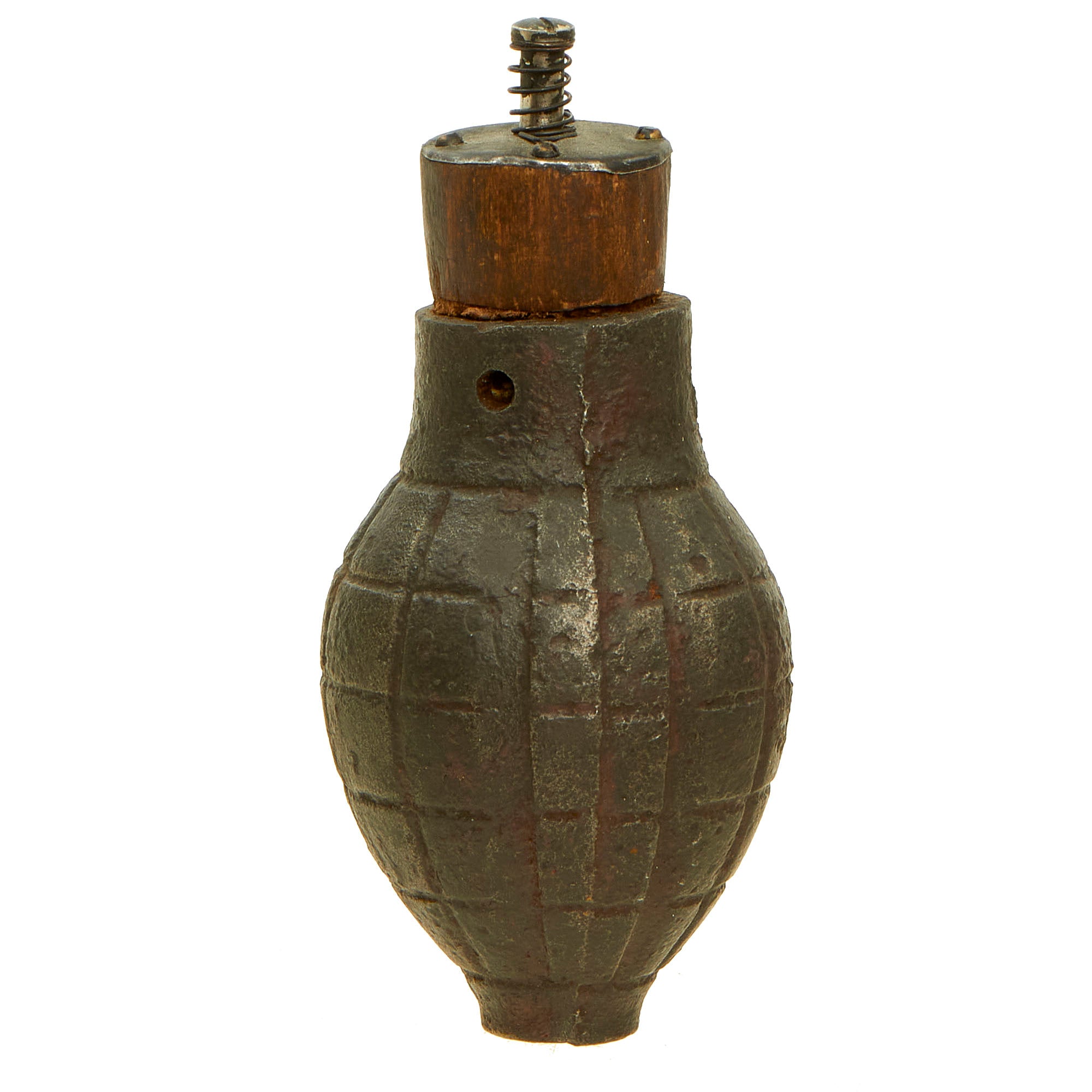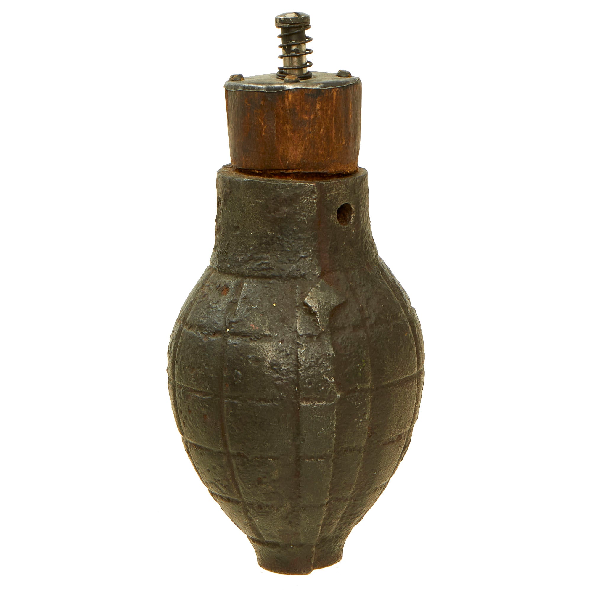 Original Item: Only One Available. This is a totally inert BATF compliant genuine World War One French Foug Mle 1916 "Citron" (Lemon) grenade in good condition. Unfortunately, it no longer has the galvanized steel fuze cover or impact fuze, but it does still have the wooden top plug where the fuze was held. The covers were especially easy to lose, and often pressed into service elsewhere.