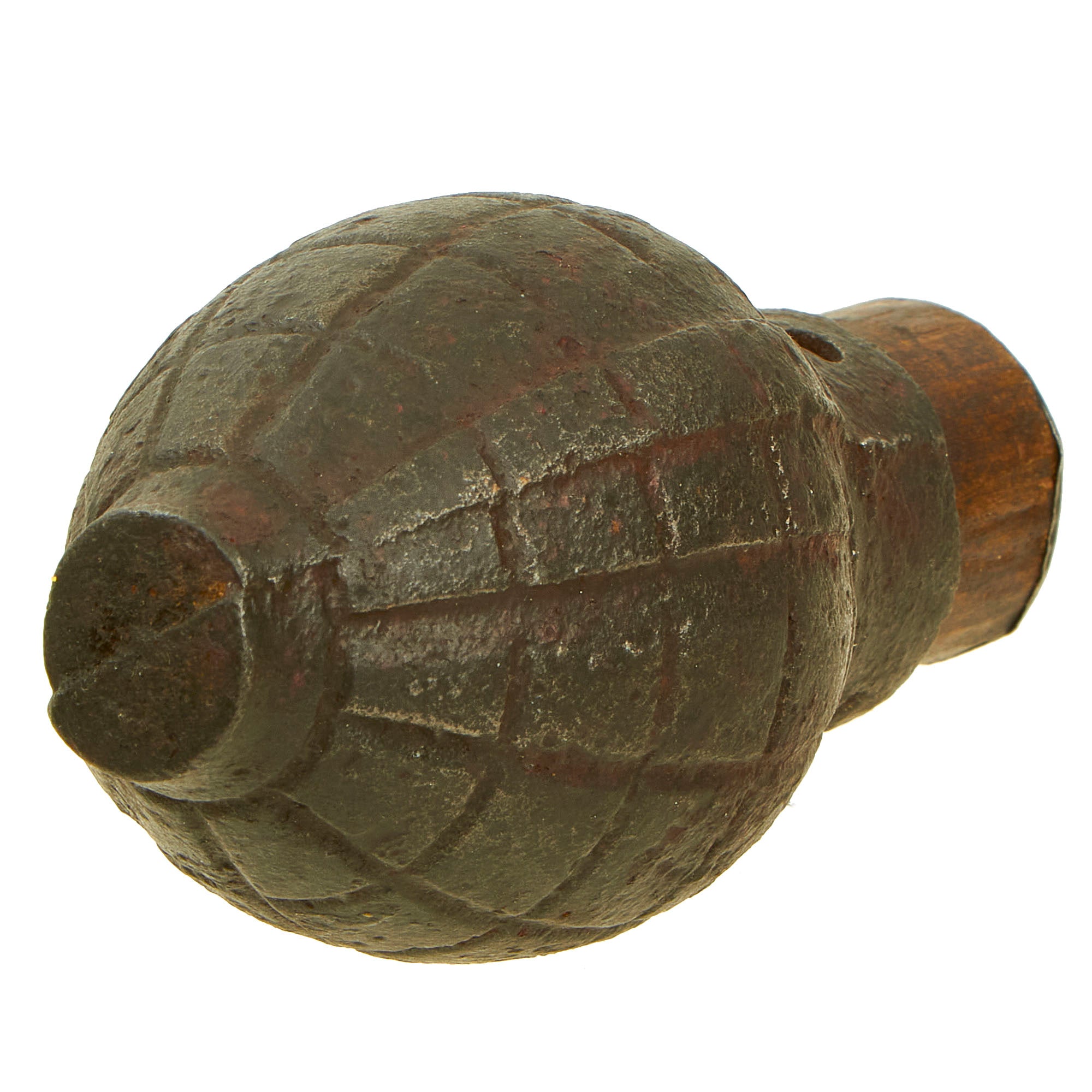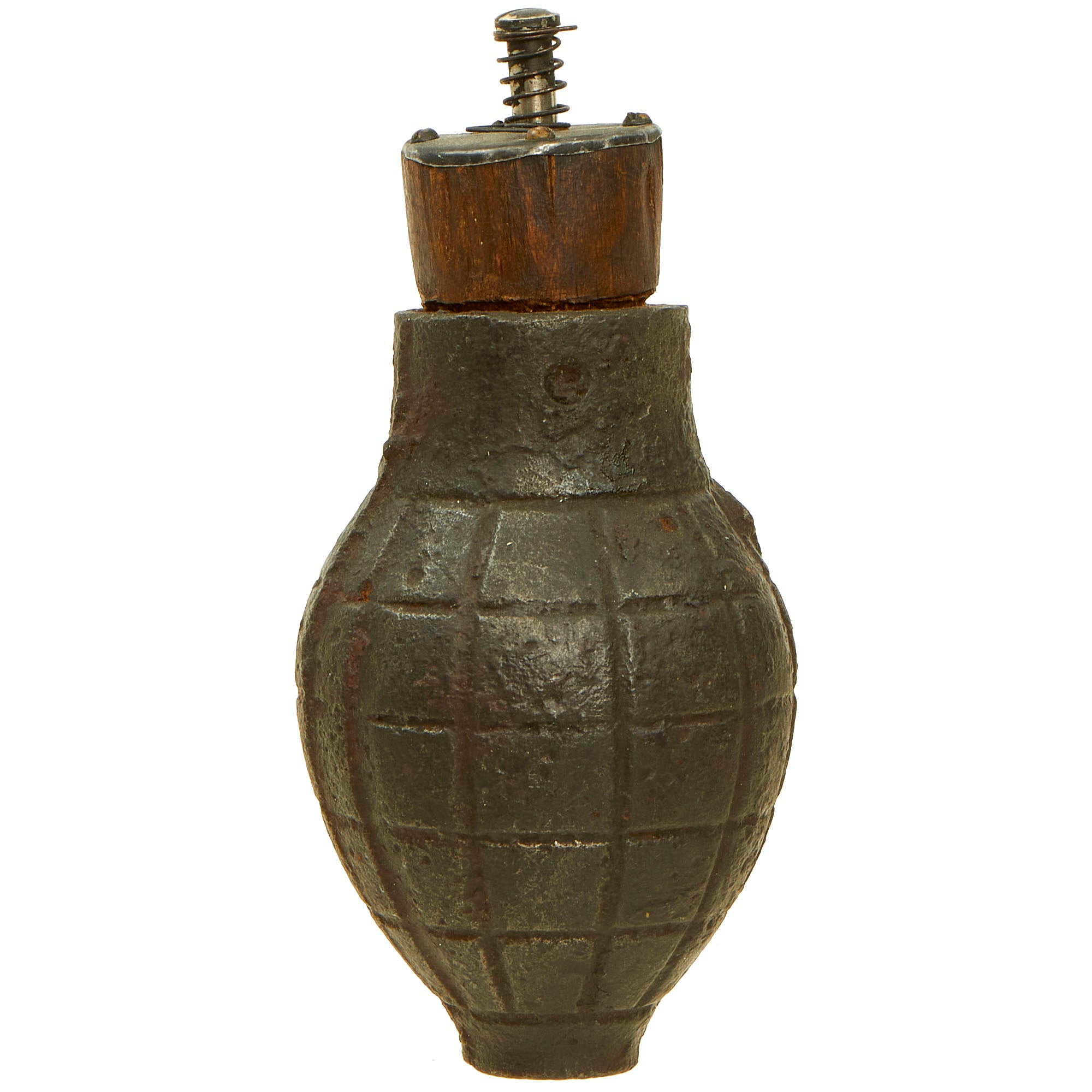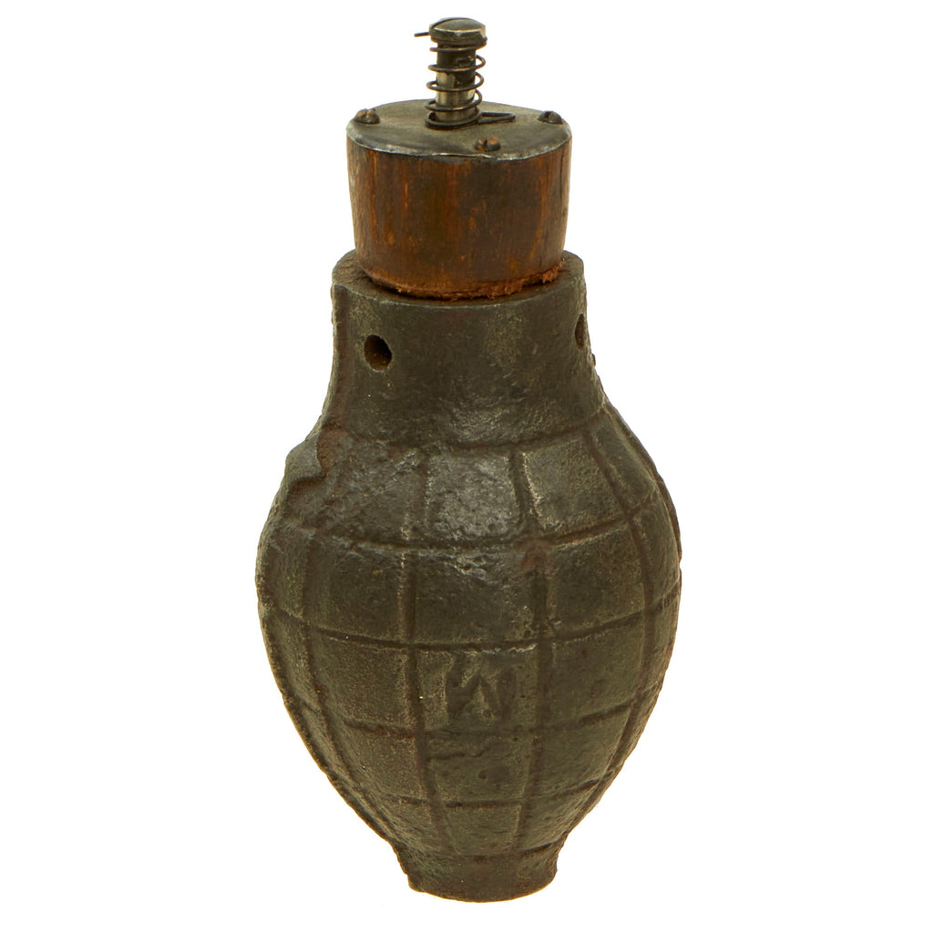 Original Item: Only One Available. This is a totally inert BATF compliant genuine World War One French Foug Mle 1916 "Citron" (Lemon) grenade in good condition. Unfortunately, it no longer has the galvanized steel fuze cover or impact fuze, but it does still have the wooden top plug where the fuze was held. The covers were especially easy to lose, and often pressed into service elsewhere.