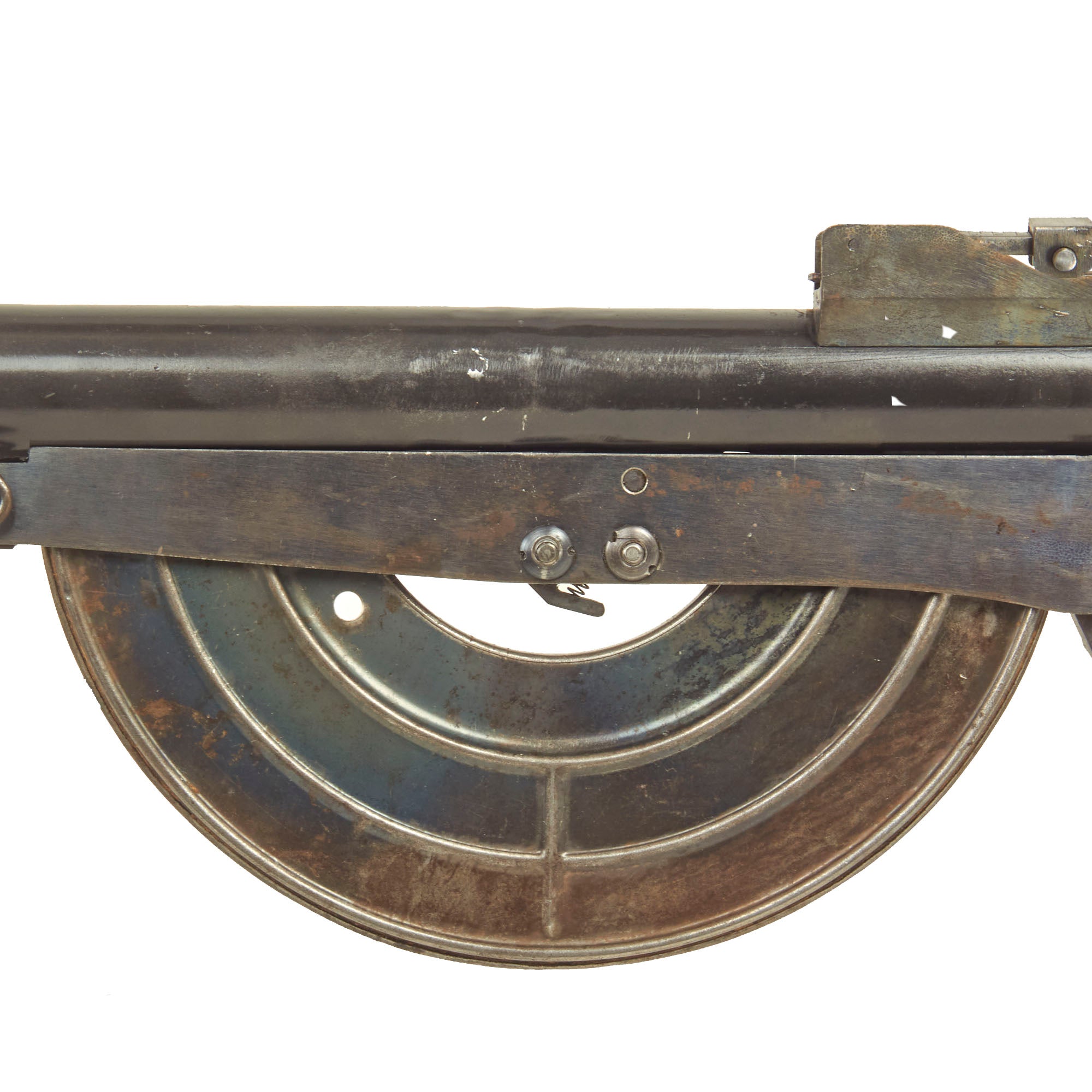 It was built from all original parts on an original BATF compliant non-firing display receiver, making this a 100% legal inert machine gun. This receiver was created by using portions of the original torch cut receiver, including the barrel bushing, combined with some new made steel portions. It has properly had a 25% section of the total length completely replaced entirely with solid steel bar stock. Meaning a 1/4 length section of the display receiver is solid steel, making this totally legal to own without a license of any kind. Many of the internal components were also demilitarized long ago, and welded in place. Included with this excellent example is a fully functional original magazine.