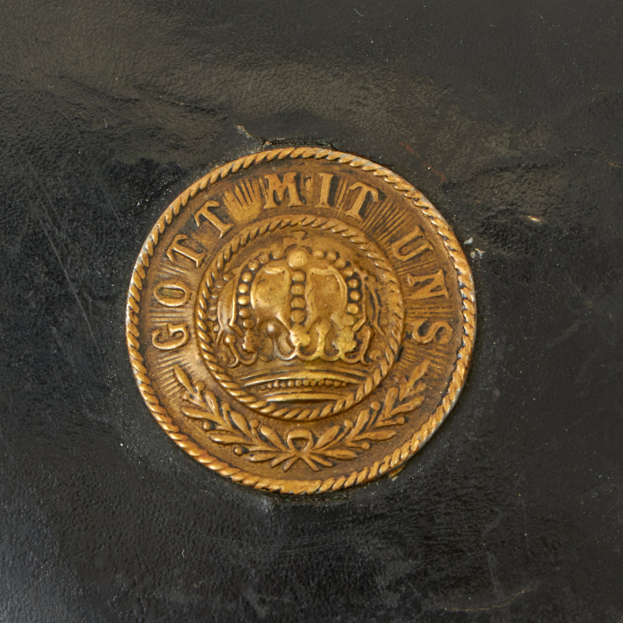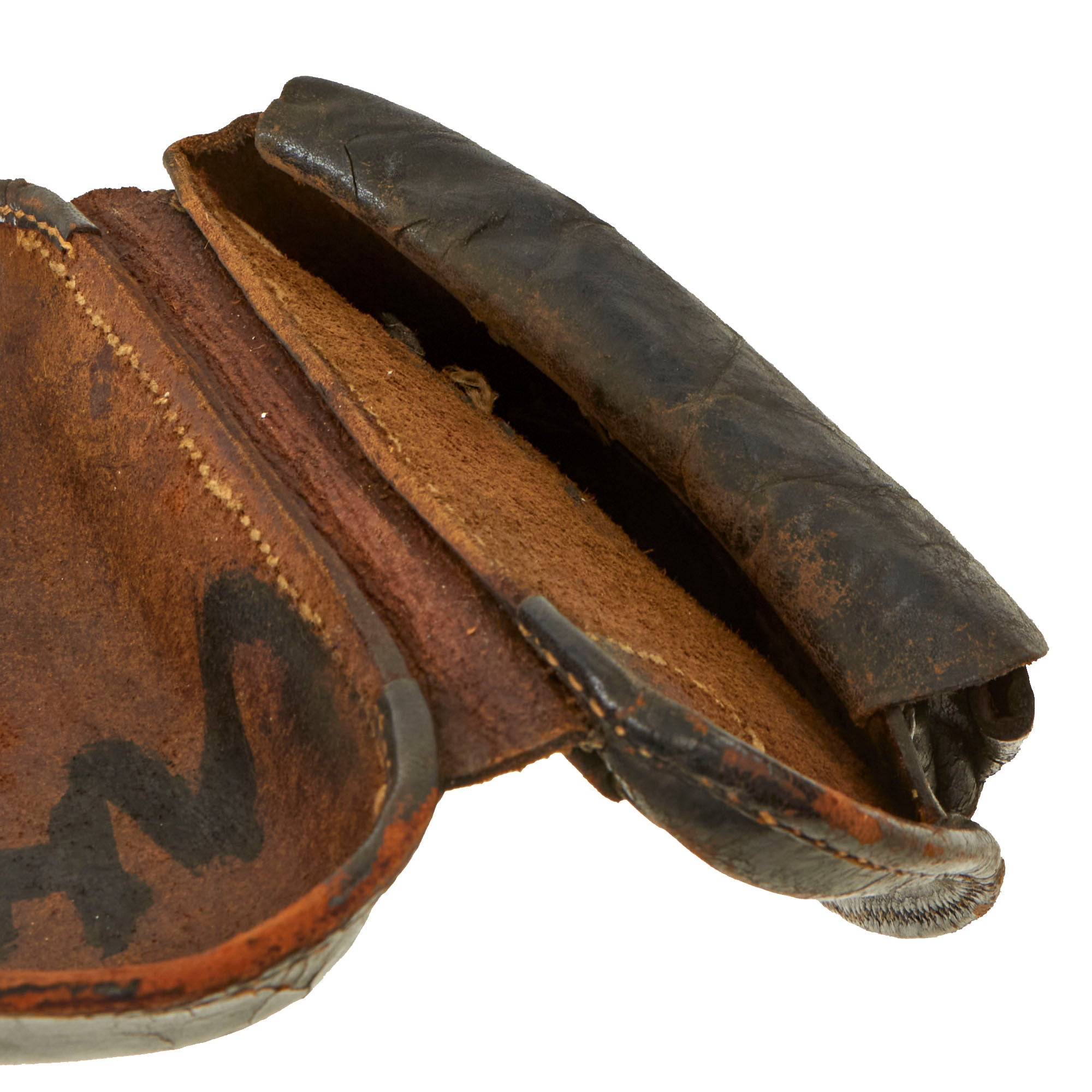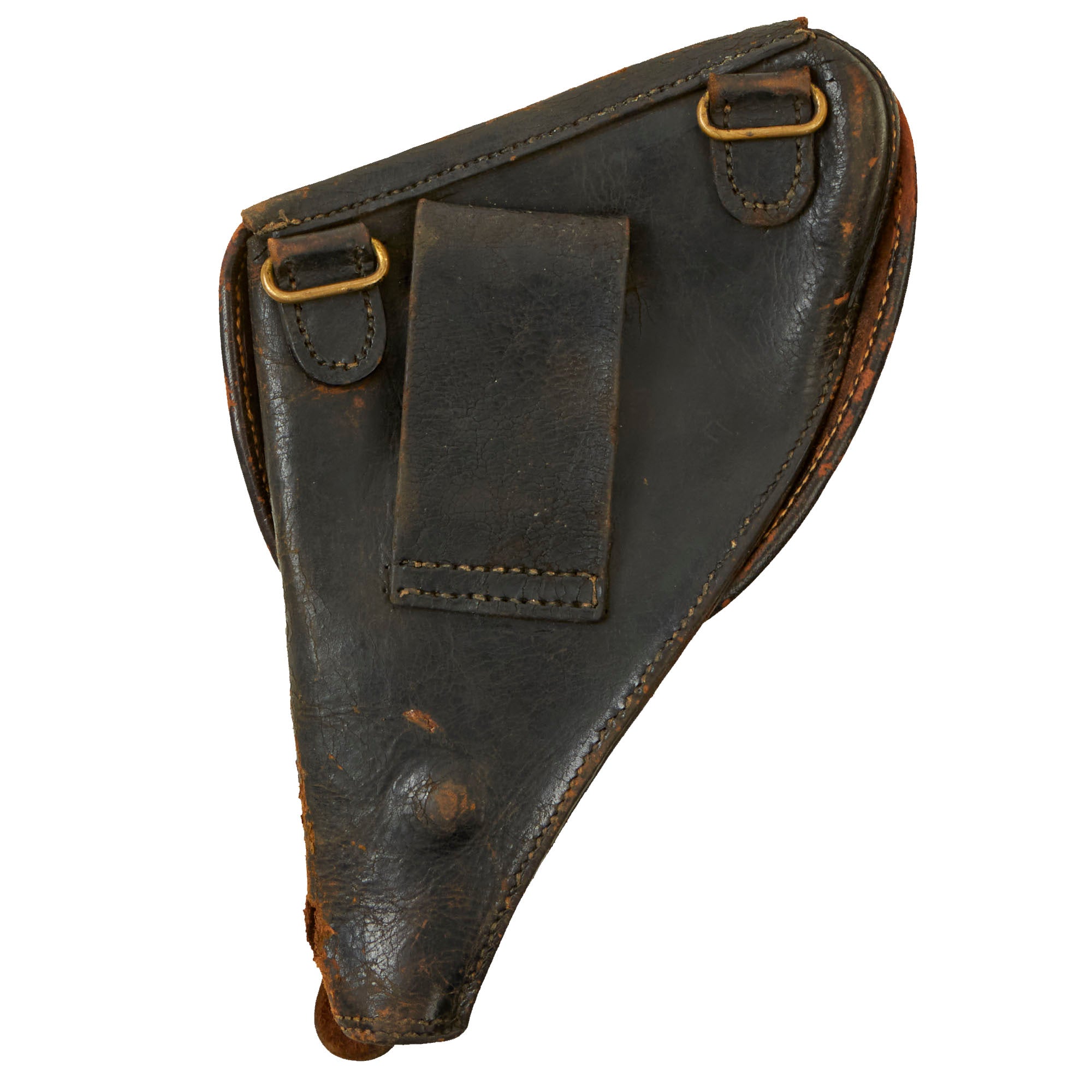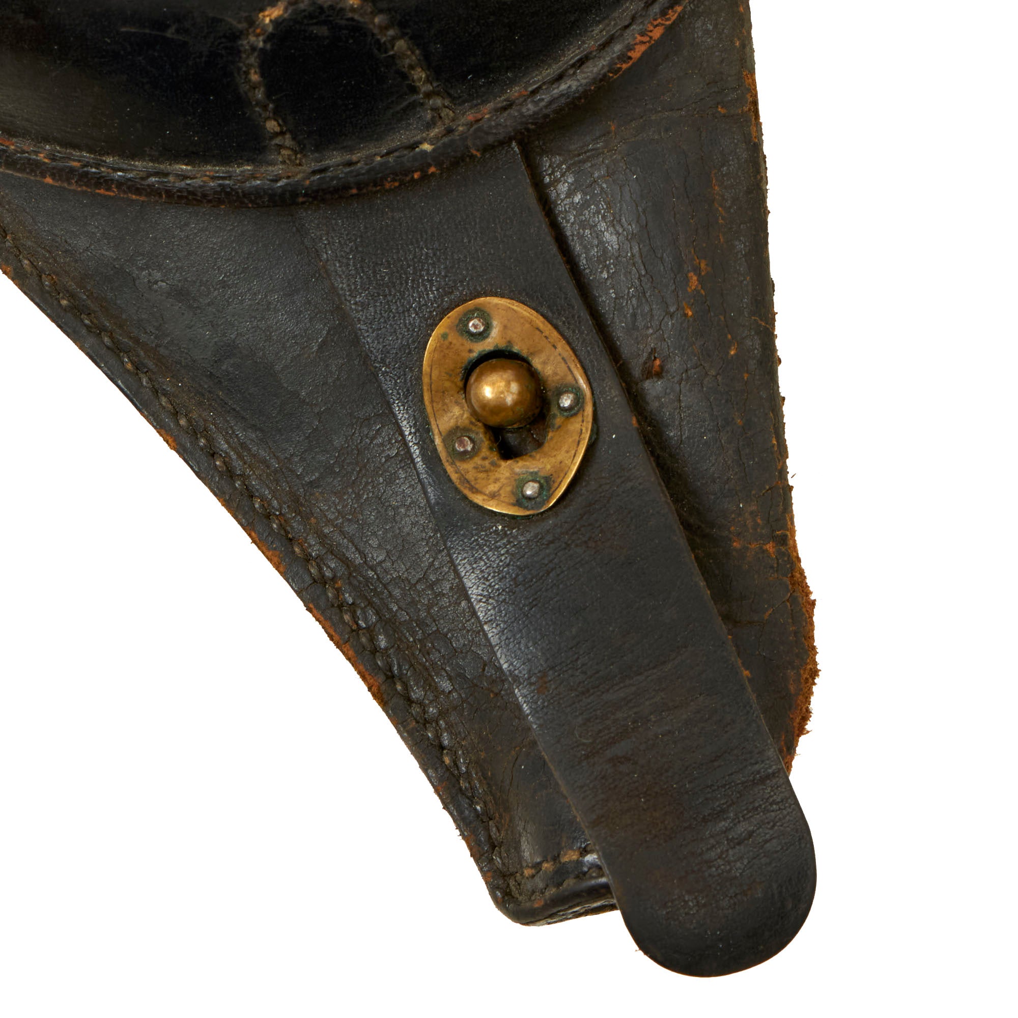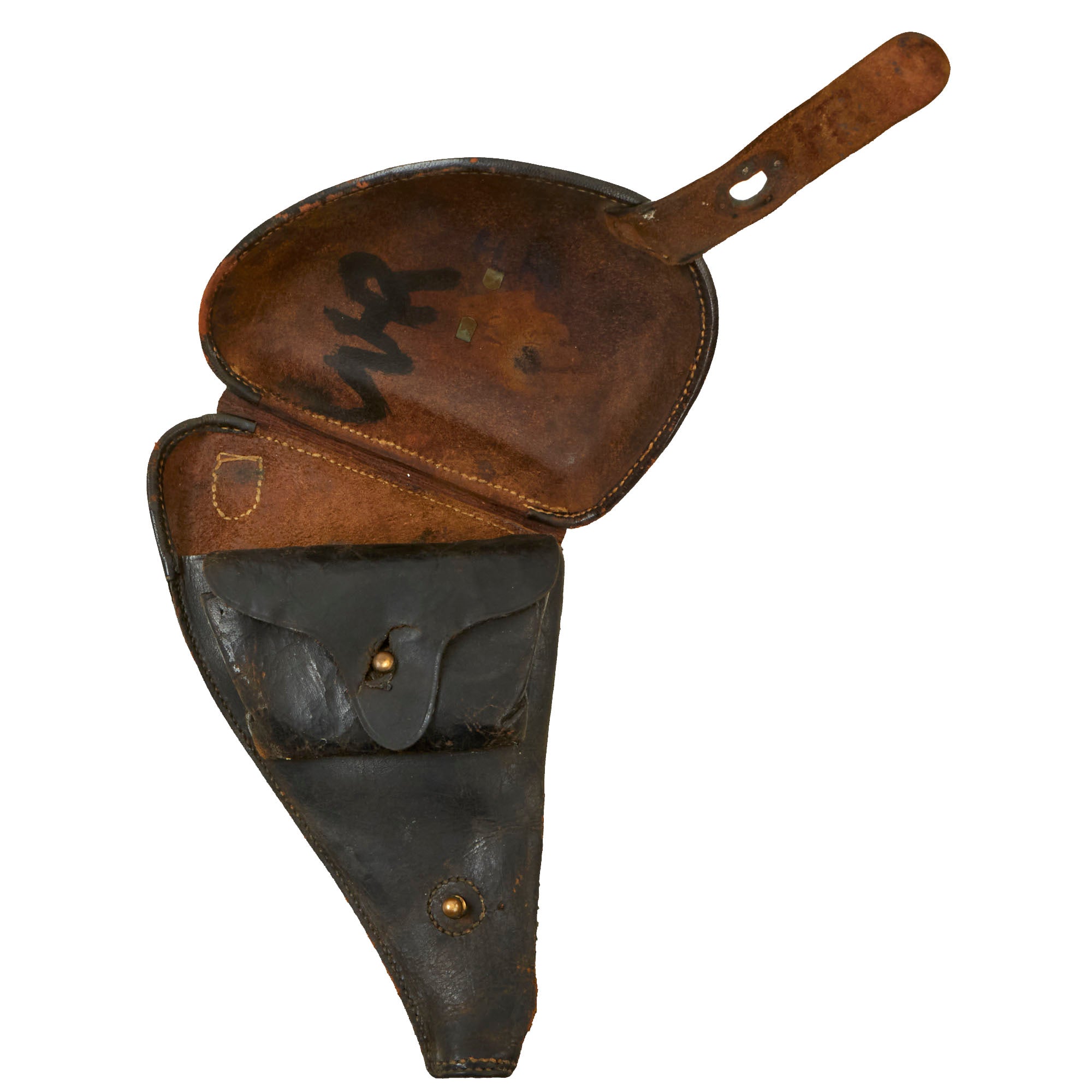 Original Item: Only One Available. This is a nice French WWI Model 1873 Leather Clamshell Revolver Holster. These are getting exceptionally hard to find as of late, and are much more difficult to find than the Model 1892. Many simply have not survived the two world wars, and the following conflicts the French have been involved with in between and beyond. This example was captured by a German soldier who attached the Gott Mit Uns badge from a German belt buckle to the front.