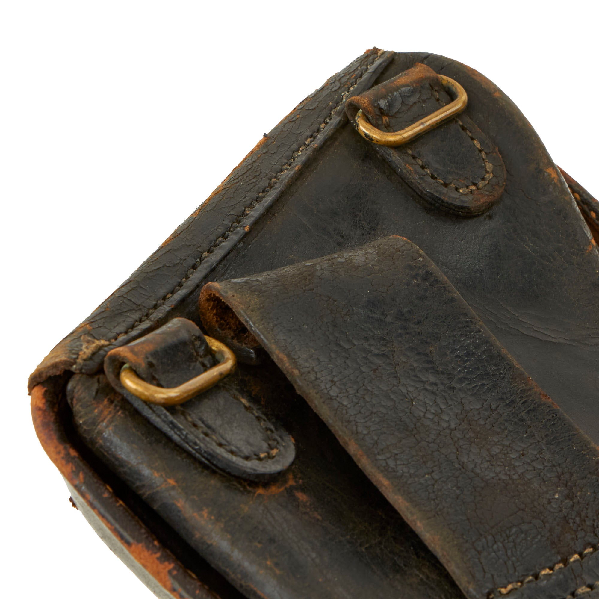 The holster is in good condition for its age. The securing strap is still intact and in fair condition. The holster itself is supple, a bit too supple in the back. The belt loop is intact but is heavily crazing and cracking. Closure holes are intact and not ripped. The internal ammunition pouch is complete with two internal rows of 6 loops to hold rounds. The cover for the pouch is very weak. There is some crazing to the leather and areas of dryness, but overall this is in very good condition considering the age. The leather still retains a pleasing black coloration to the leather.