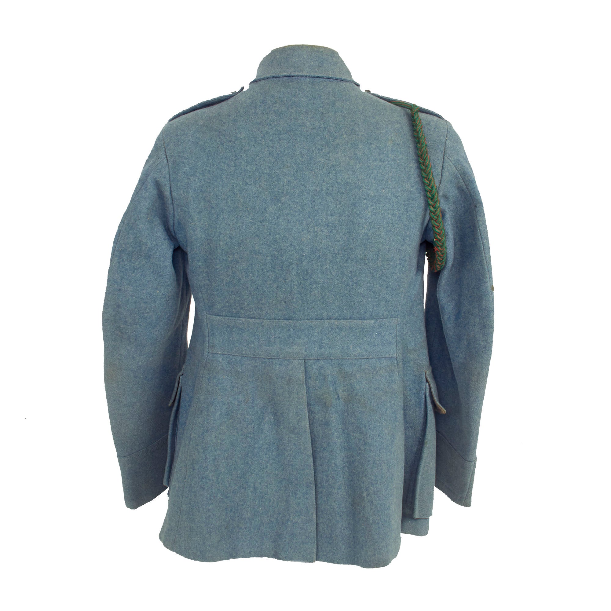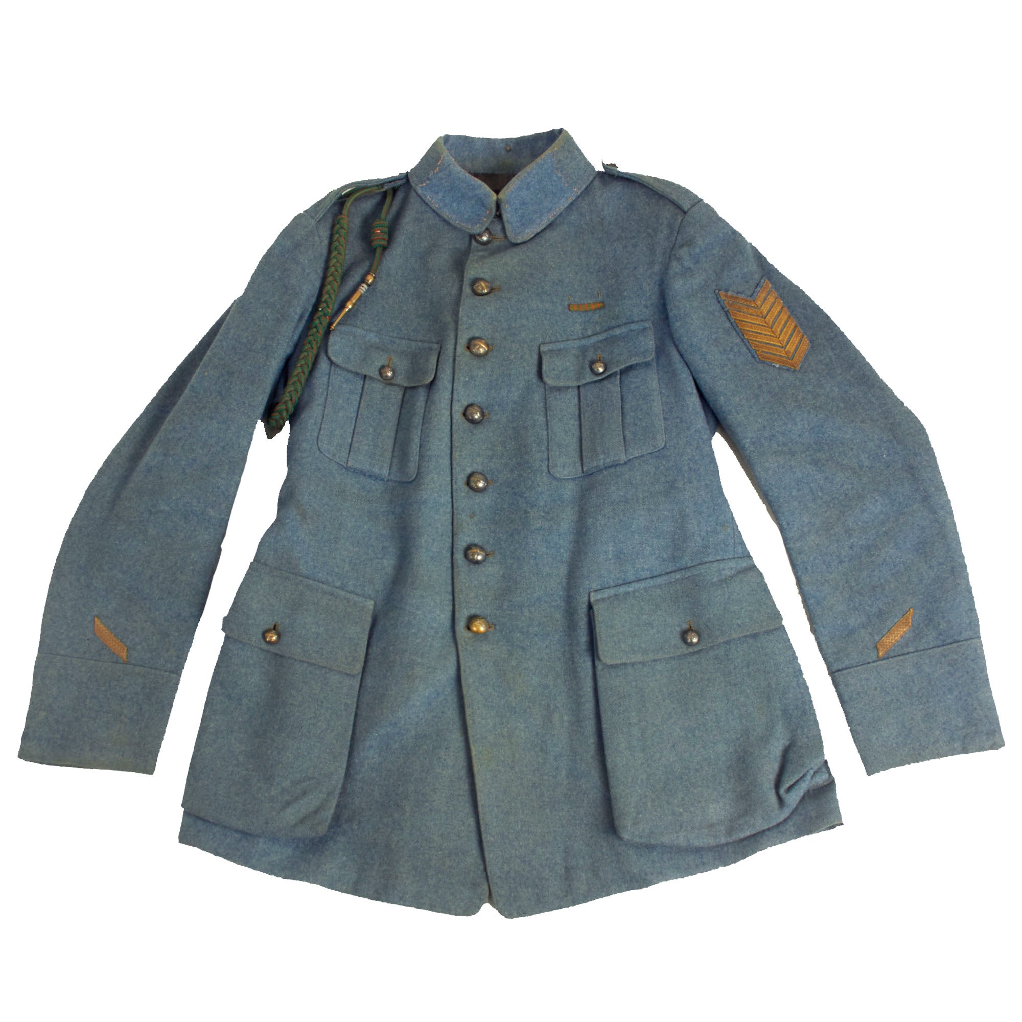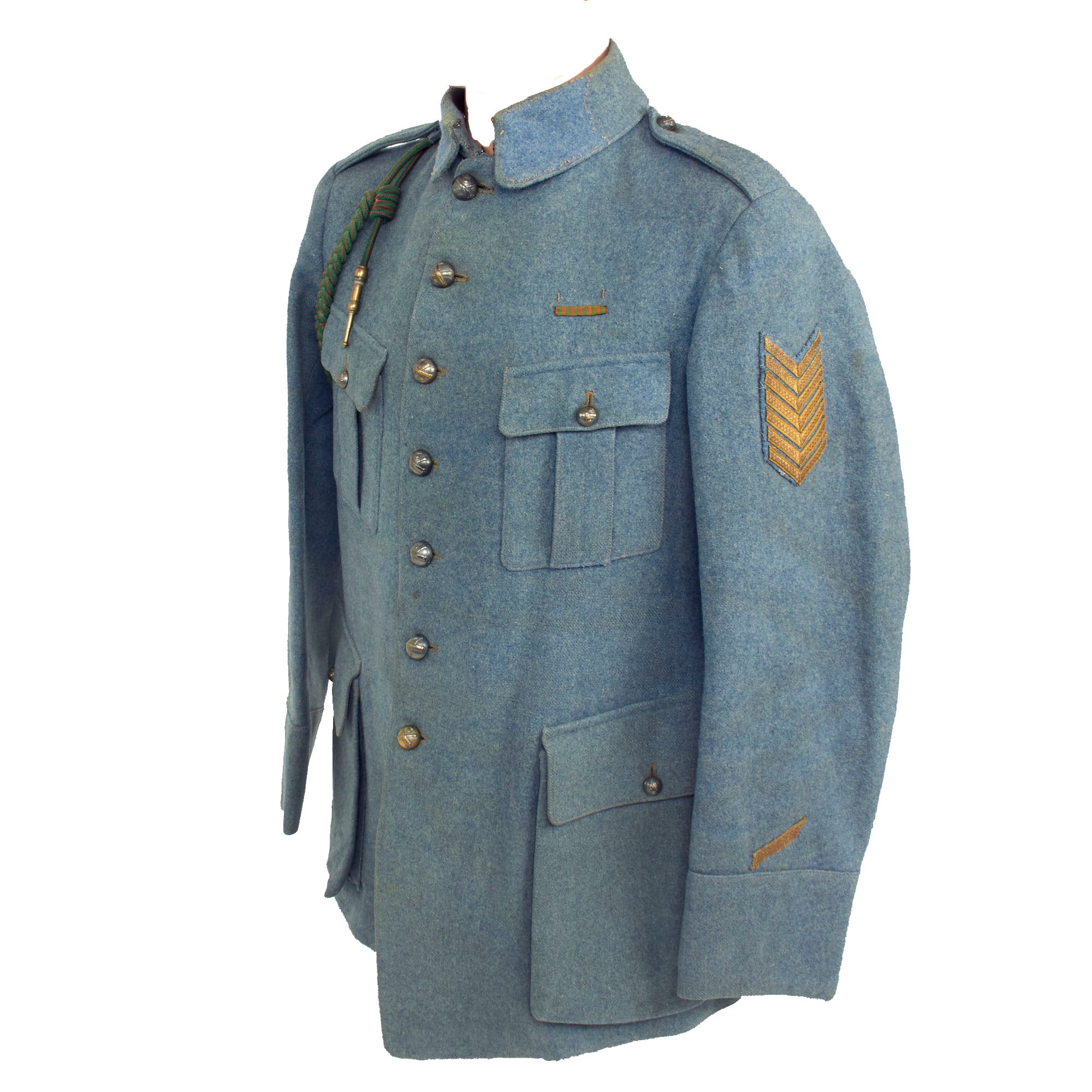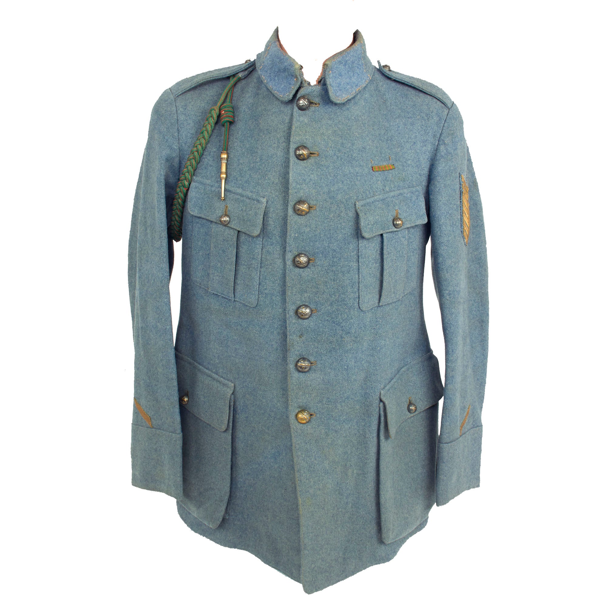 Original Item: Only One Available. Now this is an incredible WWI French service uniform in Horizon Blue. The tunic is one of the best we have seen and is still in the original shade of Horizon Blue (unfaded) as seen in France during WWI. The best features of this uniform are the fact this it still retains a lovely war time fourragère in the colors of the Croix de Guerre, green with red stripes. Another incredible feature is the 7 service chevrons! Each service chevron denotes 6 months of service, meaning he served for nearly 4 years, almost the entire length of the war! This is truly a wonderful example, one that would be very difficult to upgrade from.