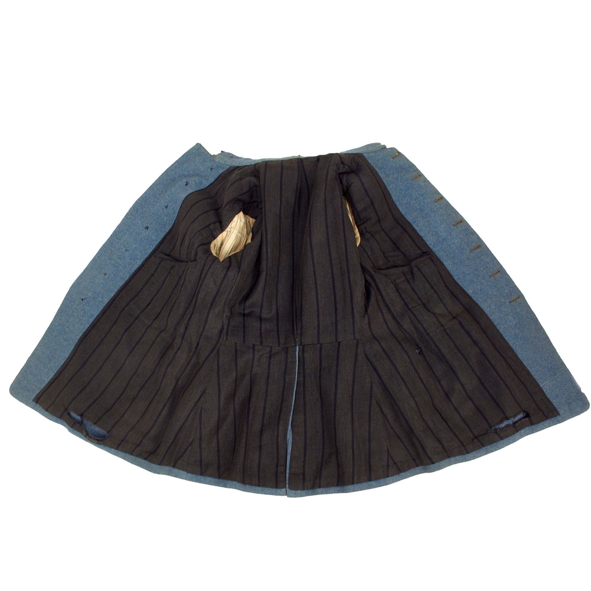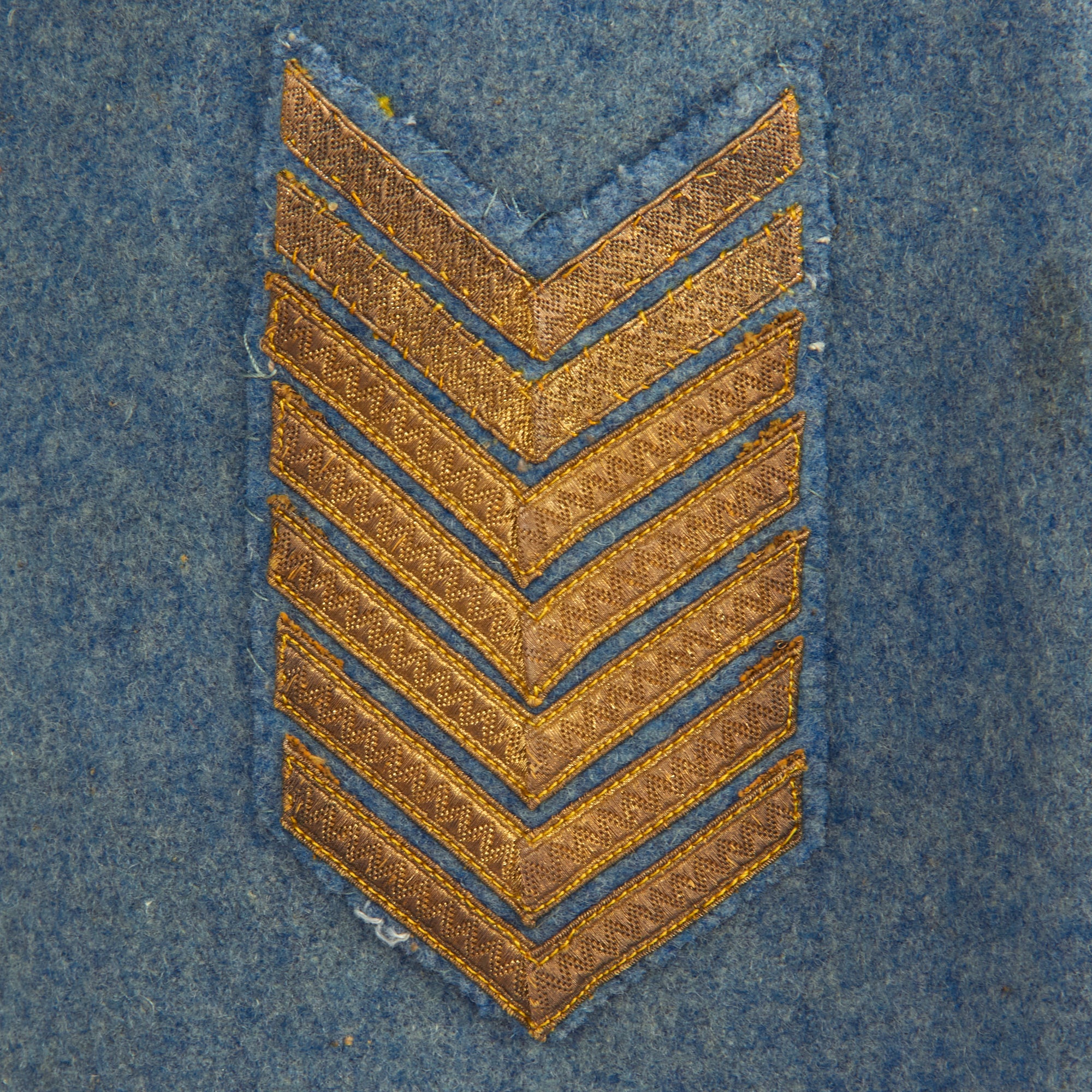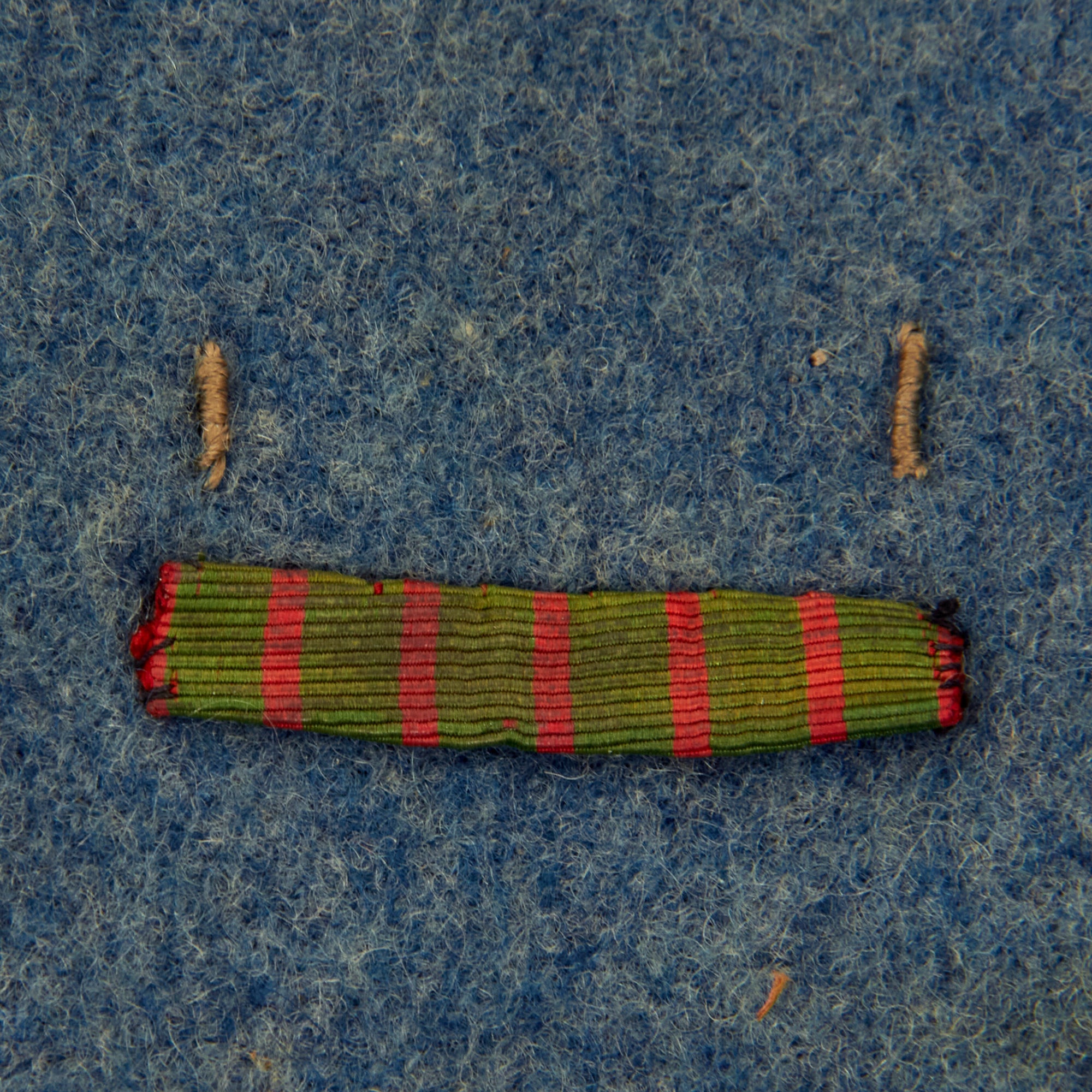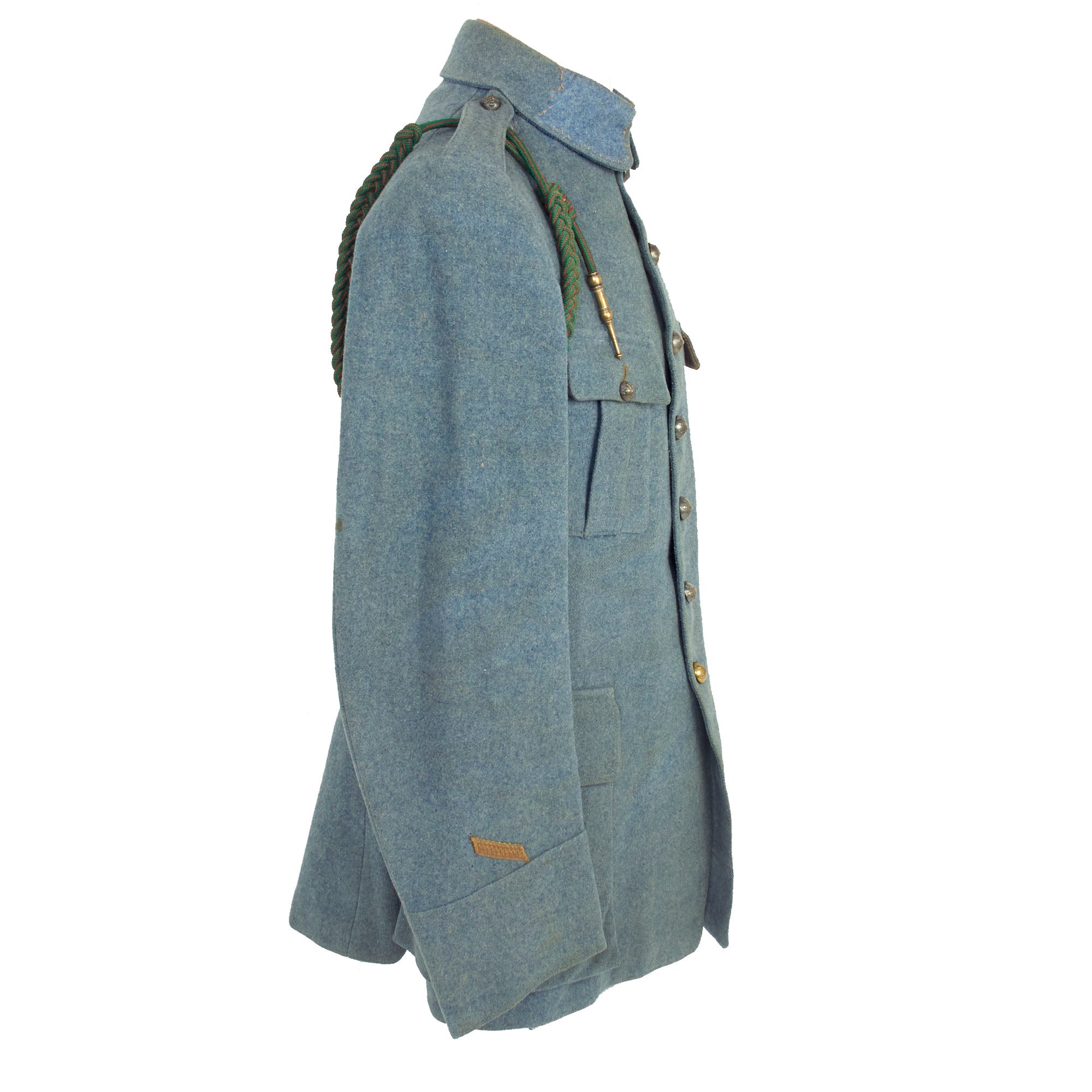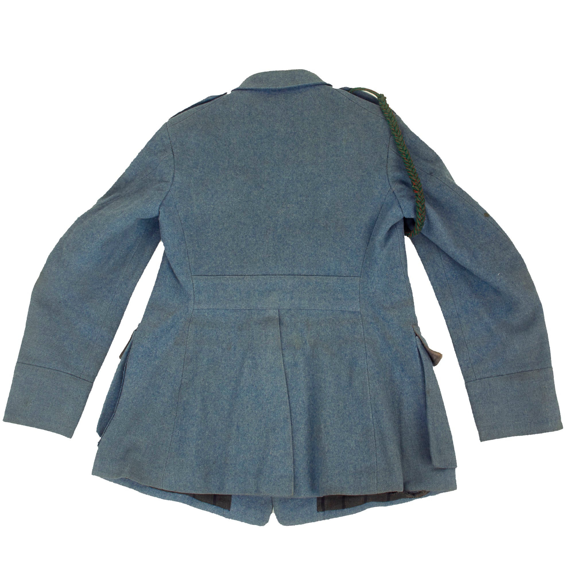 Original Item: Only One Available. Now this is an incredible WWI French service uniform in Horizon Blue. The tunic is one of the best we have seen and is still in the original shade of Horizon Blue (unfaded) as seen in France during WWI. The best features of this uniform are the fact this it still retains a lovely war time fourragère in the colors of the Croix de Guerre, green with red stripes. Another incredible feature is the 7 service chevrons! Each service chevron denotes 6 months of service, meaning he served for nearly 4 years, almost the entire length of the war! This is truly a wonderful example, one that would be very difficult to upgrade from.