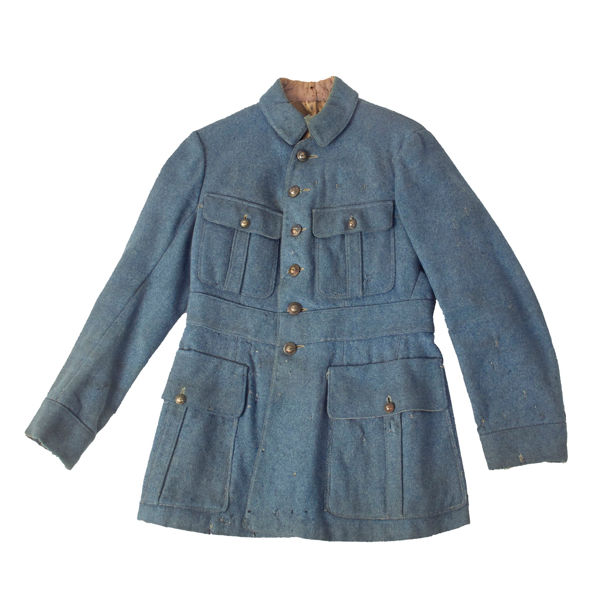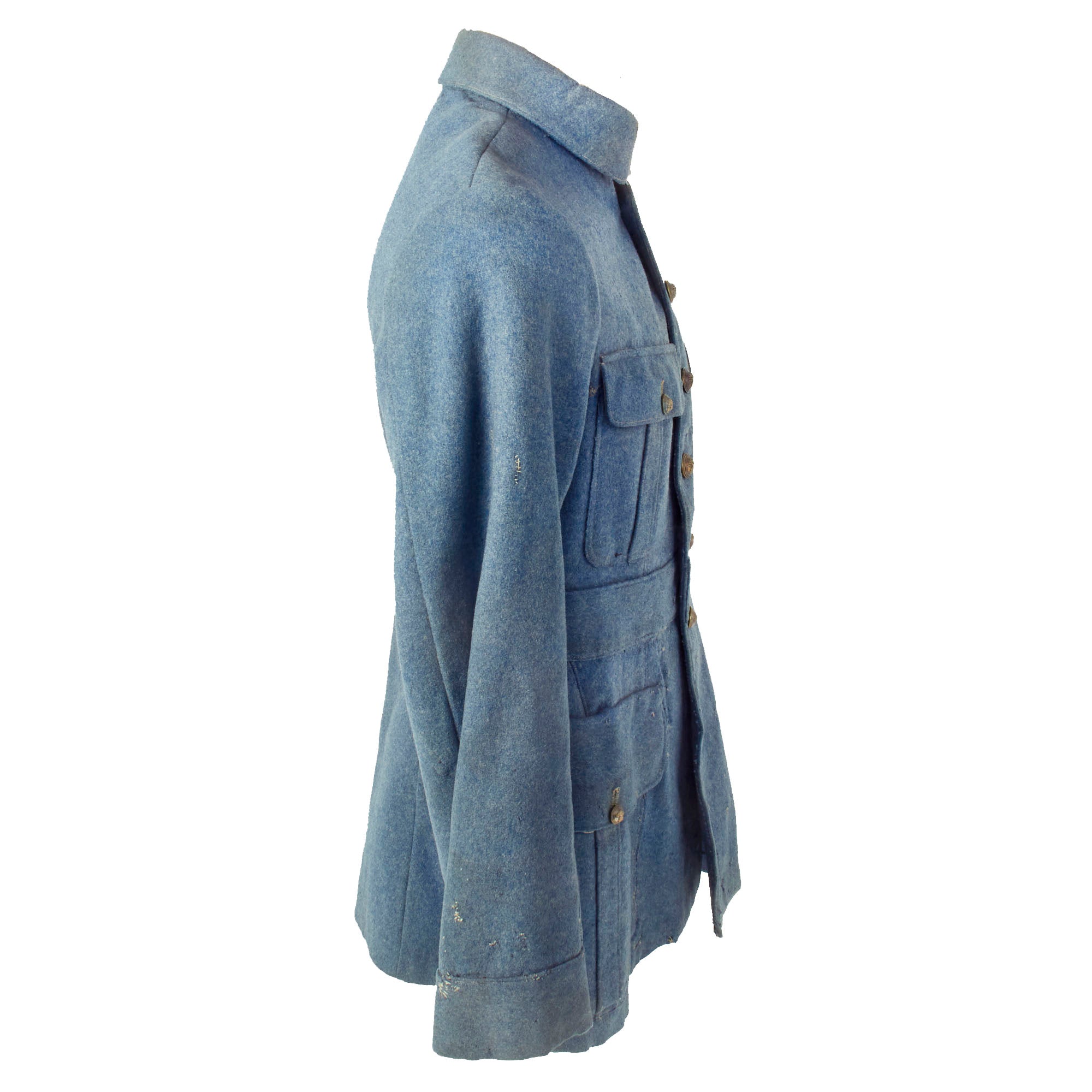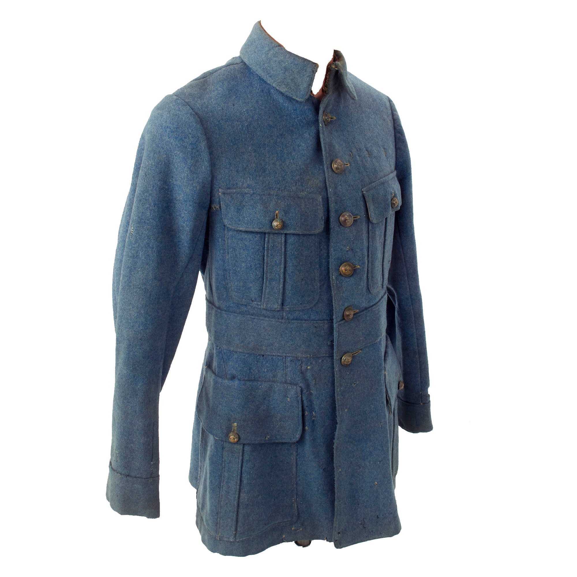 Original Item: Only One Available. This heavy wool tunic is in lovely, field used condition with various field repairs done to it as well as what appears to be possible post war repairs. The buttons still retain their original finish and all appear to be present. The tunic appears as “rough” but you have to keep in mind that the French, as well as the rest of the world, had fought a long and brutish war in their backyards. Resupplies were cut off, ambushed and attacks were always present and they were unable to acquire new items so the soldiers would have to repair and reuse what they already had, and this is a great example of that.