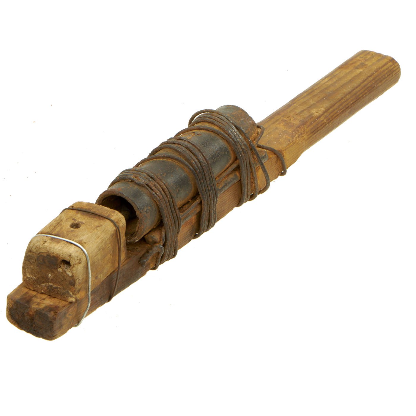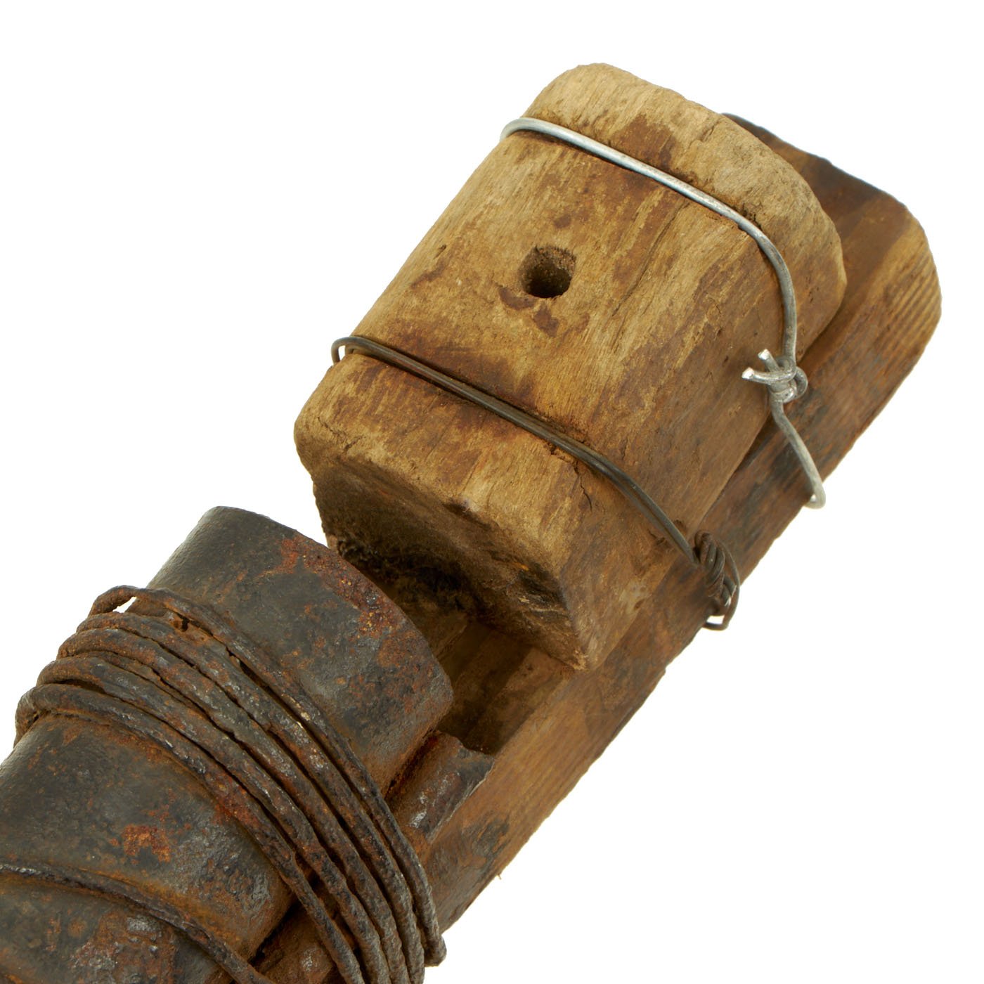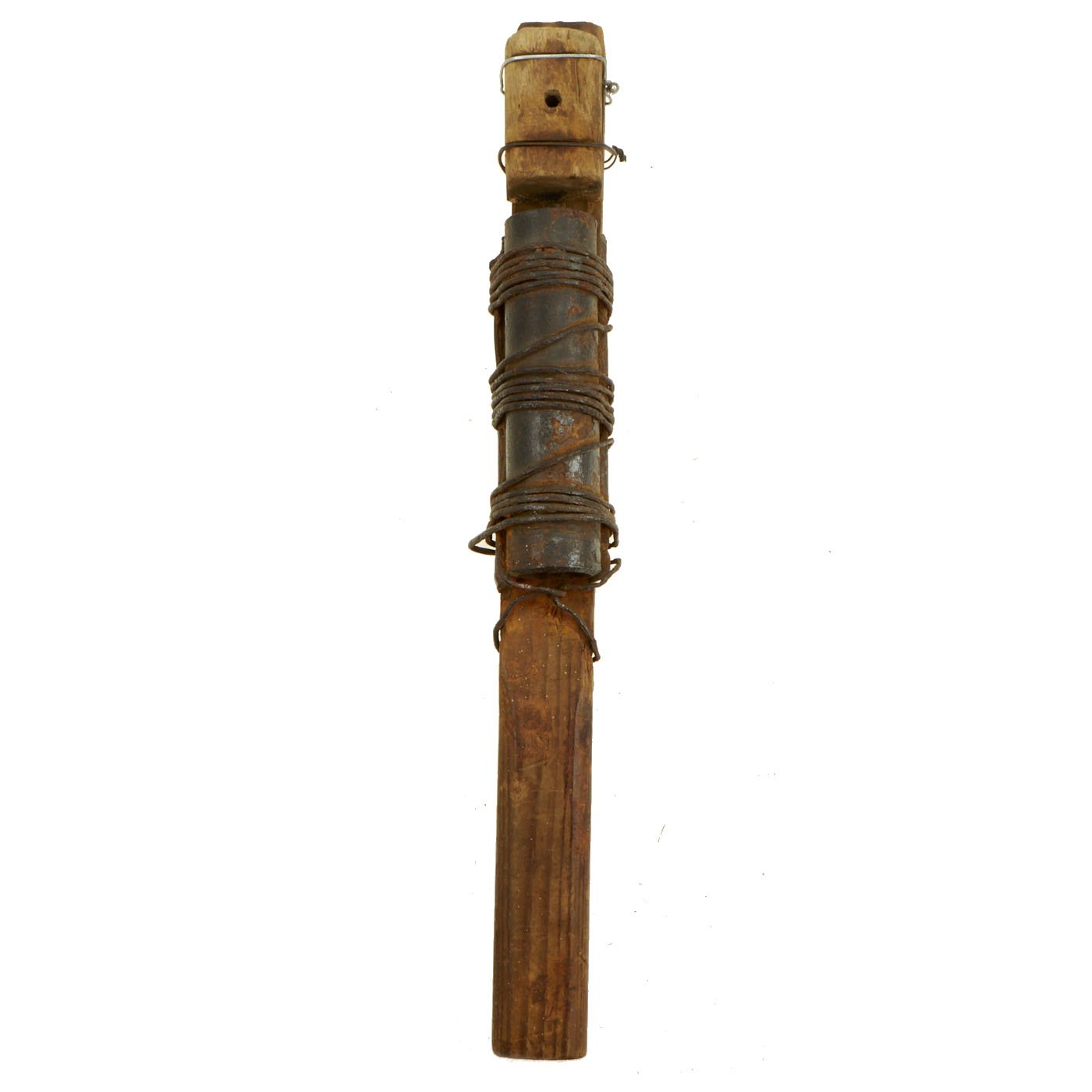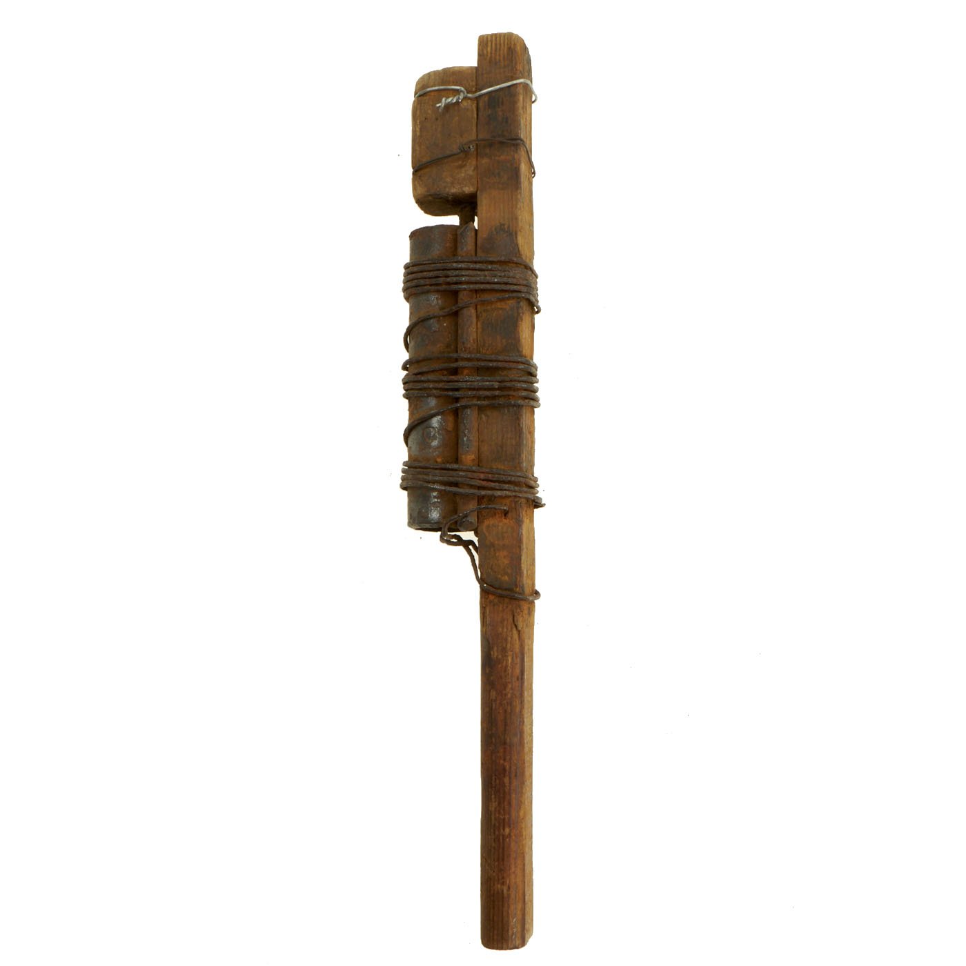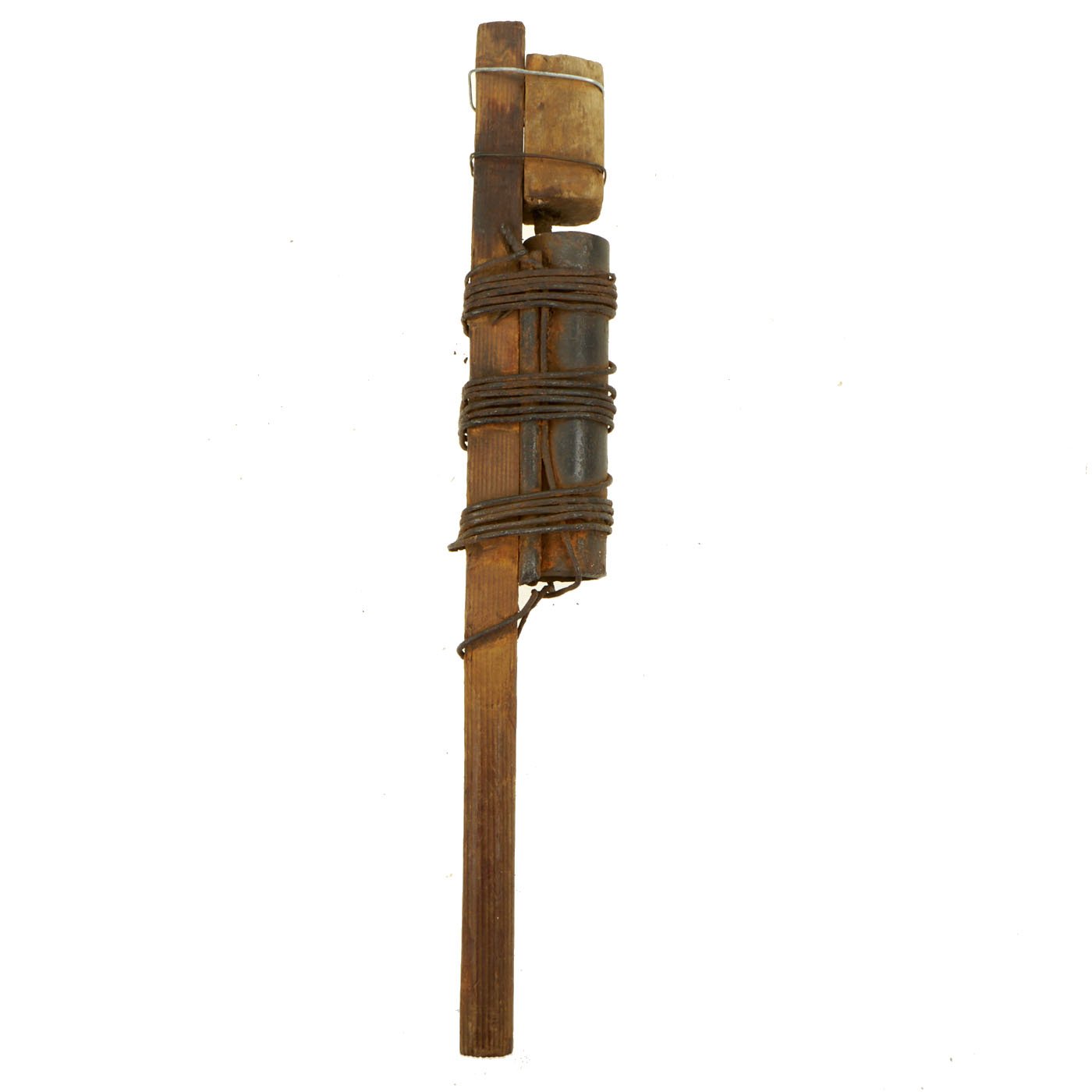 Original Item: Only One Available. This is a very nice French WWI IIIrd Army Stick Grenade (grenade de la troisième armée), which was basically an improvised design developed by factories during the first months of the war. These famous pétards or 'hairbrush grenades' were composed of a wooden paddle, cheddite explosive charge, and an explosive housing, often filled with nails or gravel. The design was made necessary by the low capacity of the French military armories to develop and manufacture more modern models of grenades rapidly enough to meet front line demand.